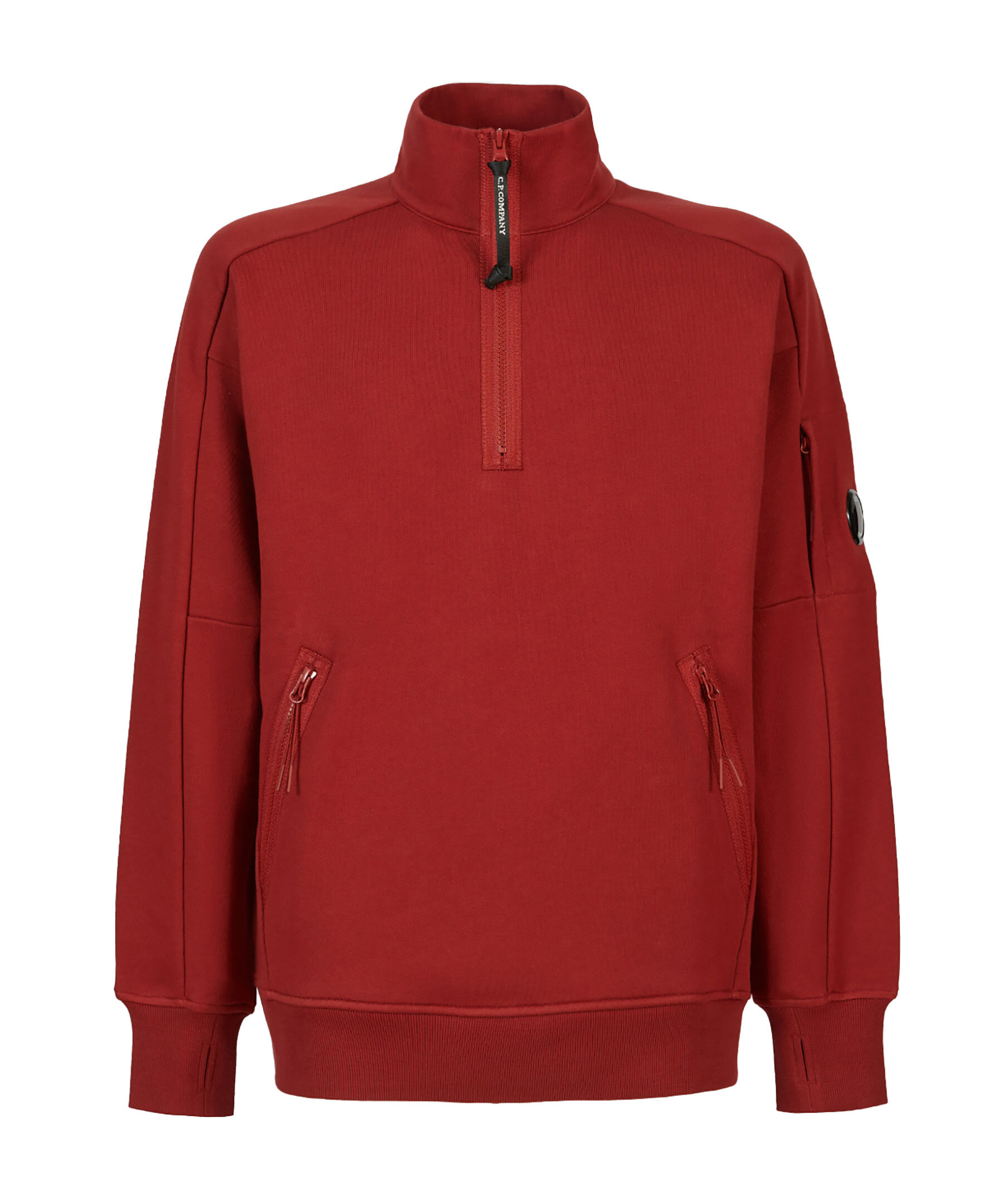 Röd tröja med half zip up och stativkrage från C.P Company. Ribbad fåll och ärmslut, två snedställda framfickor med dragkedja samt ficka med dragkedja på vänster arm och C.P bricka med logotyp. Tillverkad i diagonalt upphöjd fleece, ett mellanviktsalternativ i bomull med loopback som kombinerar absolut komfort med en rejäl och slitstark känsla. OBS! Brickan är avtagbar och ska tas av vid tvätt.