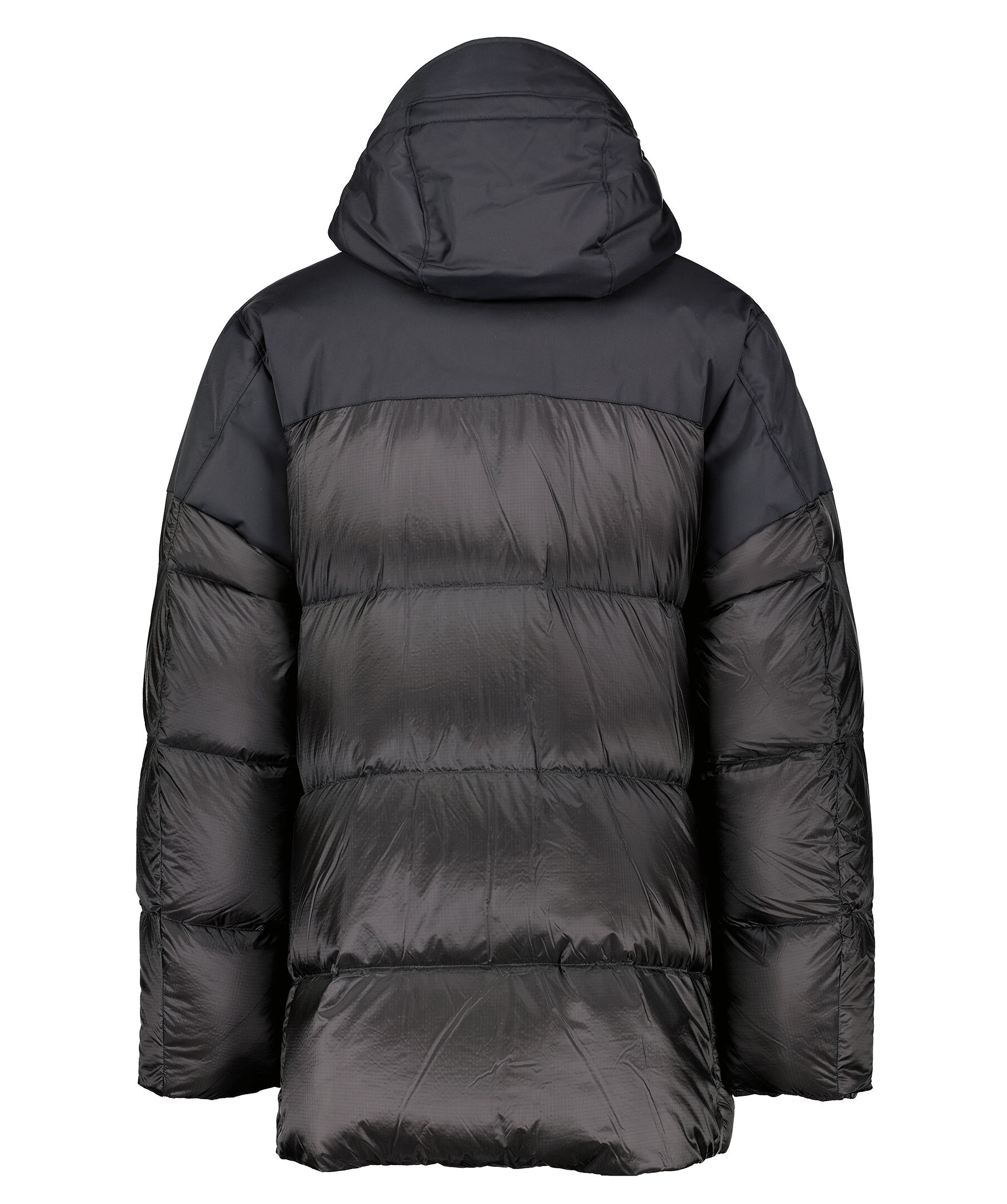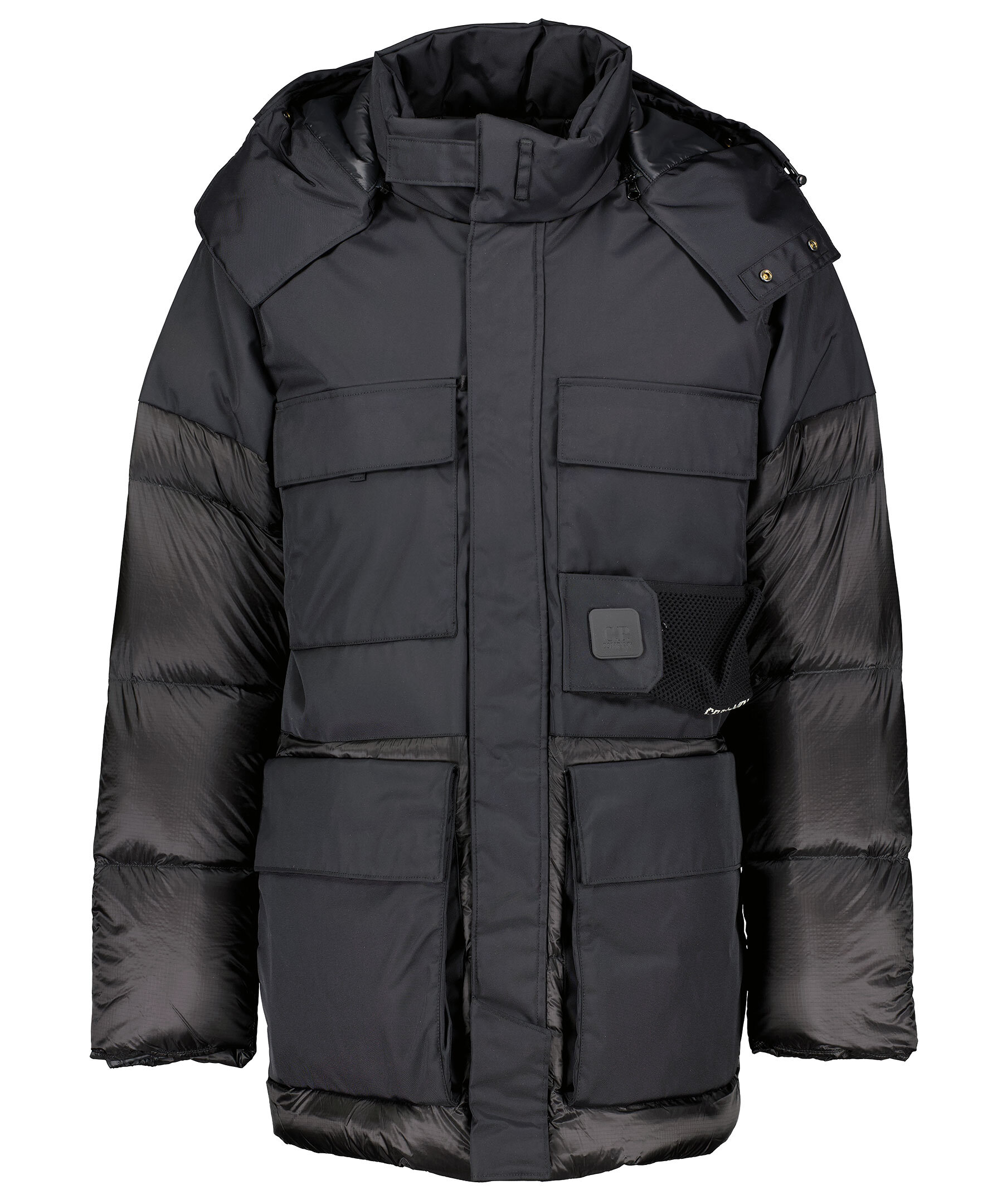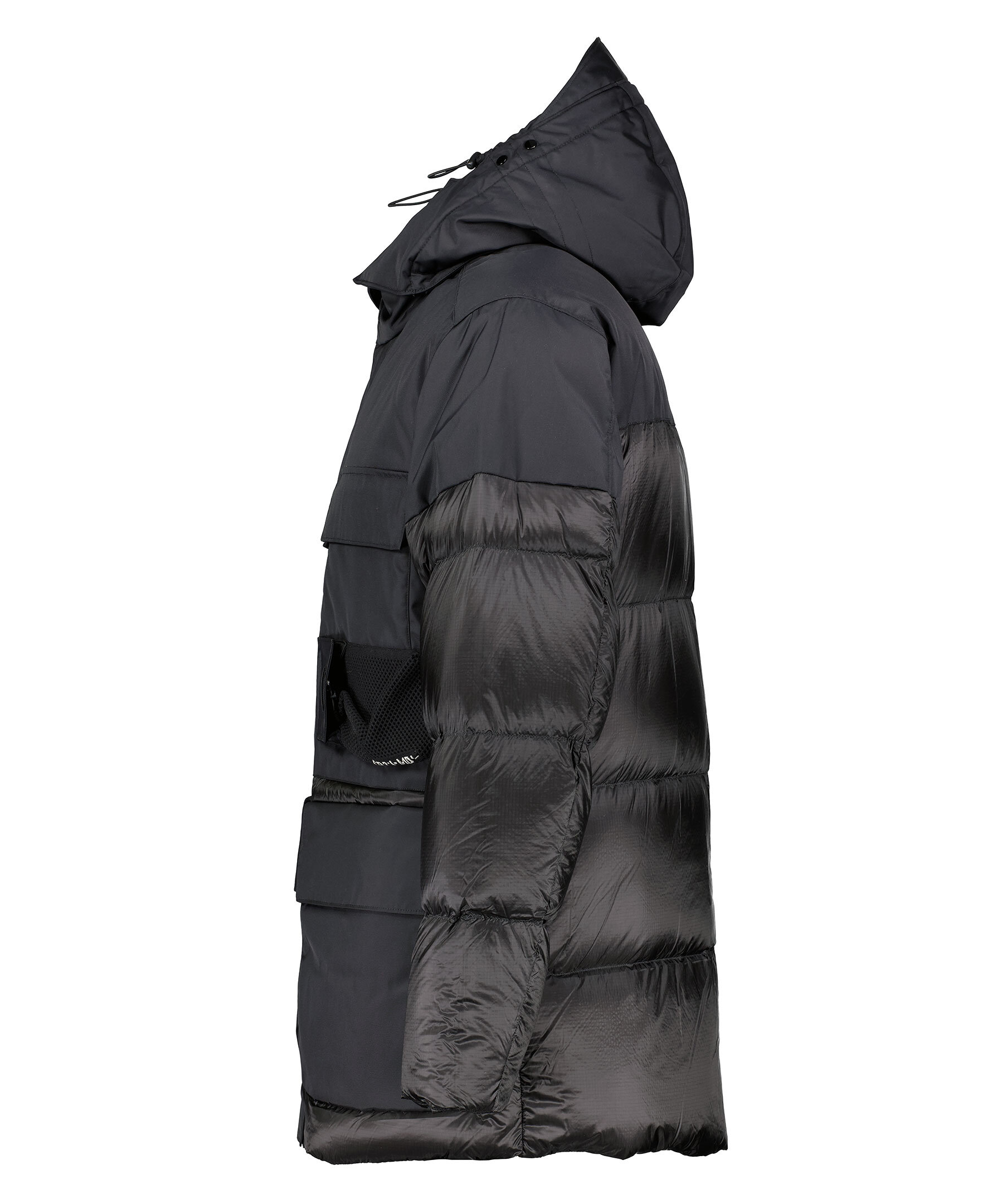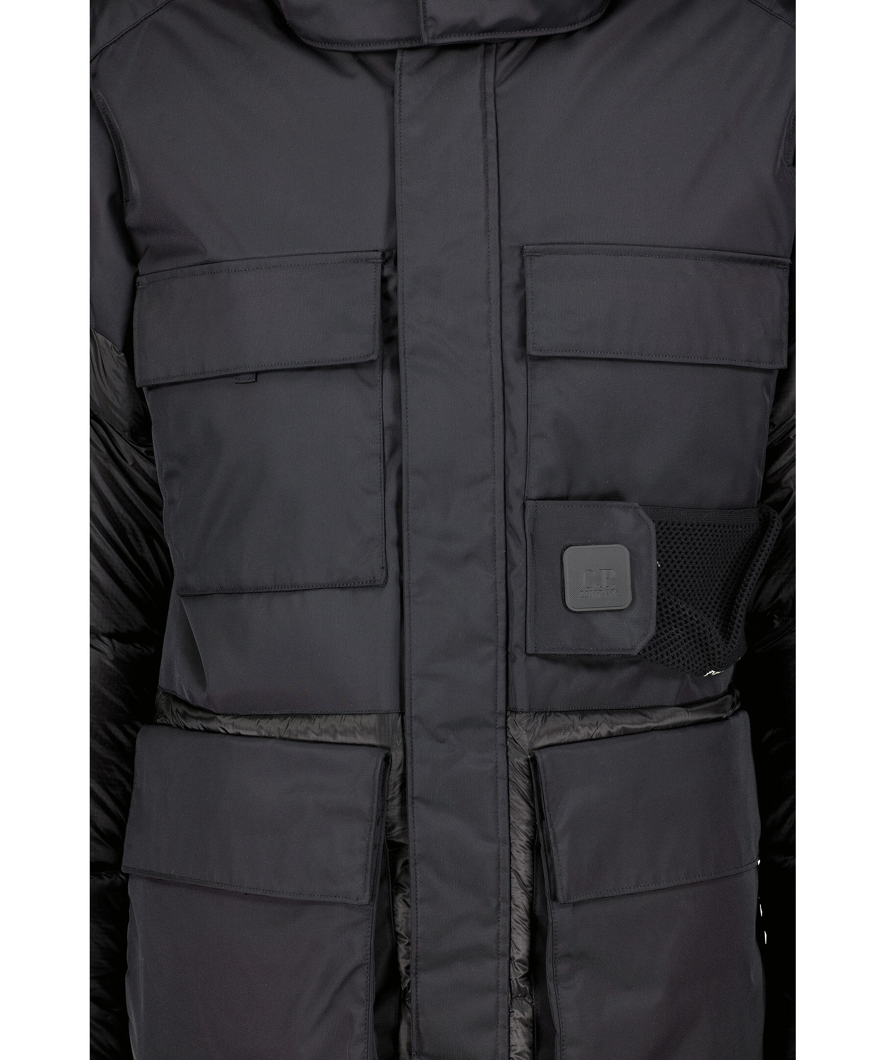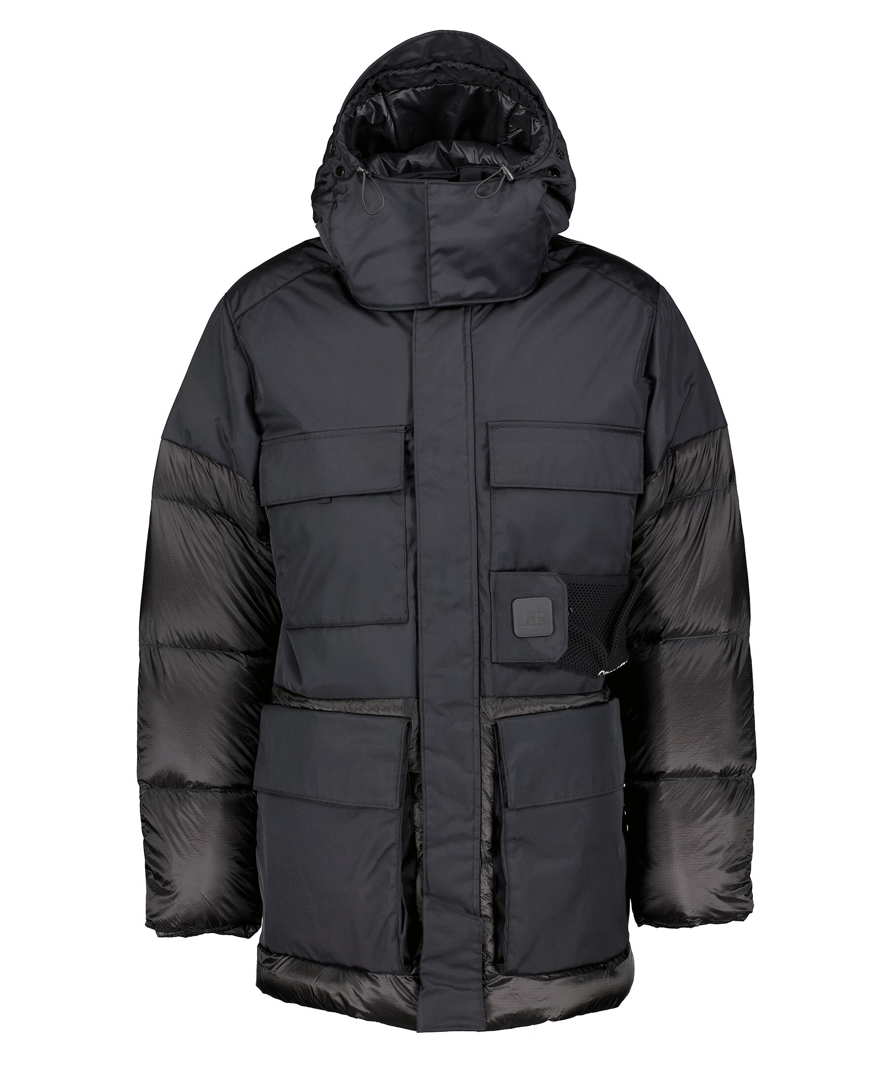 Svart dunjacka från C.P Company. Paneler i vävt material. Stängs framtill med tvåvägsdragkedja och tryckknappar. Fyra fickor framtill som stängs med lock och tryckknappar, Ficka i meshmaterial som stängs med lock och dragsko. Resår vid ärmslut. Avtagbar luva med dragsko.