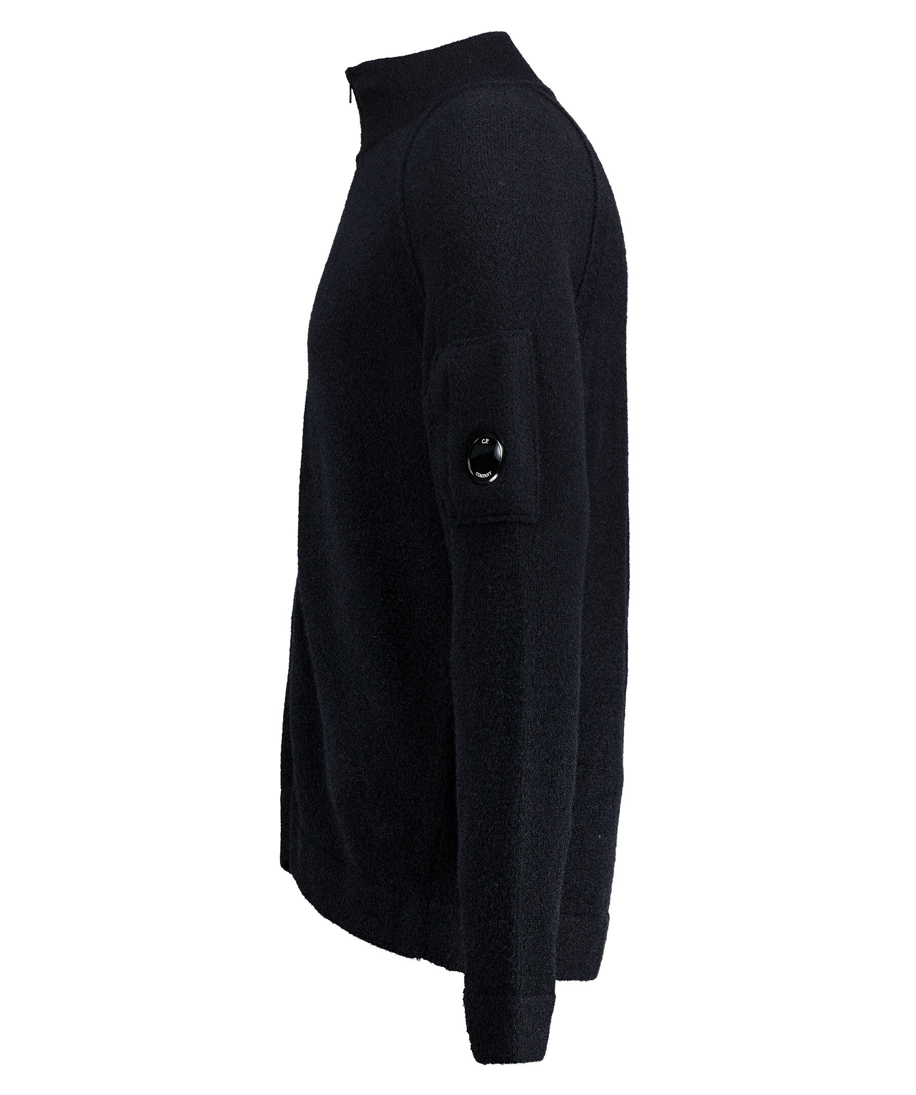 Svart stickad tröja från C.P Company. Stängs framtill med tvåvägsdragkedja. Ficka på vänster ärm som stängs med dragkedja bricka i plast med logotyp. Stickad mudd vid ärm- och plaggslut. Tillverkad i ullblandning. OBS! Brickan är avtagbar och ska tas av vid tvätt.