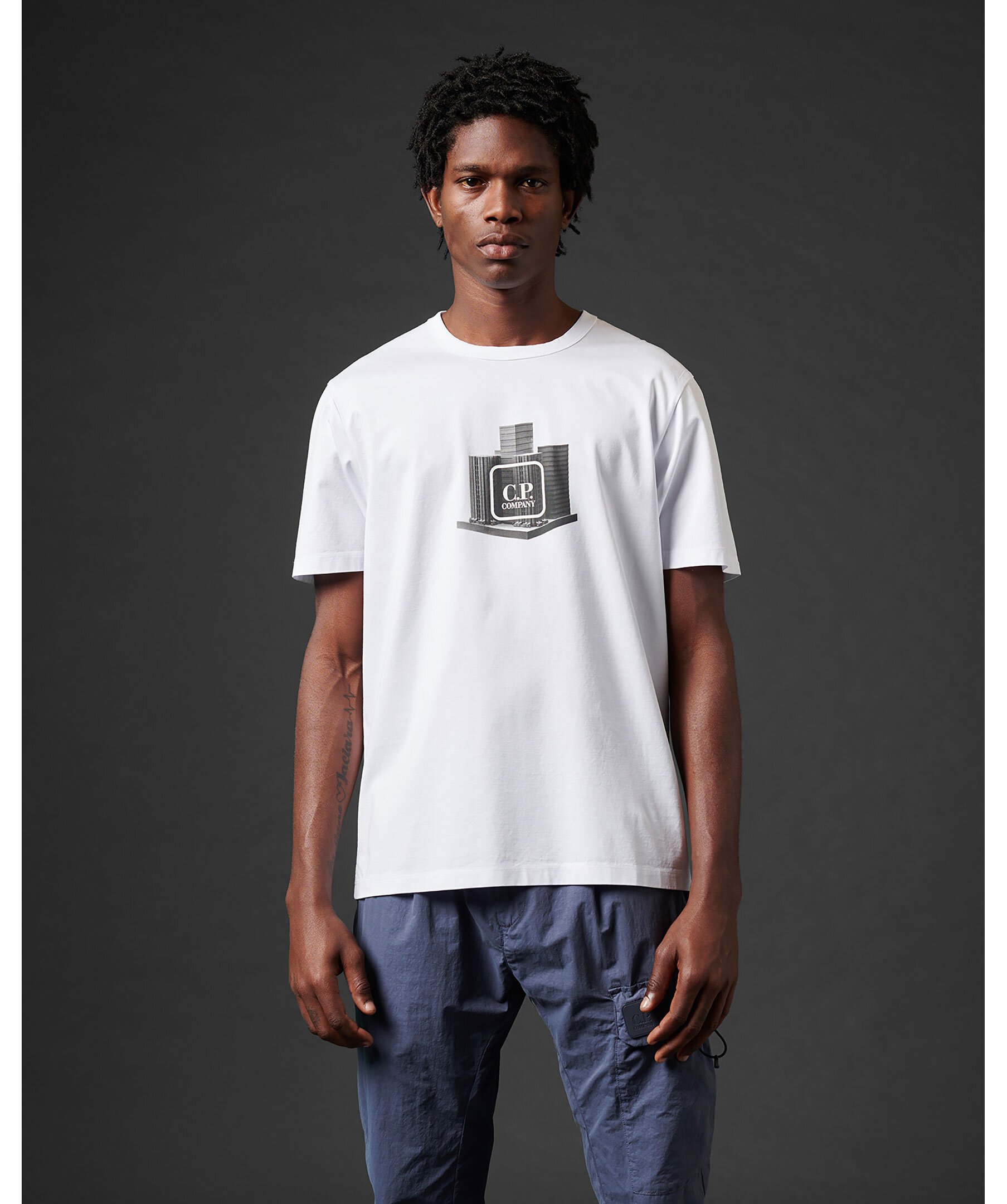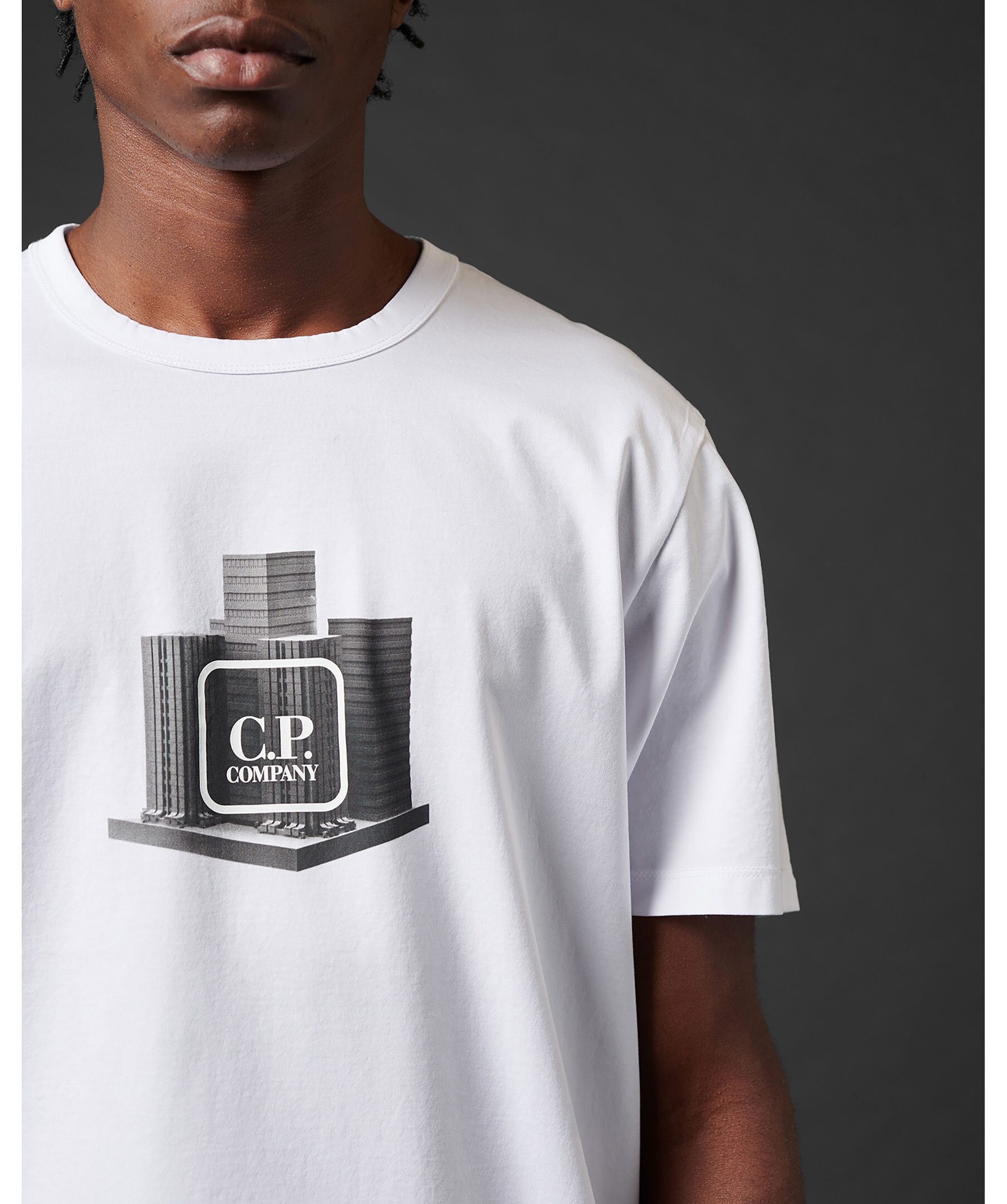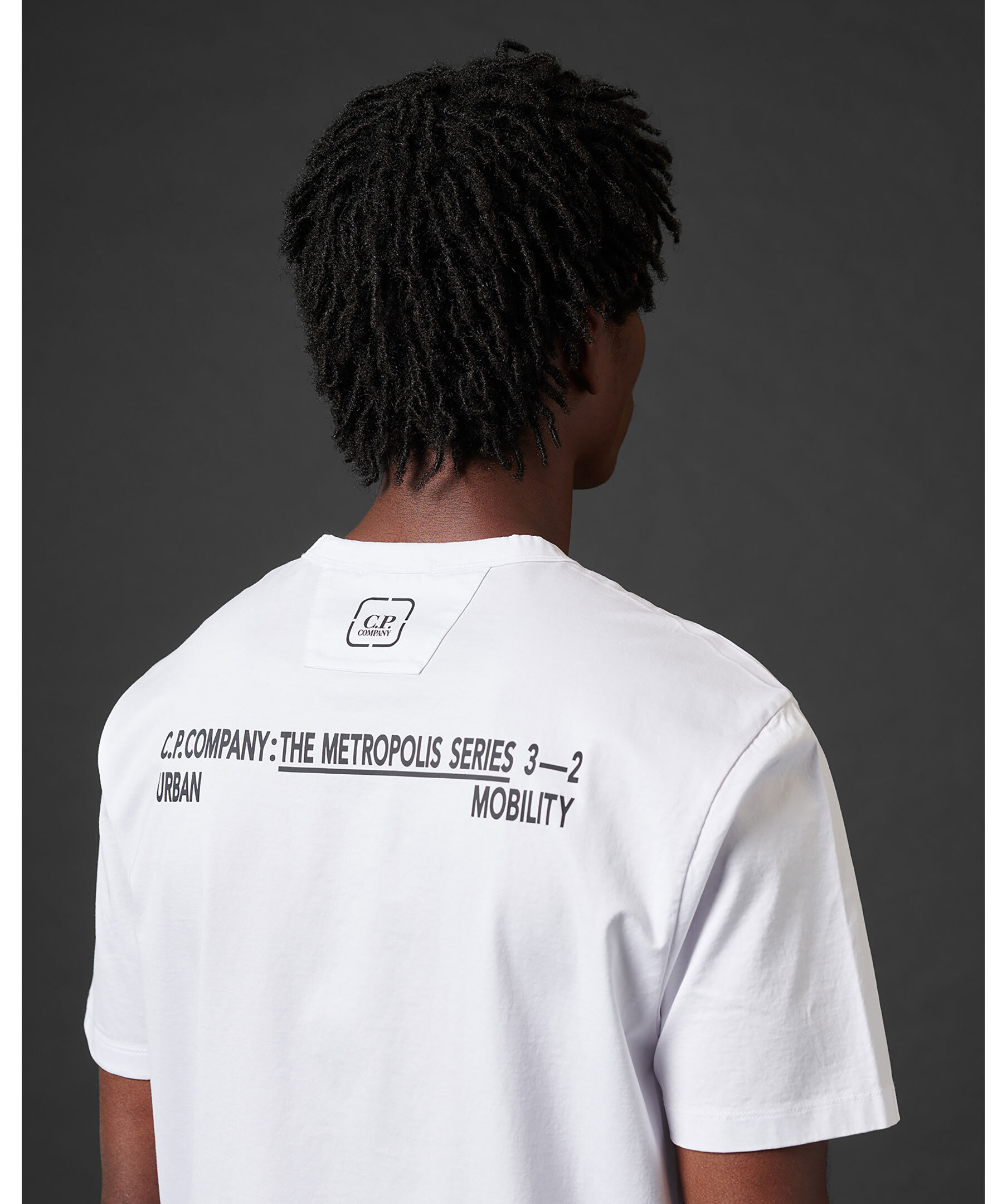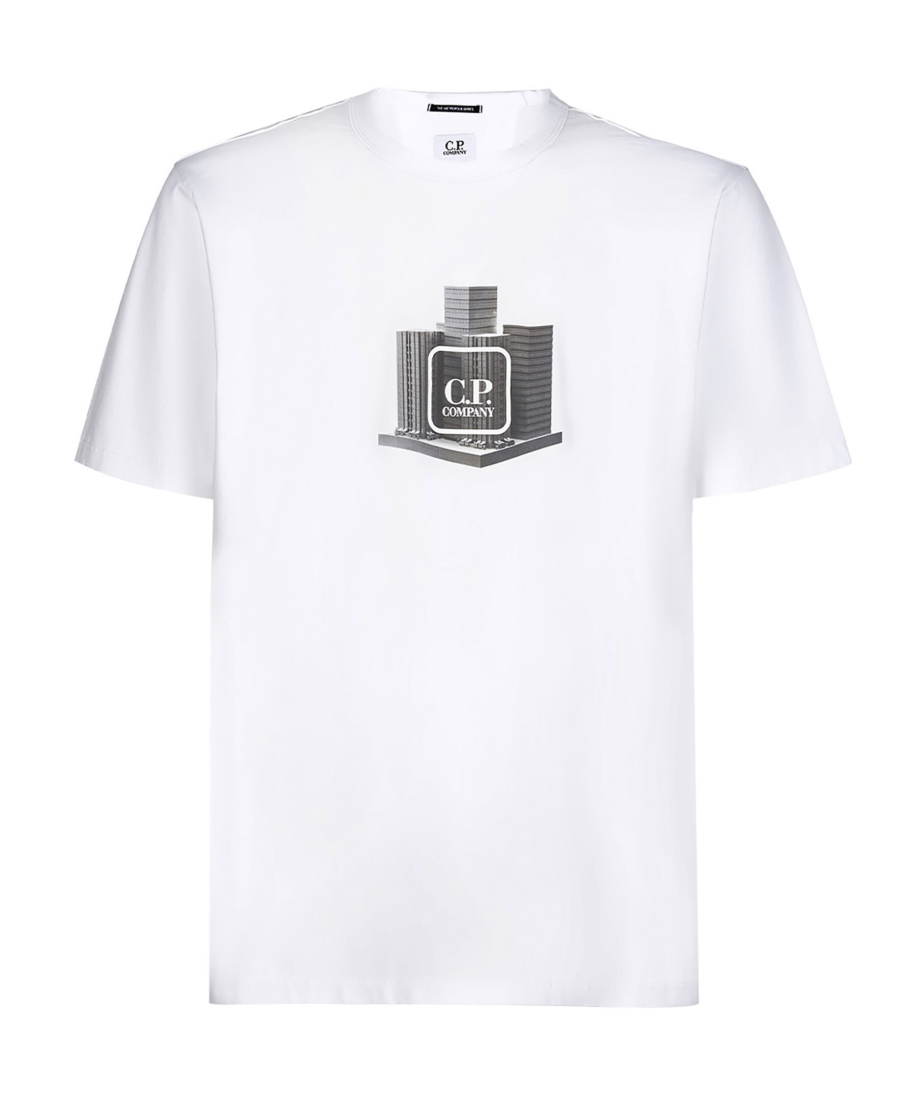 Vit t-shirt från C.P Company. Rundad halsringning, grafiskt tryck över bröstet i svart, svart text på ryggen och logotyp i nacken. Tillverkad i 100% bomull.