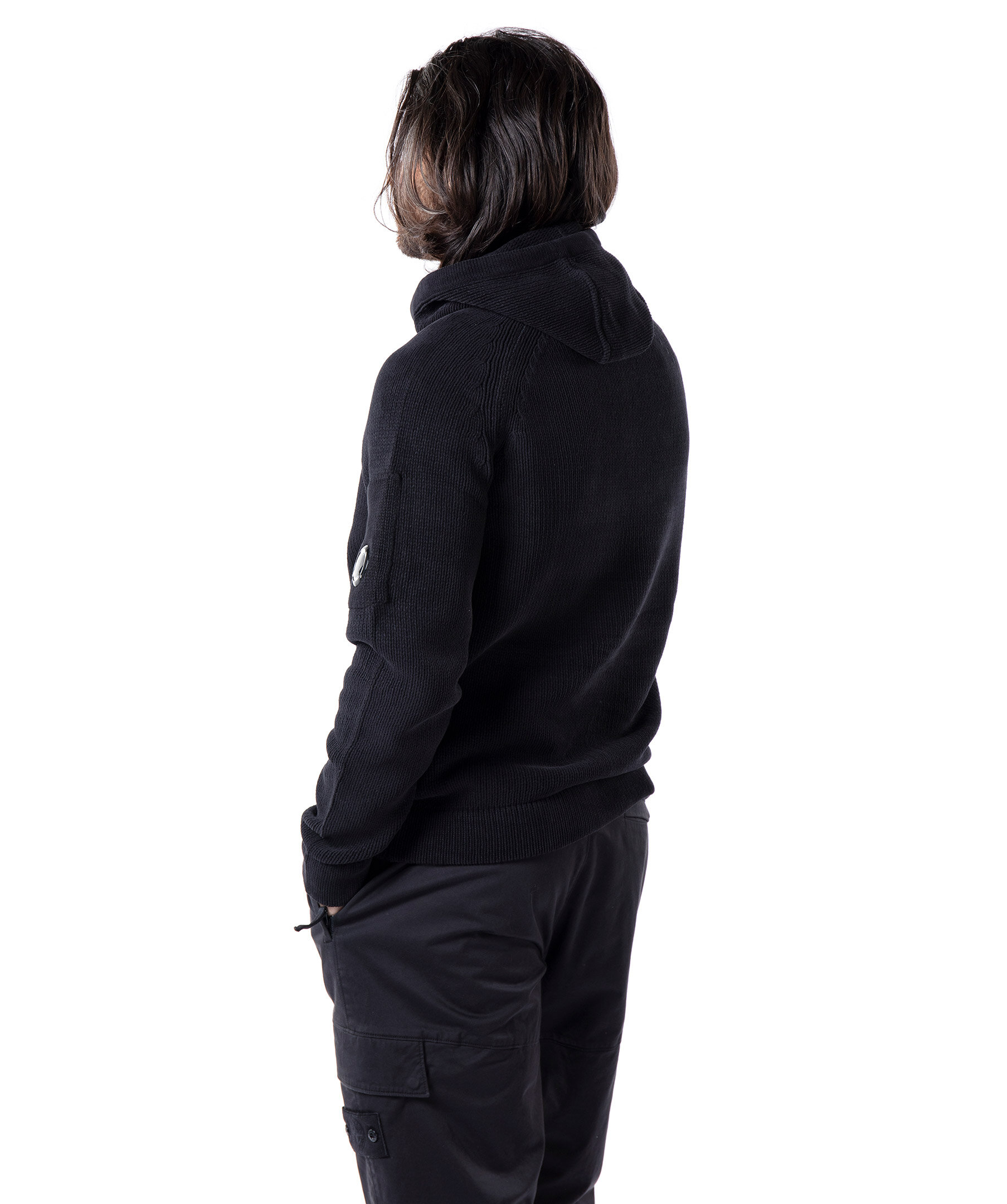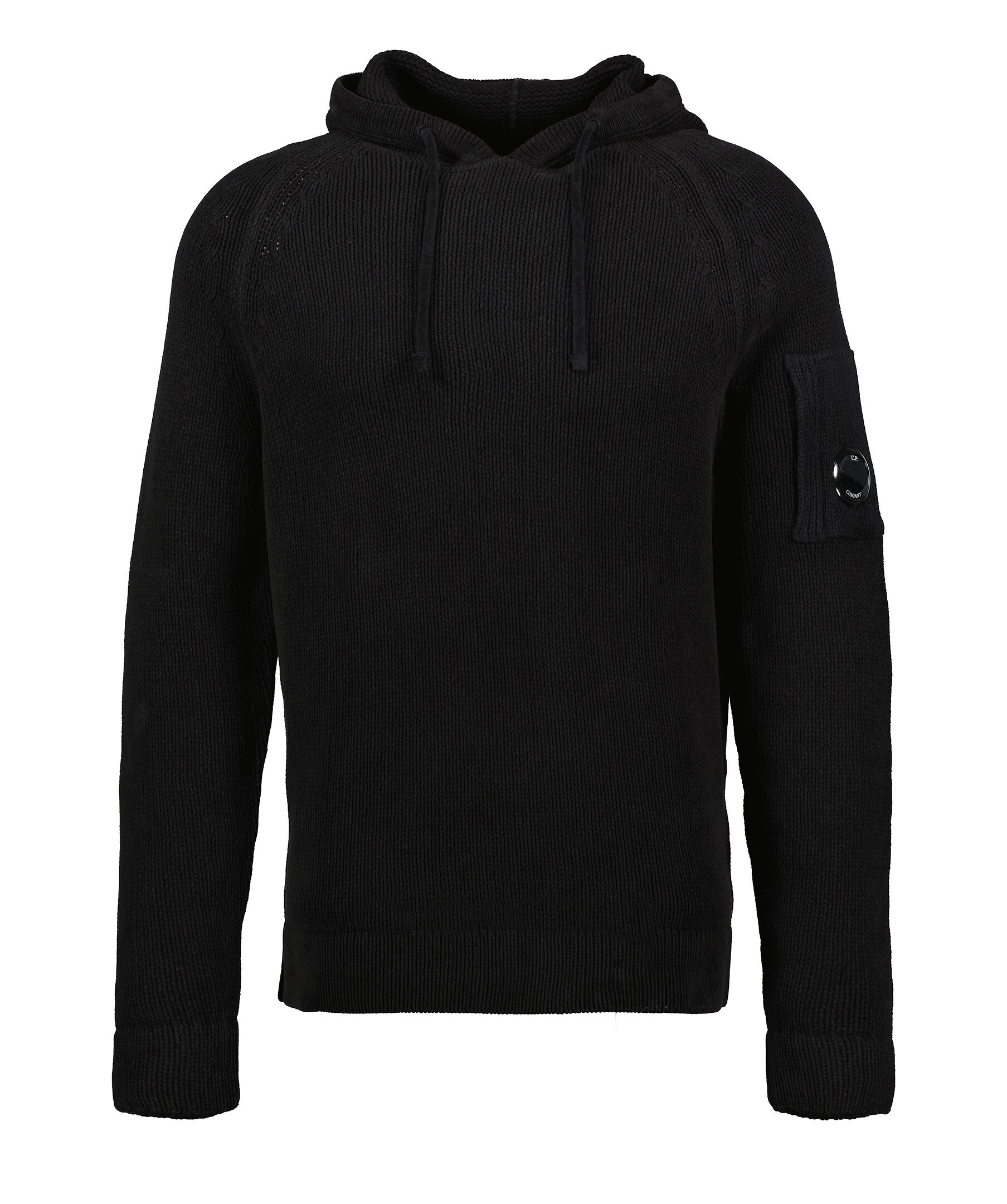 Svart, stickad hoodie från C.P Company. Huva med svarta knytband, ficka med logotyp på vänster ärm. Ribbstickade muddar i ärm- och plaggslut. Tillverkad i 100% Bomull. Modellen är 185 cm lång och bär storlek 50.