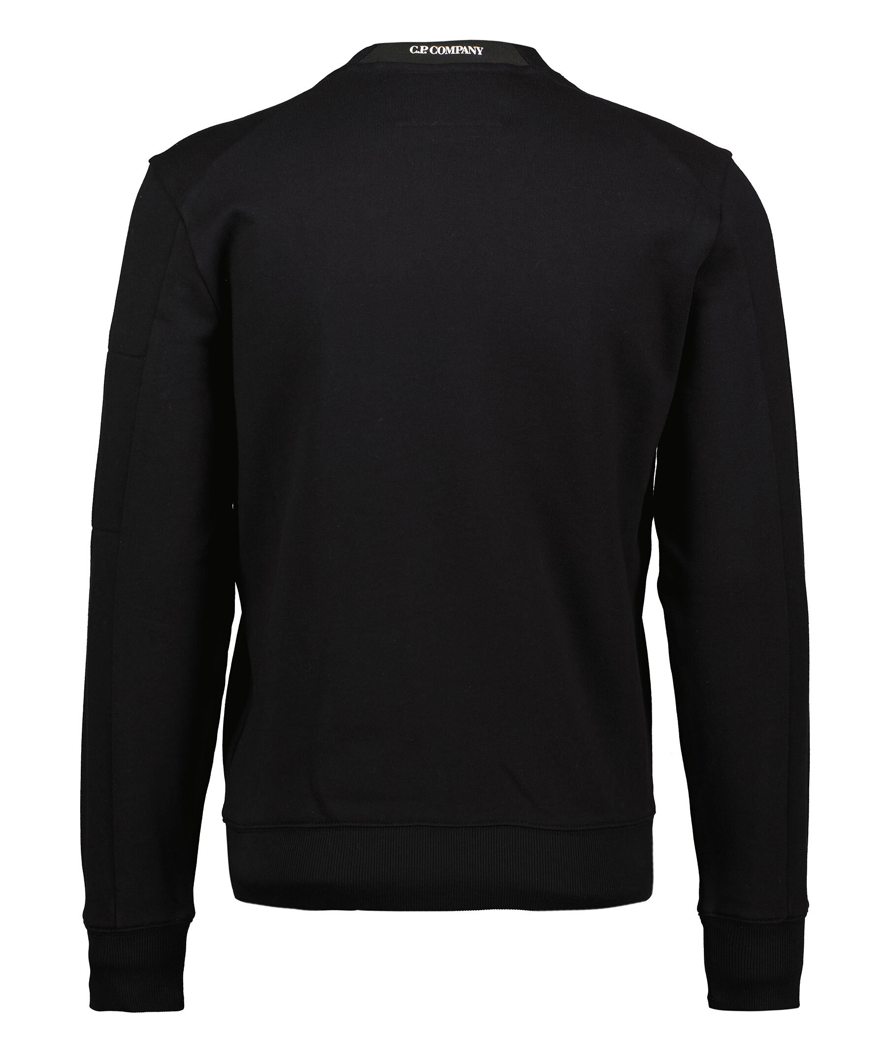 Svart sweatshirt från C.P Company. Tillverkad i 100% bomull. Ficka på vänster ärm med dragkedja och rund patch i plast med logotyp. Fint ribbade muddar vid halsring, ärm och plaggslut. Vit logotyp tryckt i nacken.