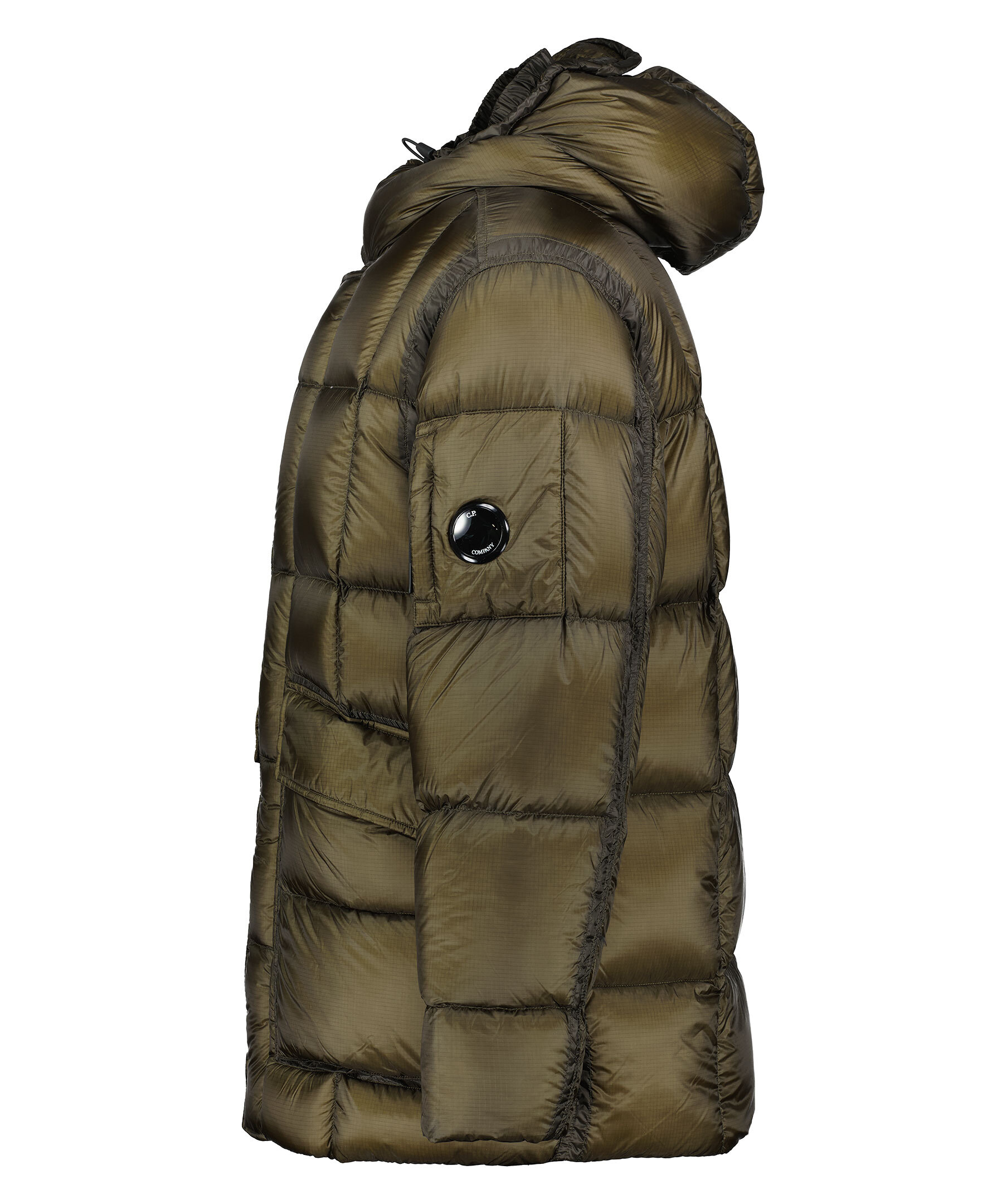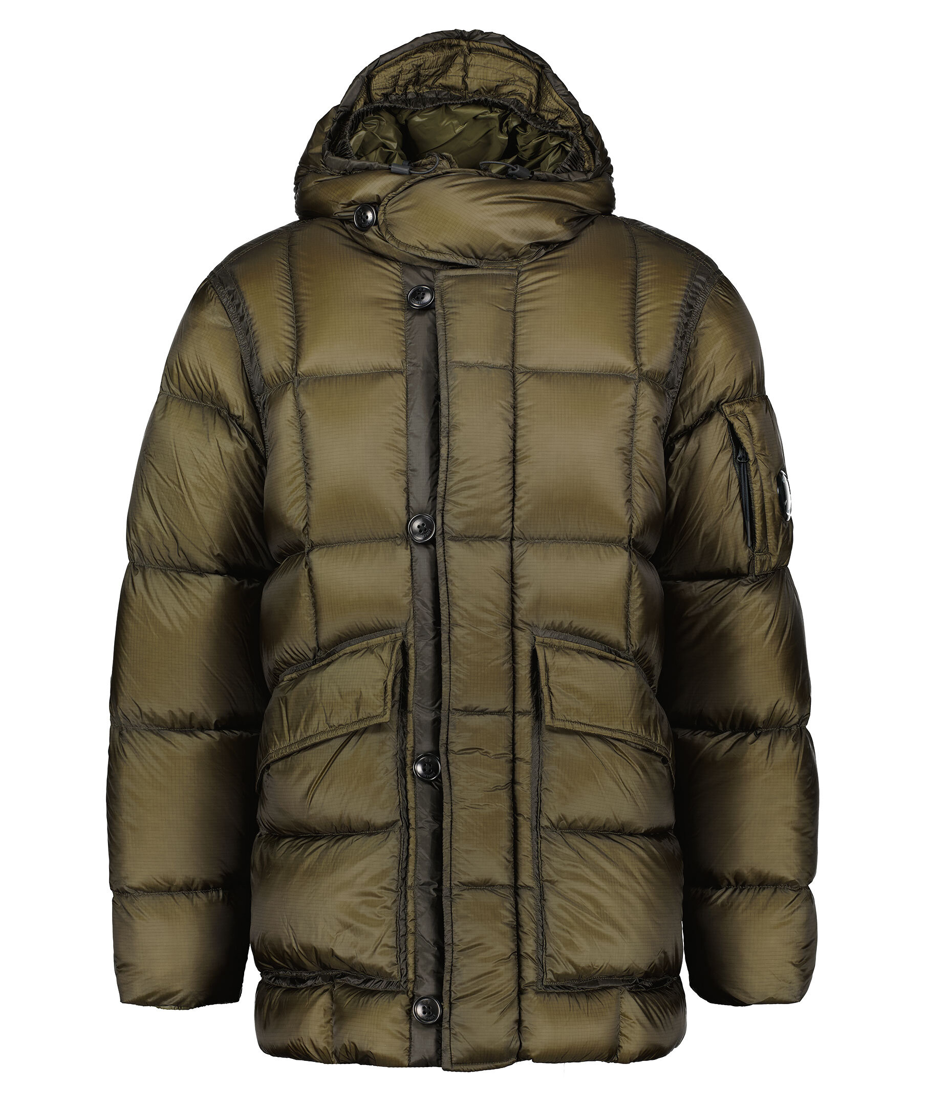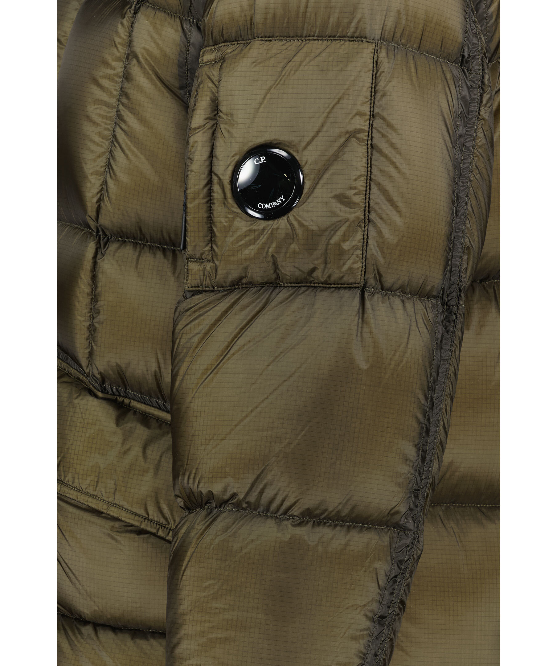 Mörkgrön quiltad dunjacka från C.P Company. Stängs framtill med tvåvägsdragkedja, knappar och öglor. Två fickor framtill som stängs med lock och tryckknapp. Ficka på vänster ärm med logotyp som stängs med dragkedja. Dragsko vid jackslut. Resår vid ärmslut.
