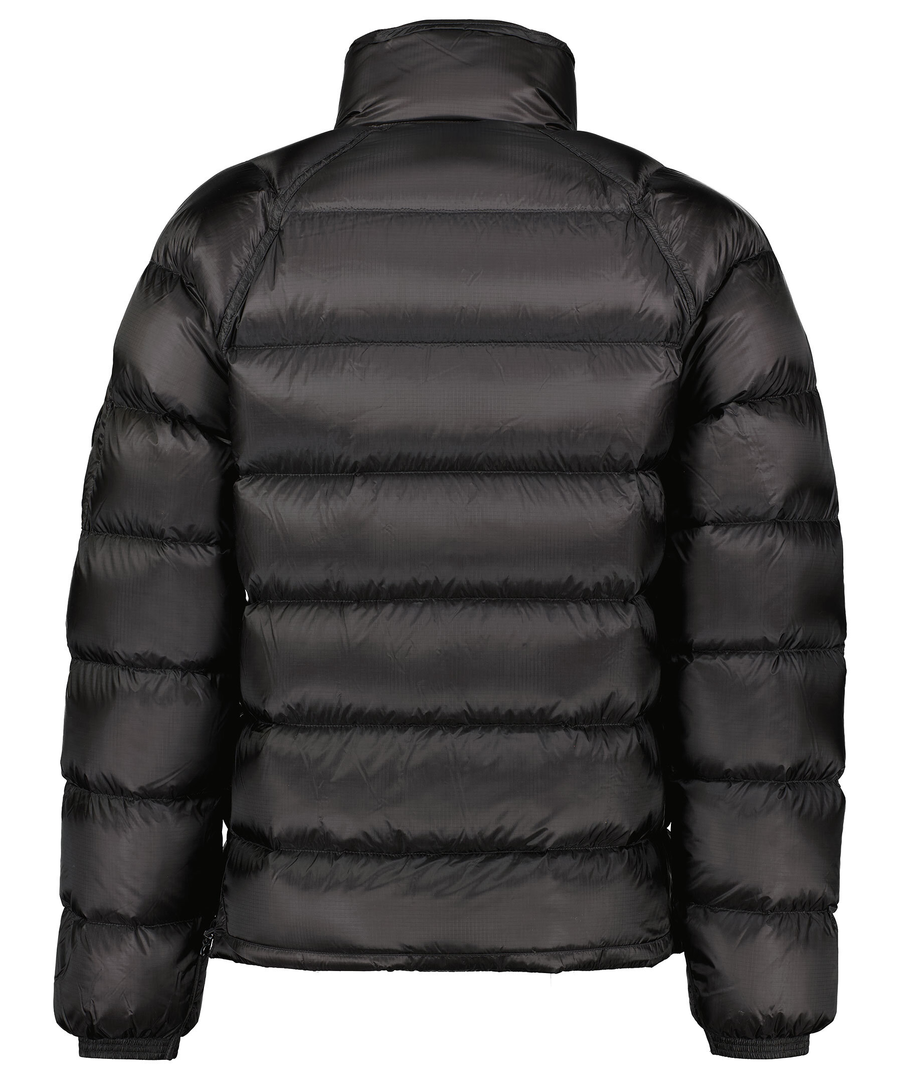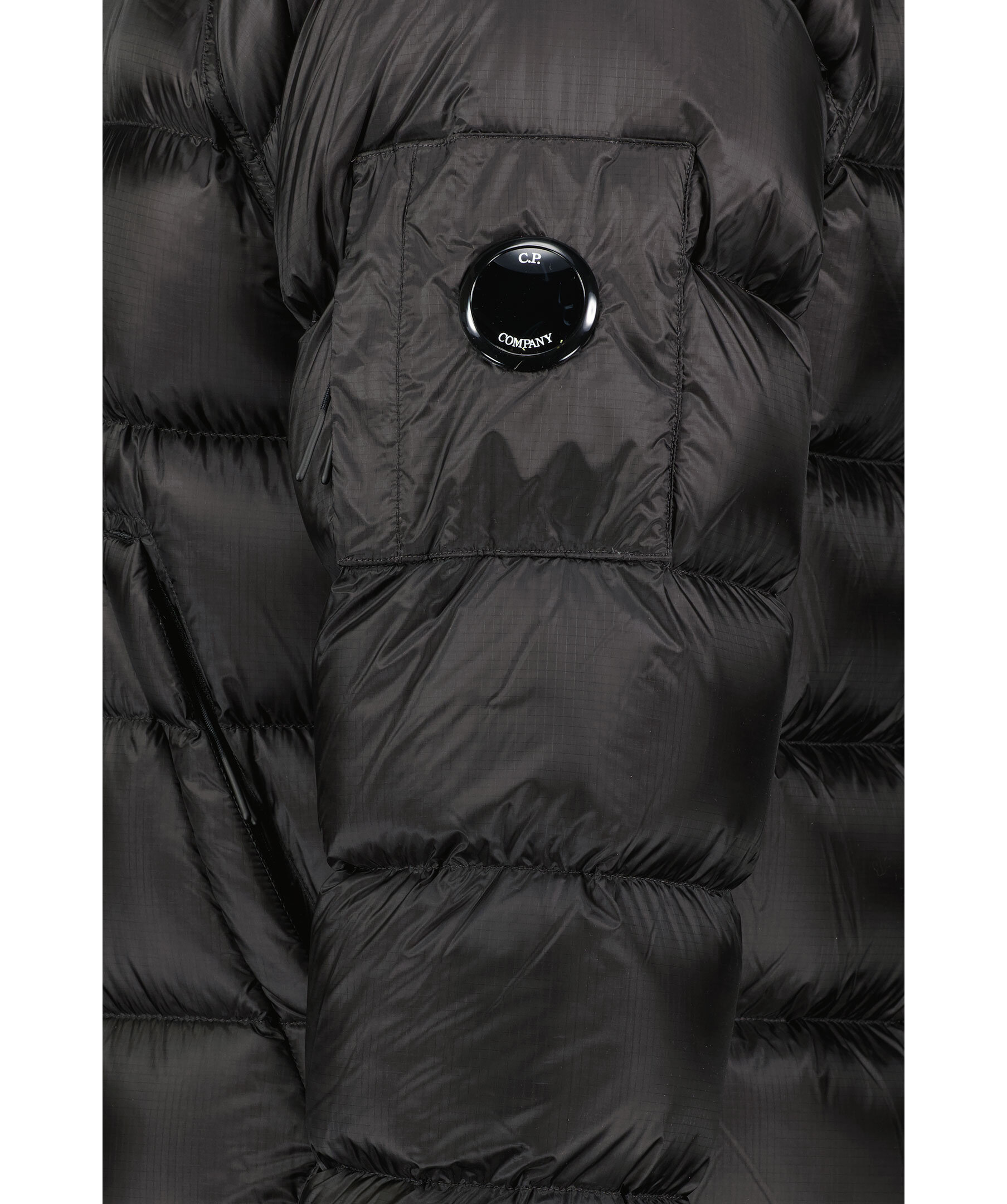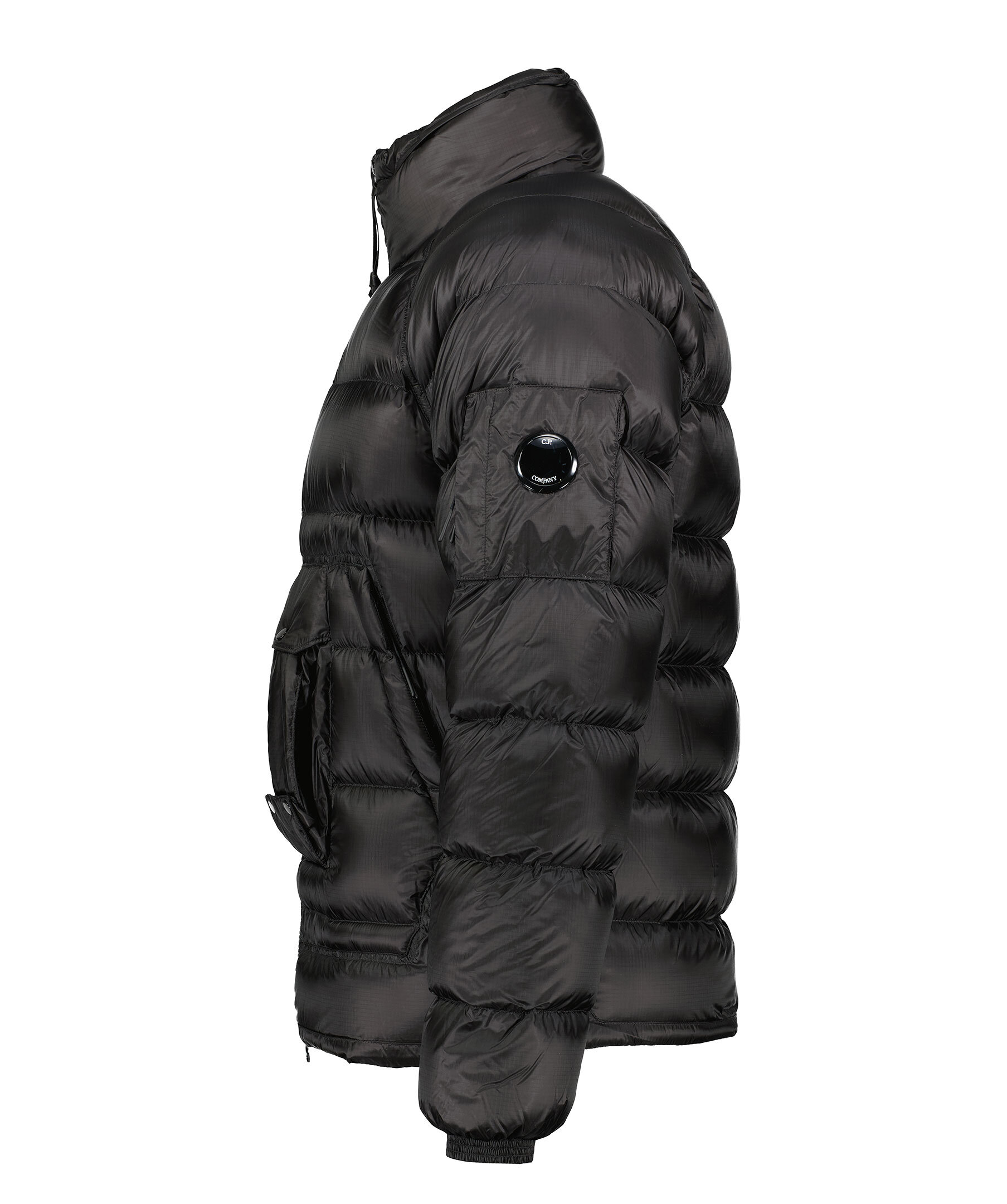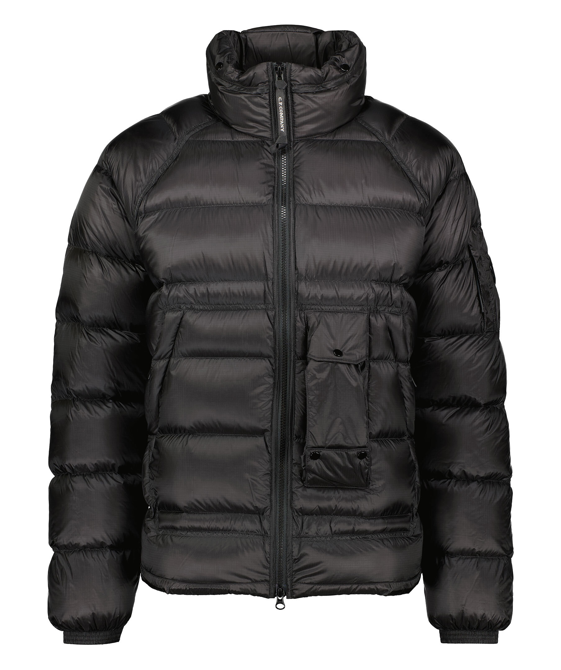 Svart dunjacka från C.P Company. Stängs framtill med tvåvägsdragkedja. Två snedställda fickor på magen som stängs med dragkedja, en smal ficka med lock som stängs med tryckknappar upptill och nedtill. Ficka på vänster ärm med patch och logotyp som stängs med dragkedja. Utvikbar luva i kragen. Resår vid ärmslut. Dragsko vid jackslut.