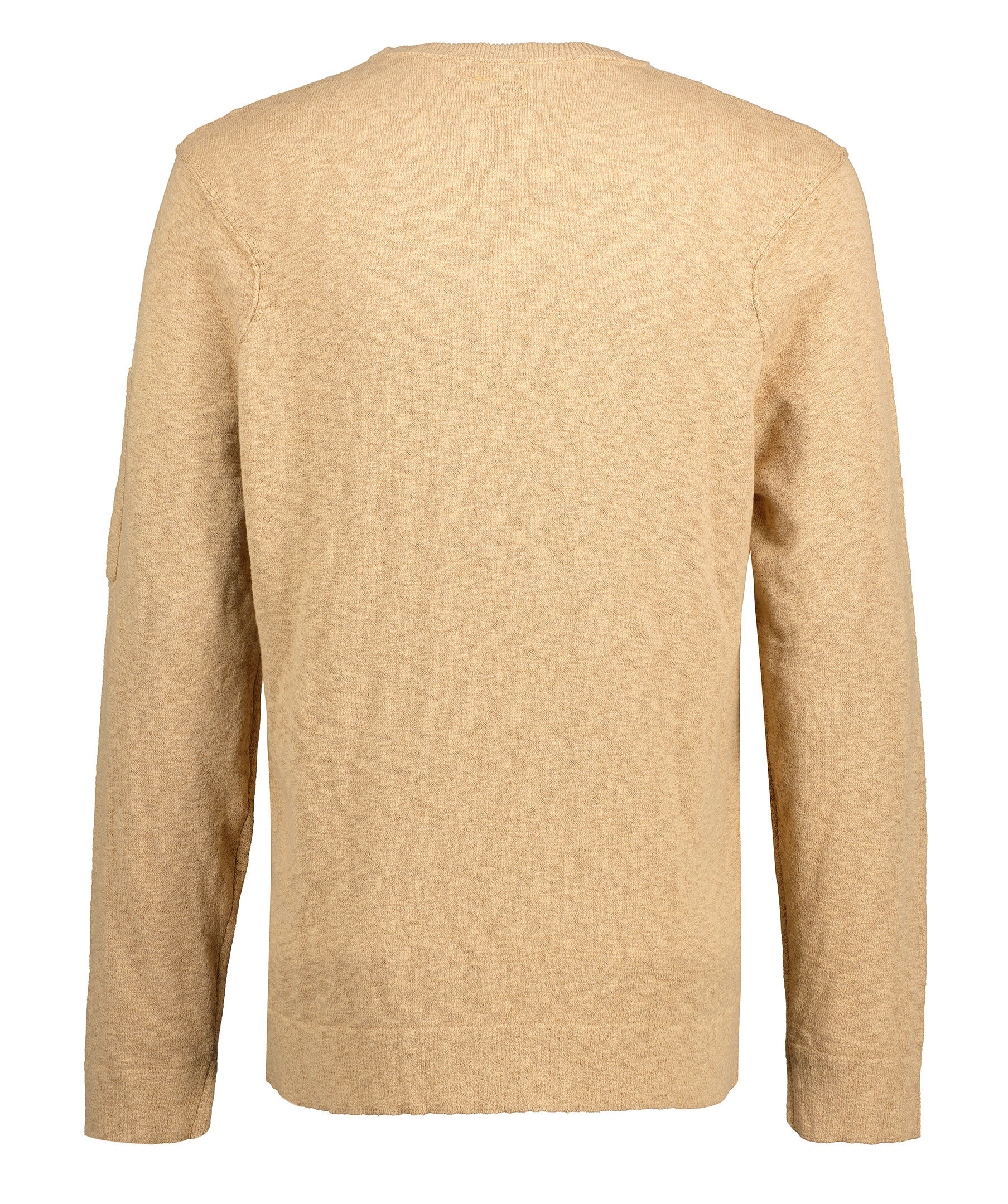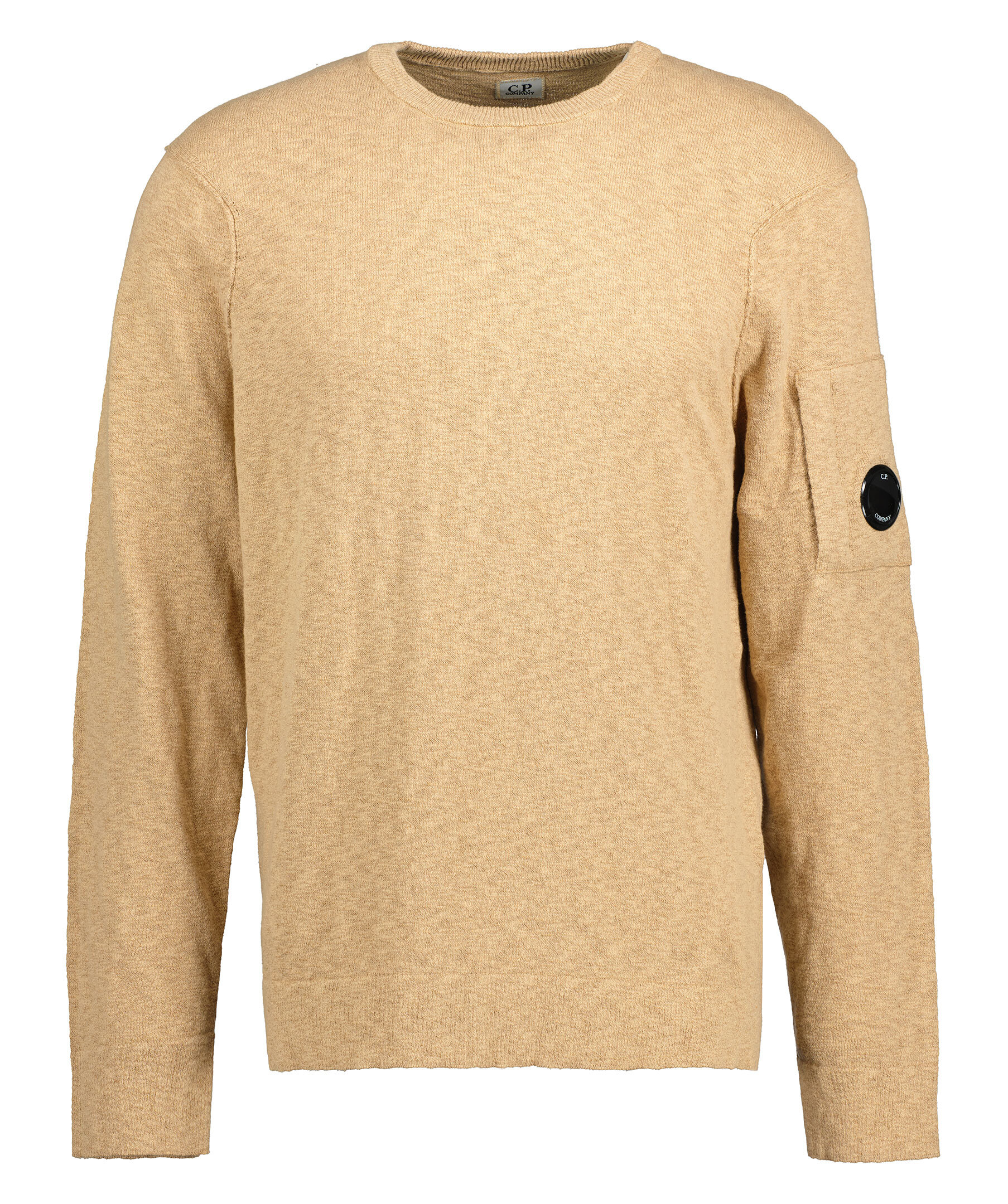 Varm beige, stickad tröja från C.P Company. Ribbstickad krage, samt muddar vid ärm- och plaggslut. Ficka med dragkedja och linsdetalj på vänster ärm. Tillverkad i en bomullsblandning.