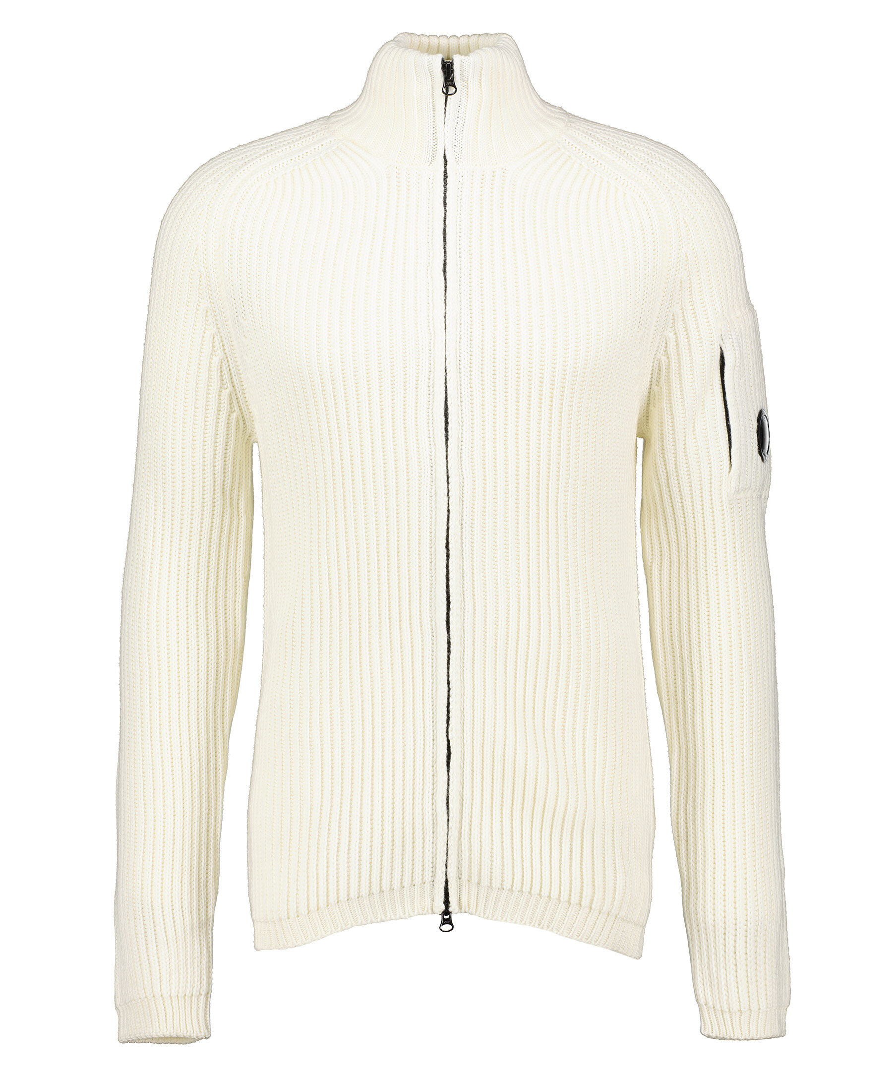 Krämtvit ribbstickad cardigan från C.P Company Tröjan är gjord i en skön ullblandning. Hög krage, ficka och logotyp på vänster överärm. Stängs med en svart tvåvägsdragkedja.