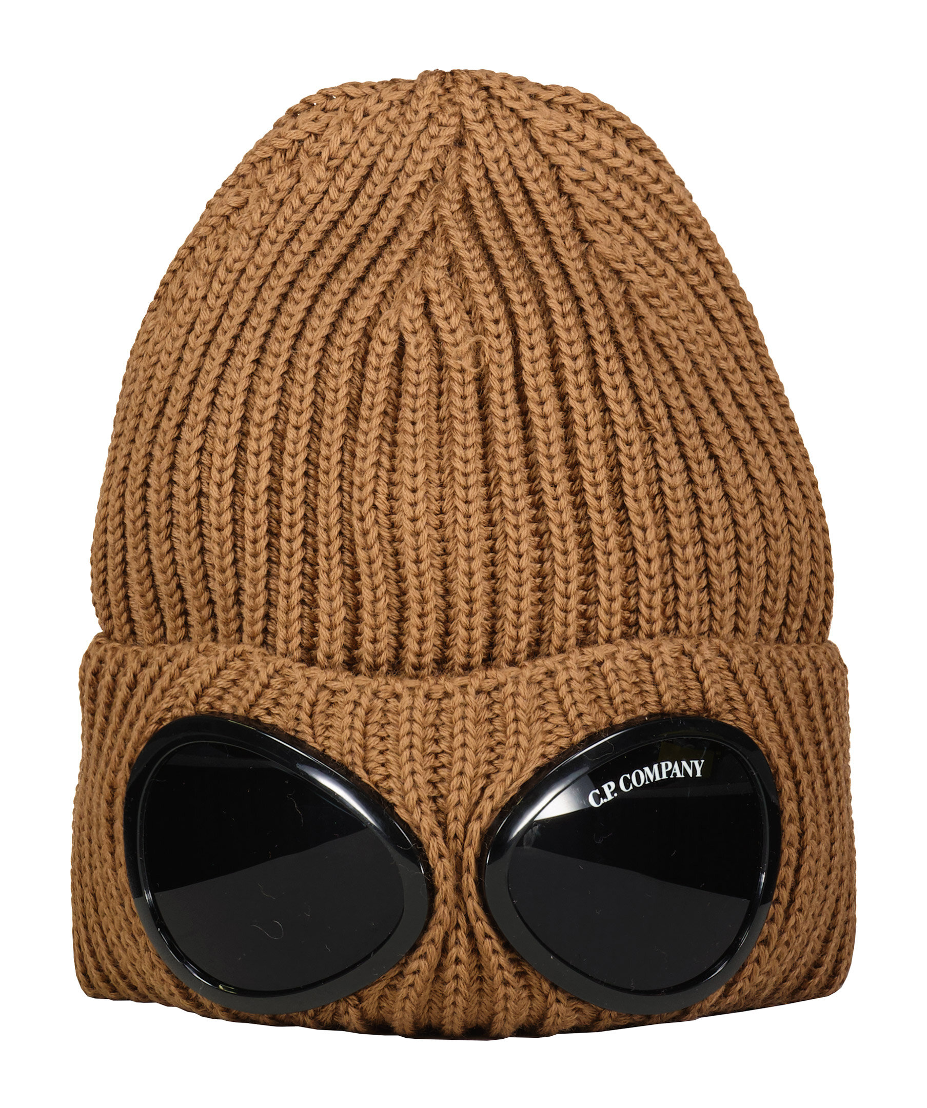Brun ribbstickad mössa från C.P Company. Uppvikt kant med ikoniska goggles. Tillverkad i 100% ull.