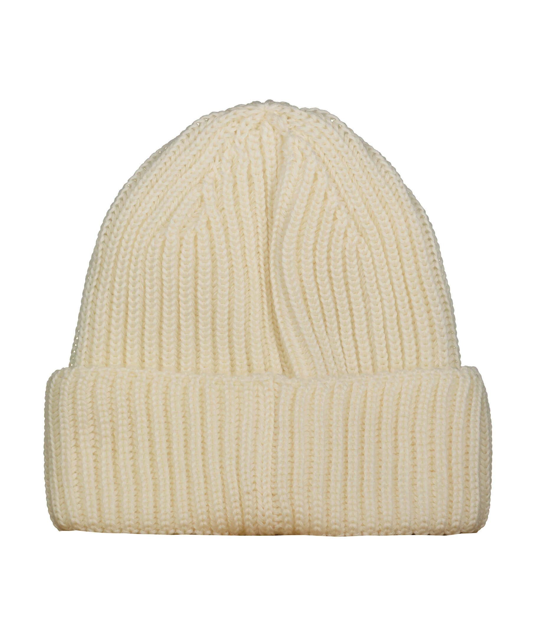 Krämvit, ribbstickad mössa med Goggledetalj från C.P Company. Uppvikt kant. Tillverkad i extra fin merinoull.