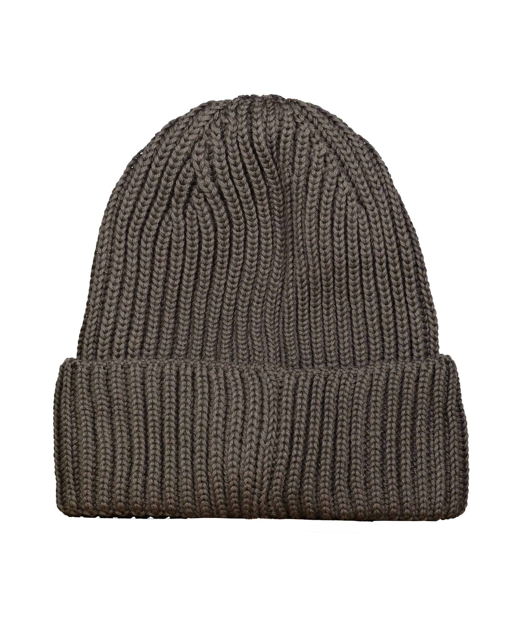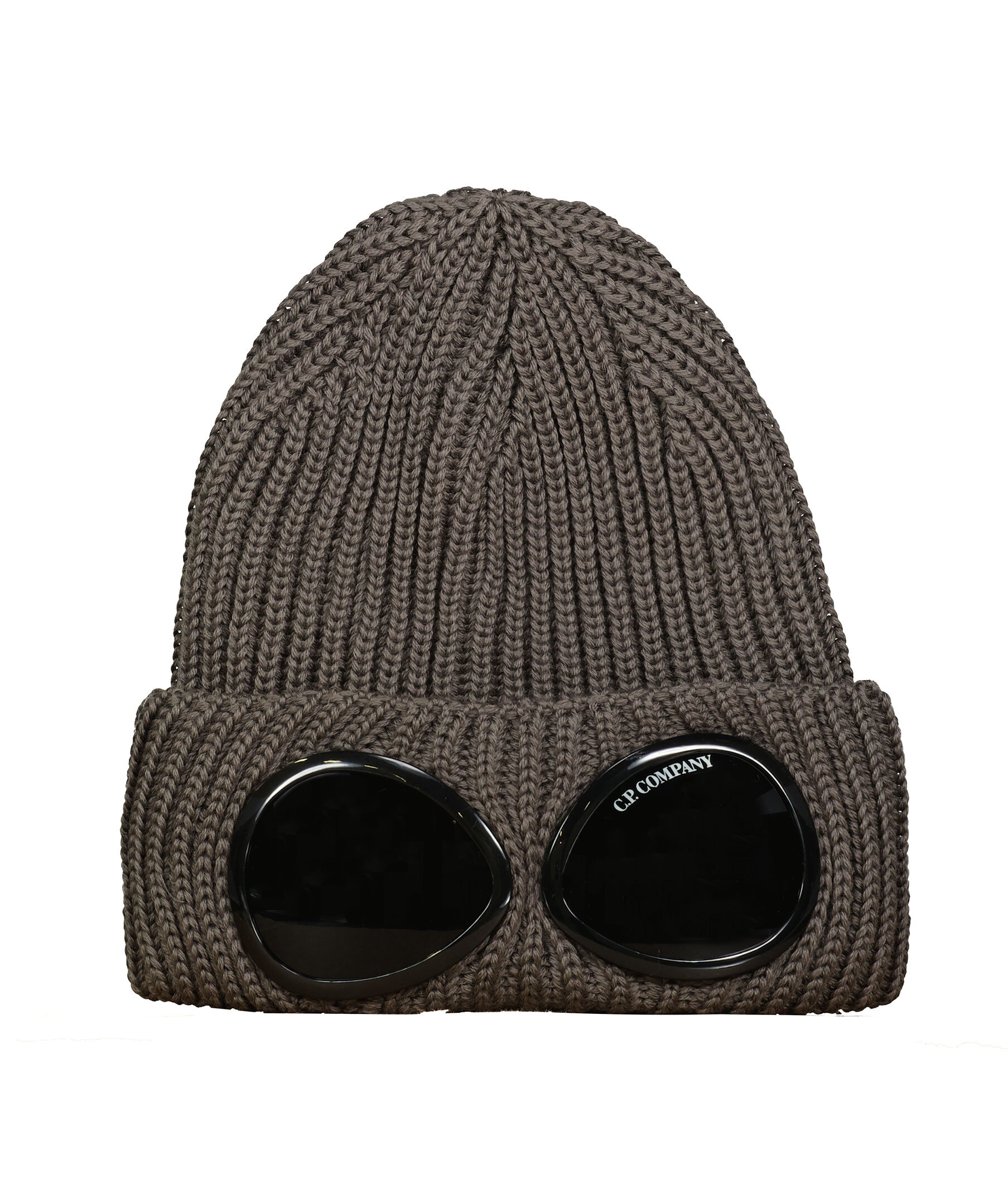 Brun, ribbstickad mössa med Goggledetalj från C.P Company. Uppvikt kant. Tillverkad i extra fin merinoull.
