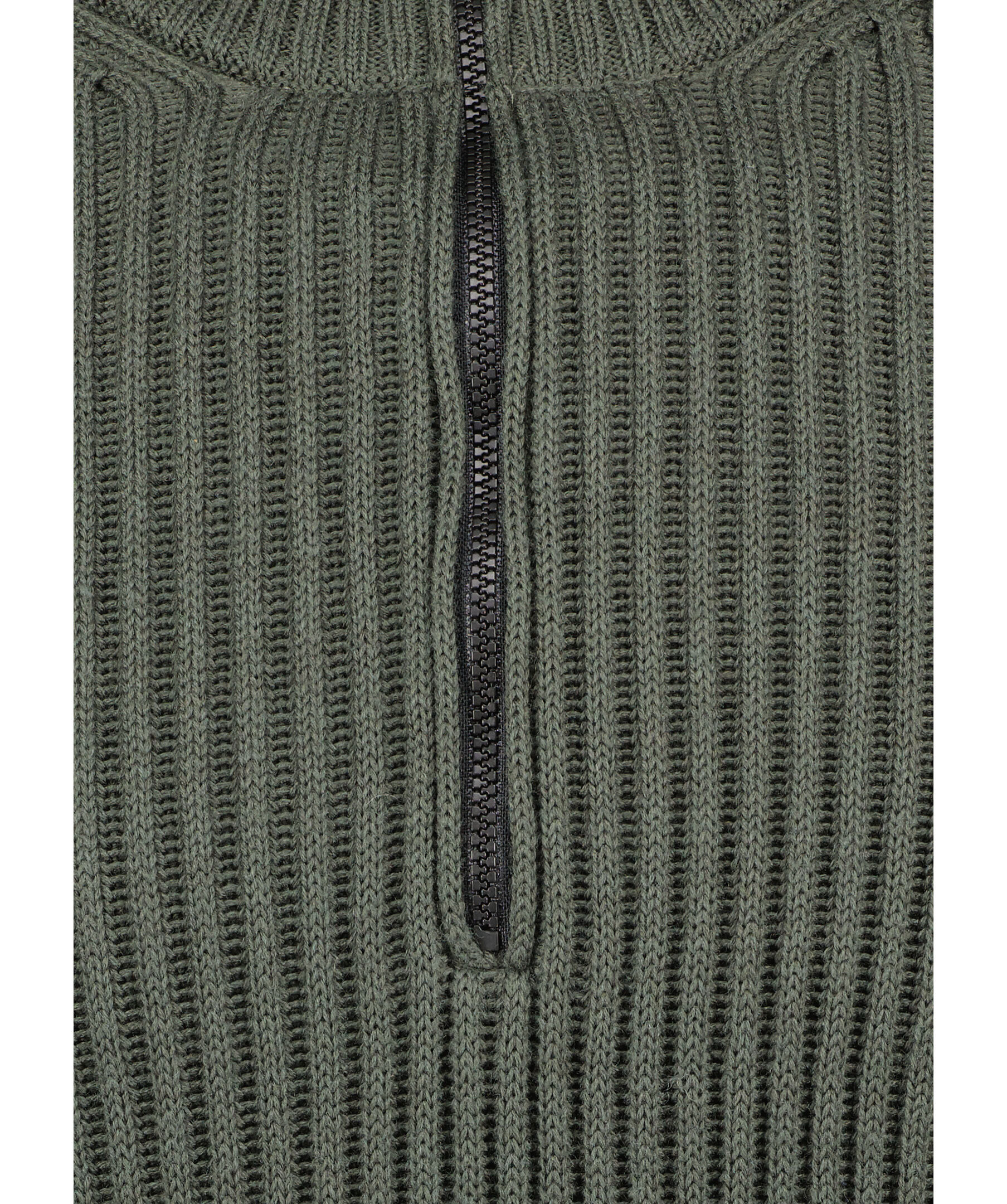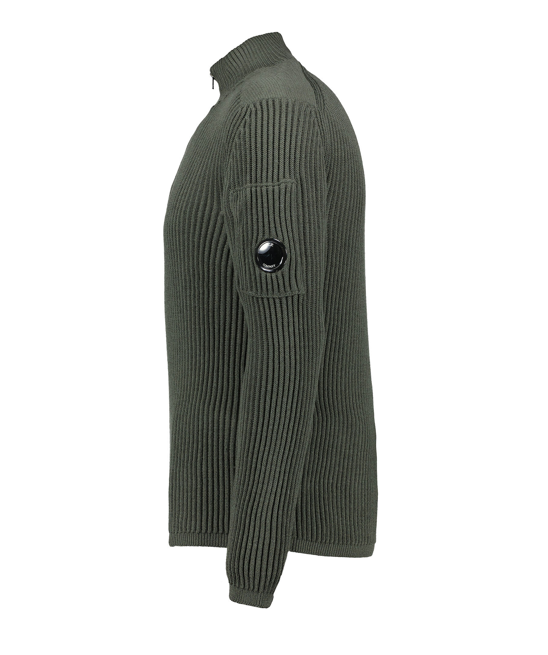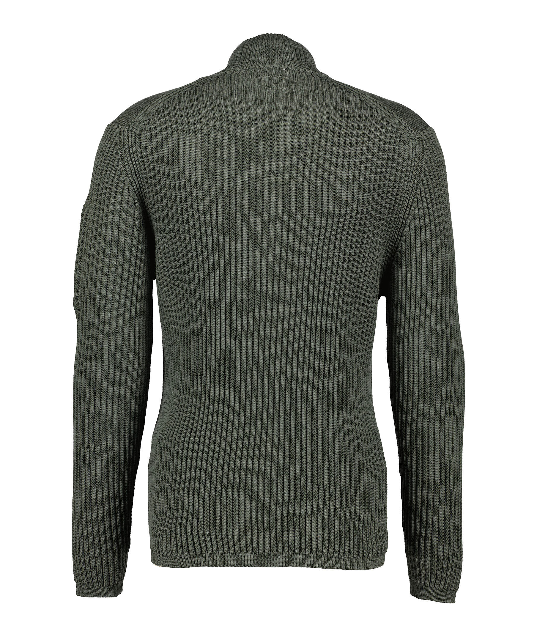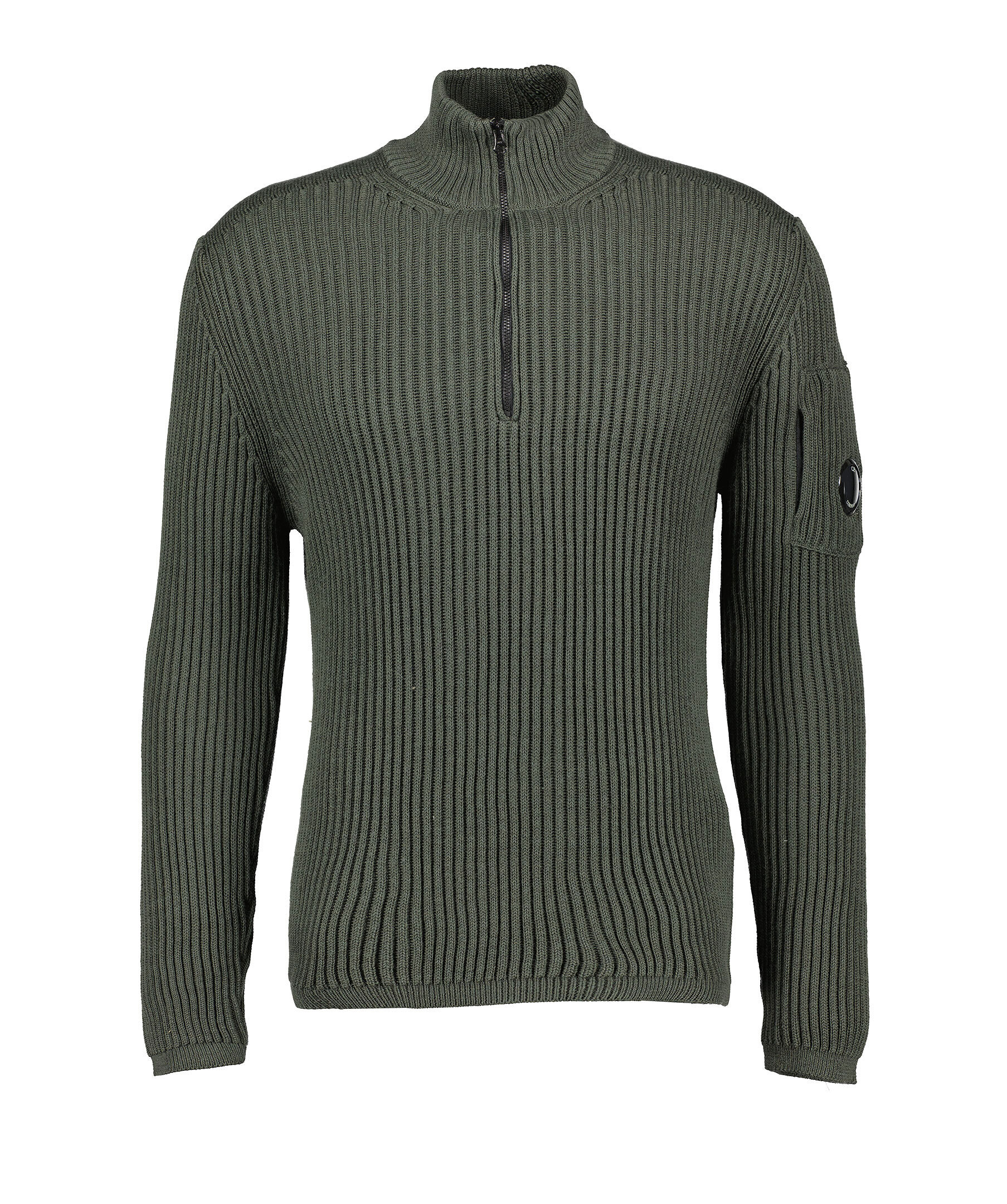 Grön ribstickad tröja med half-zip från C.P Company. Tröjan är gjord i en ullblandning. Ficka med dragkedja och lins på ena tröjärmen. Hög krage.