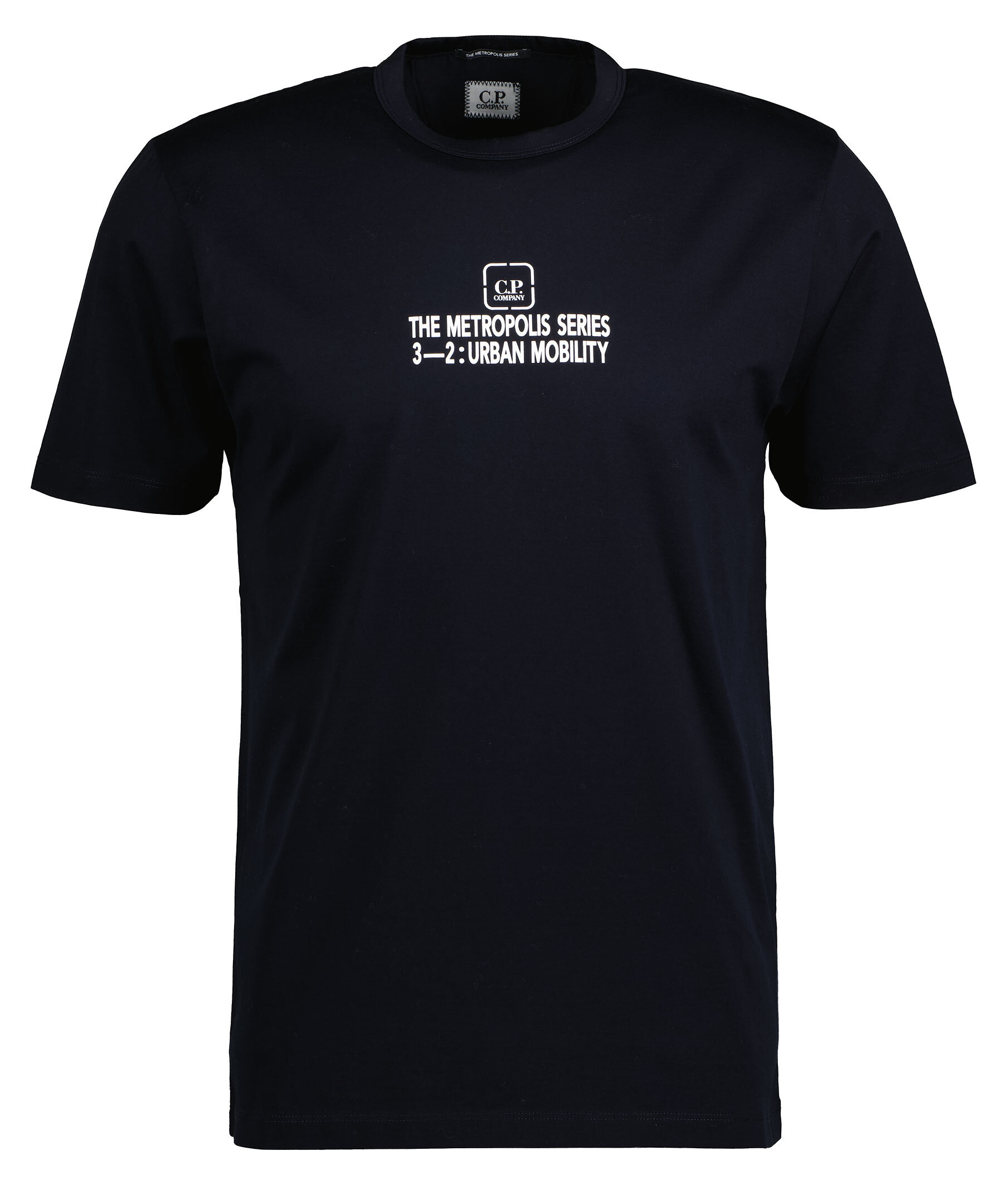 Marinblå t-shirt från C.P Company. Rundad halsringning och vitt tryckt och liten logotyp på bröstet. Tillverkad i 100% Bomull.