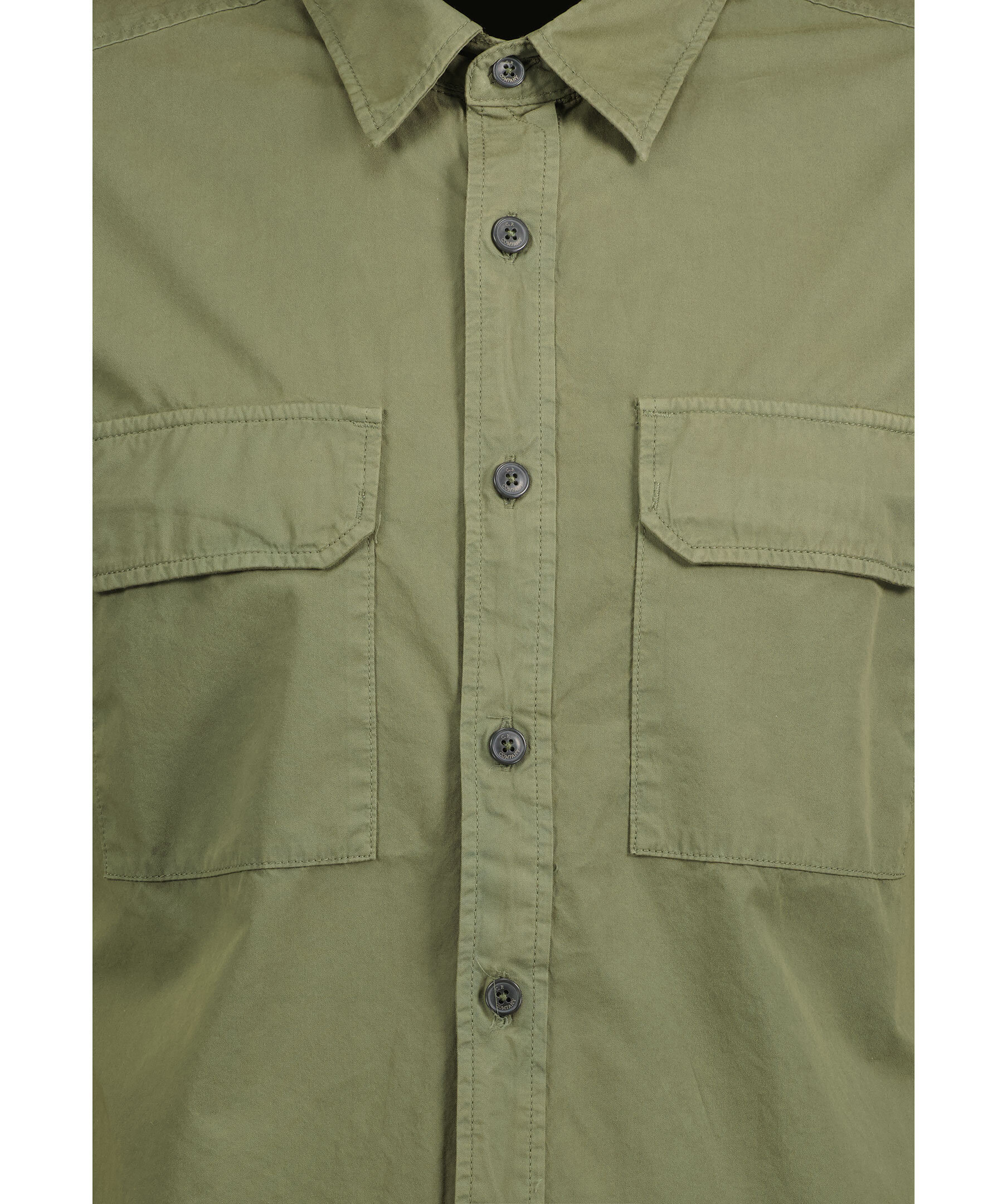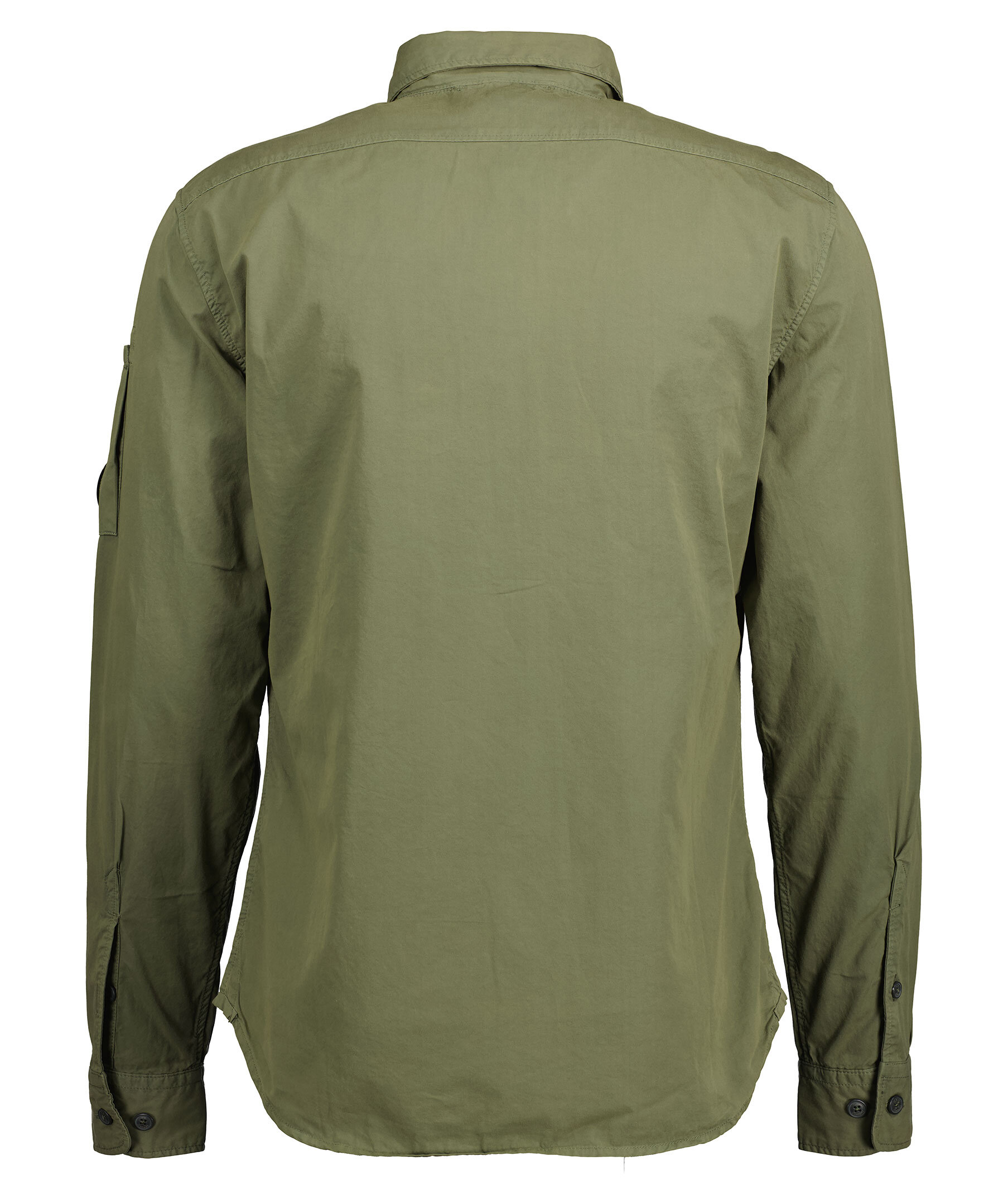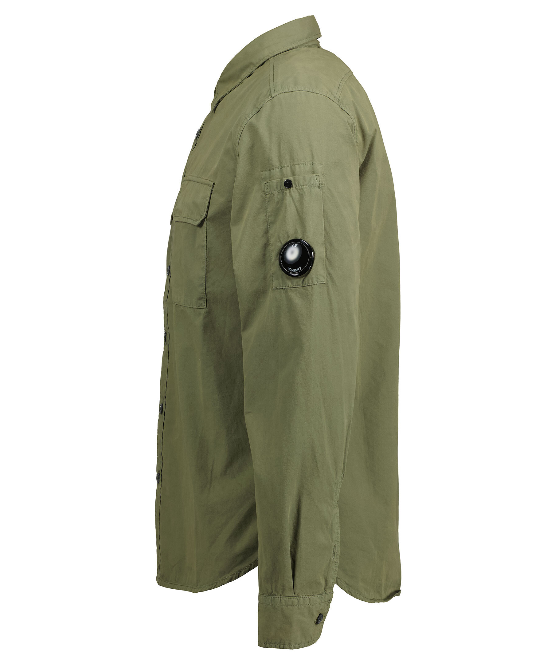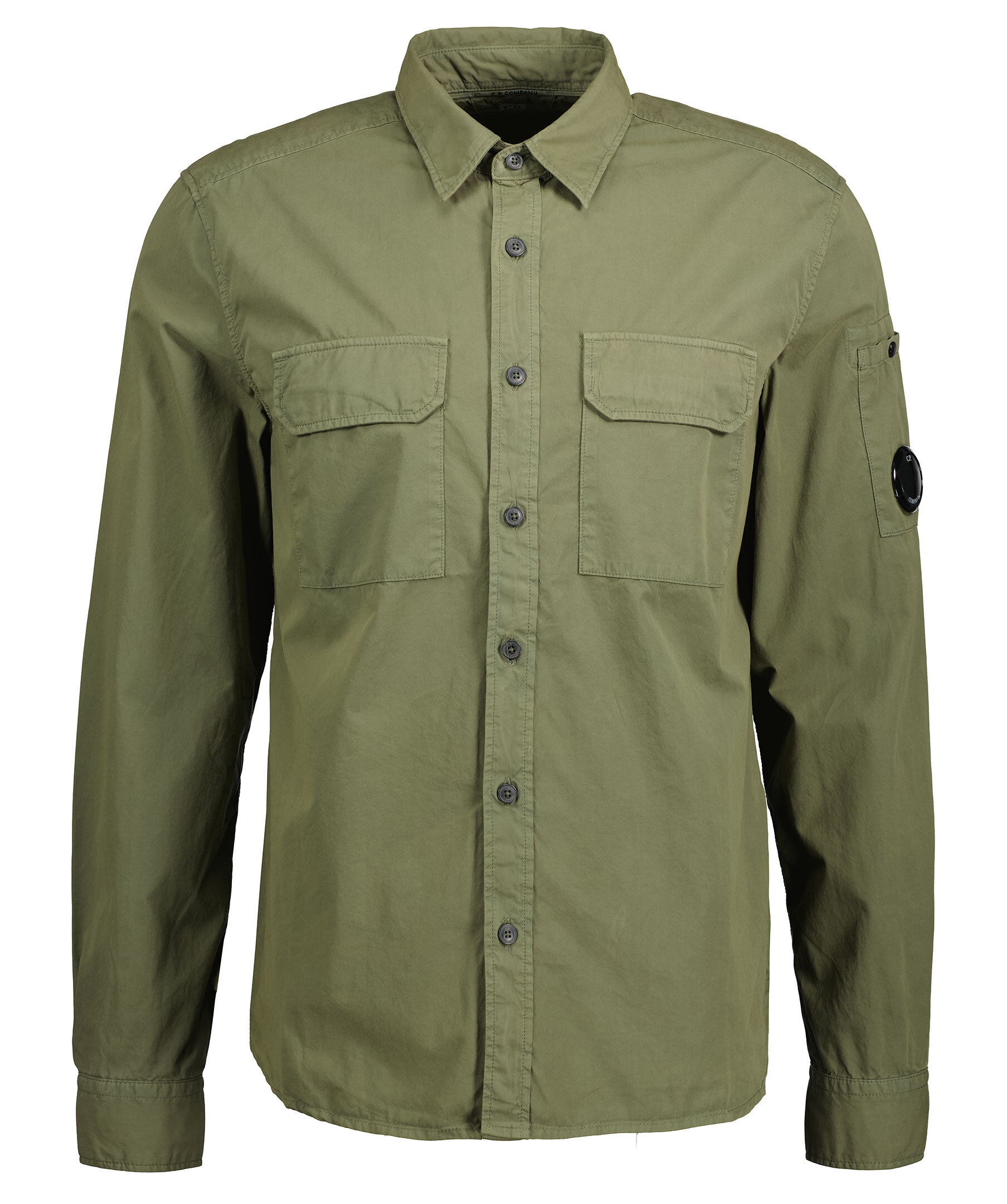 Mossgrön overshirt från C.P Company. Stängs framtill med mörkgråa knappar. Bröstfickor med lock och dubbla manschetter. Ficka på vänster ärm med logotyp och tryckknapp. Spetsig krage och hälla på insidan av nacken för upphängning. Tillverkad i 100% bomull.