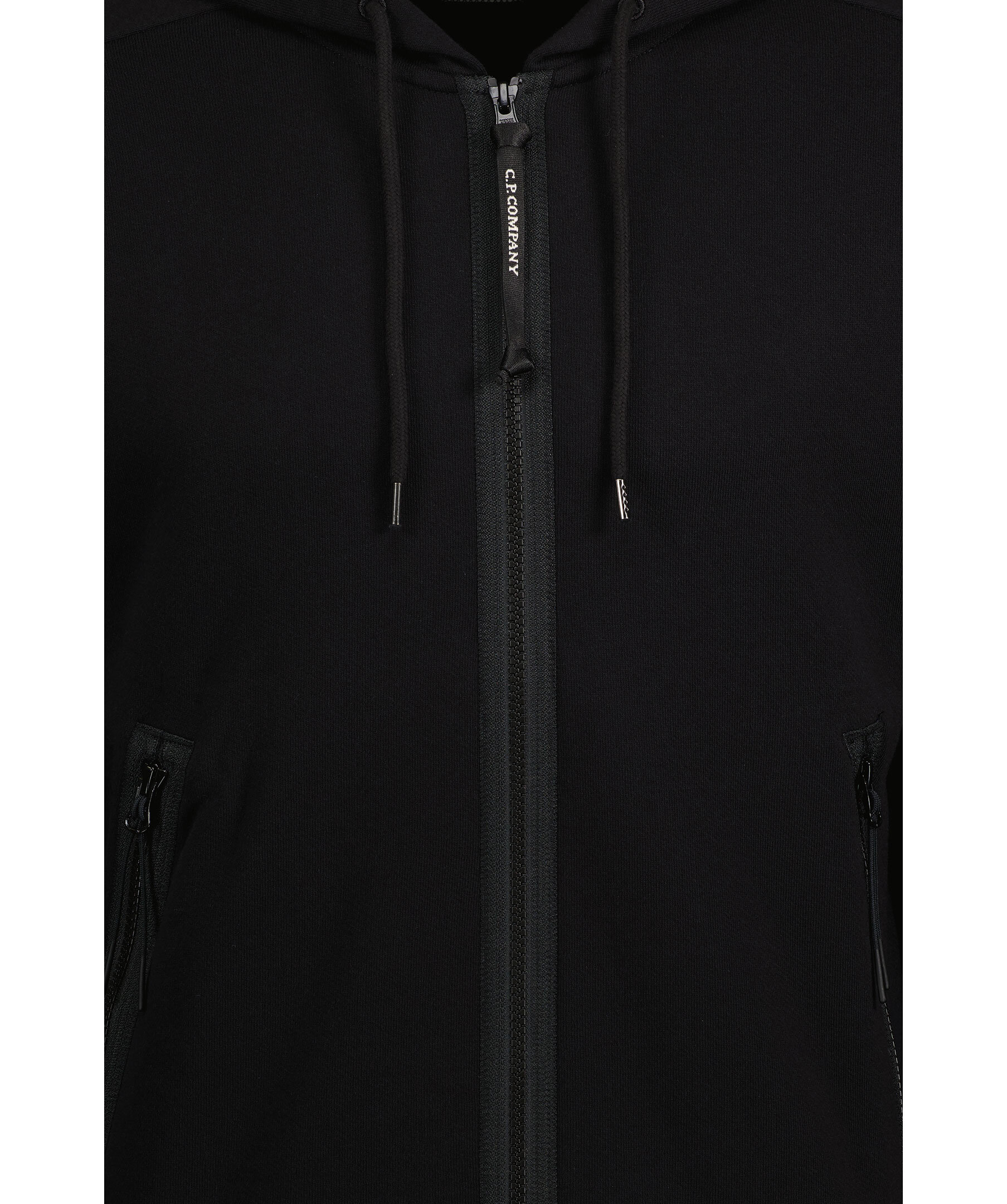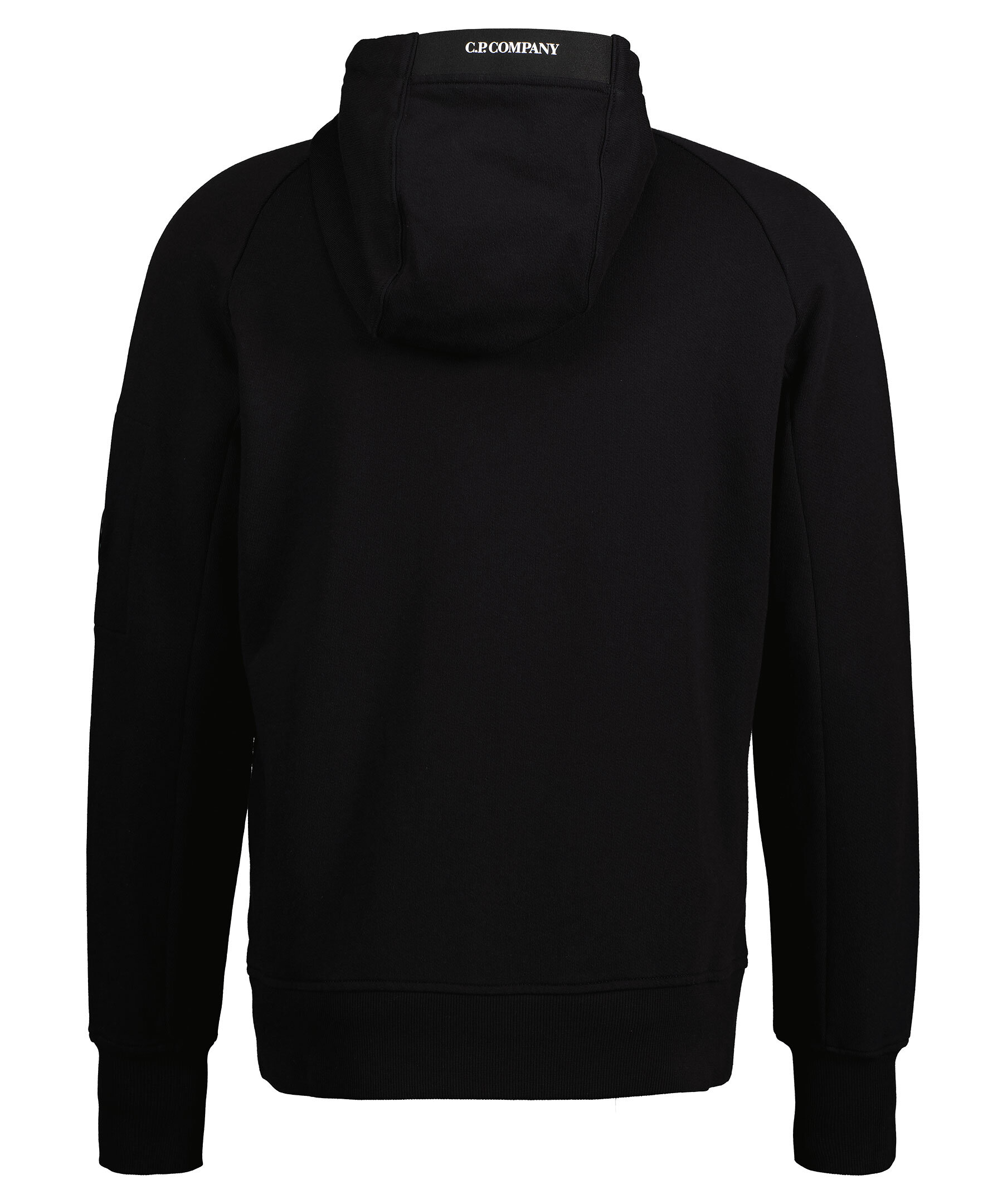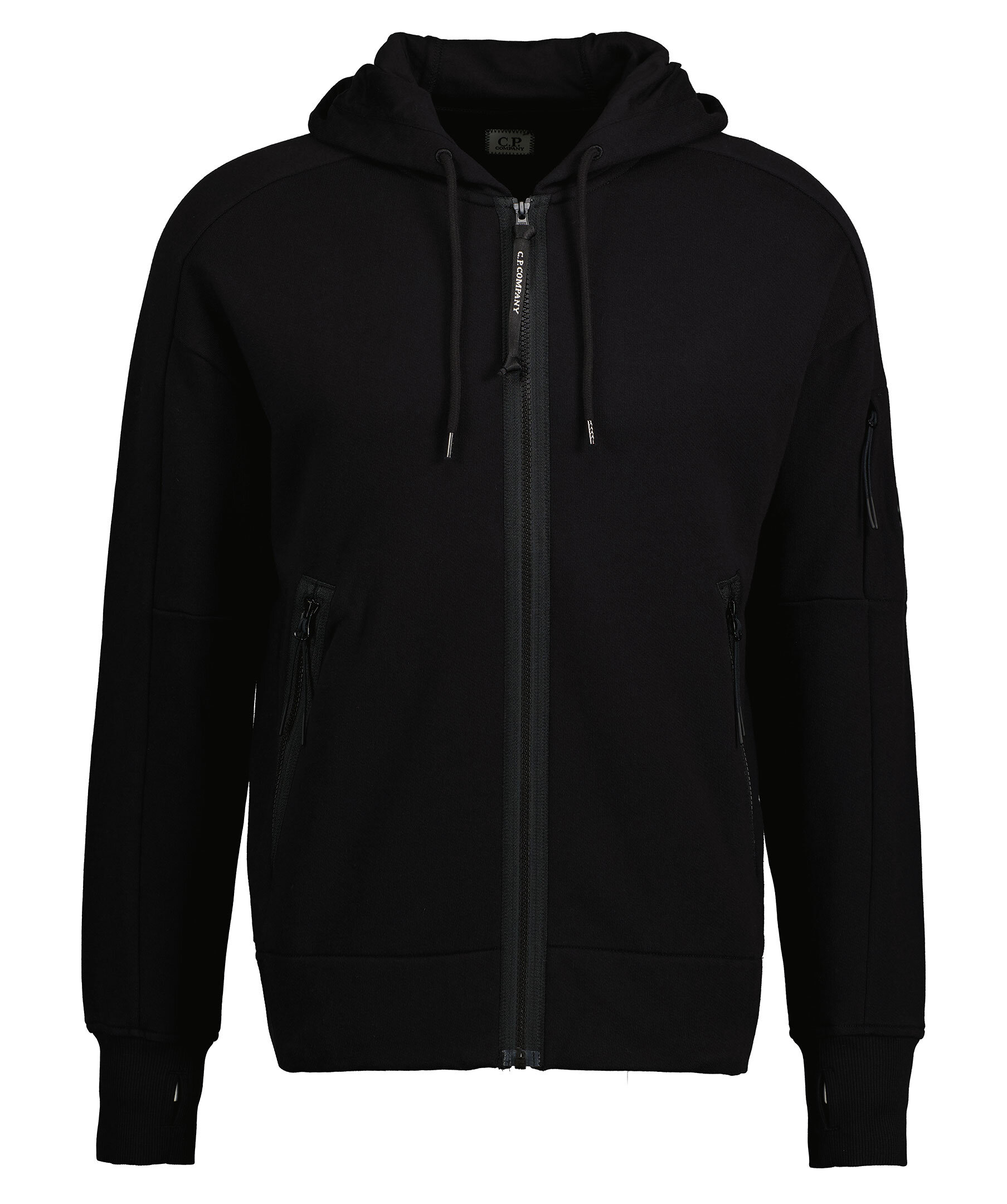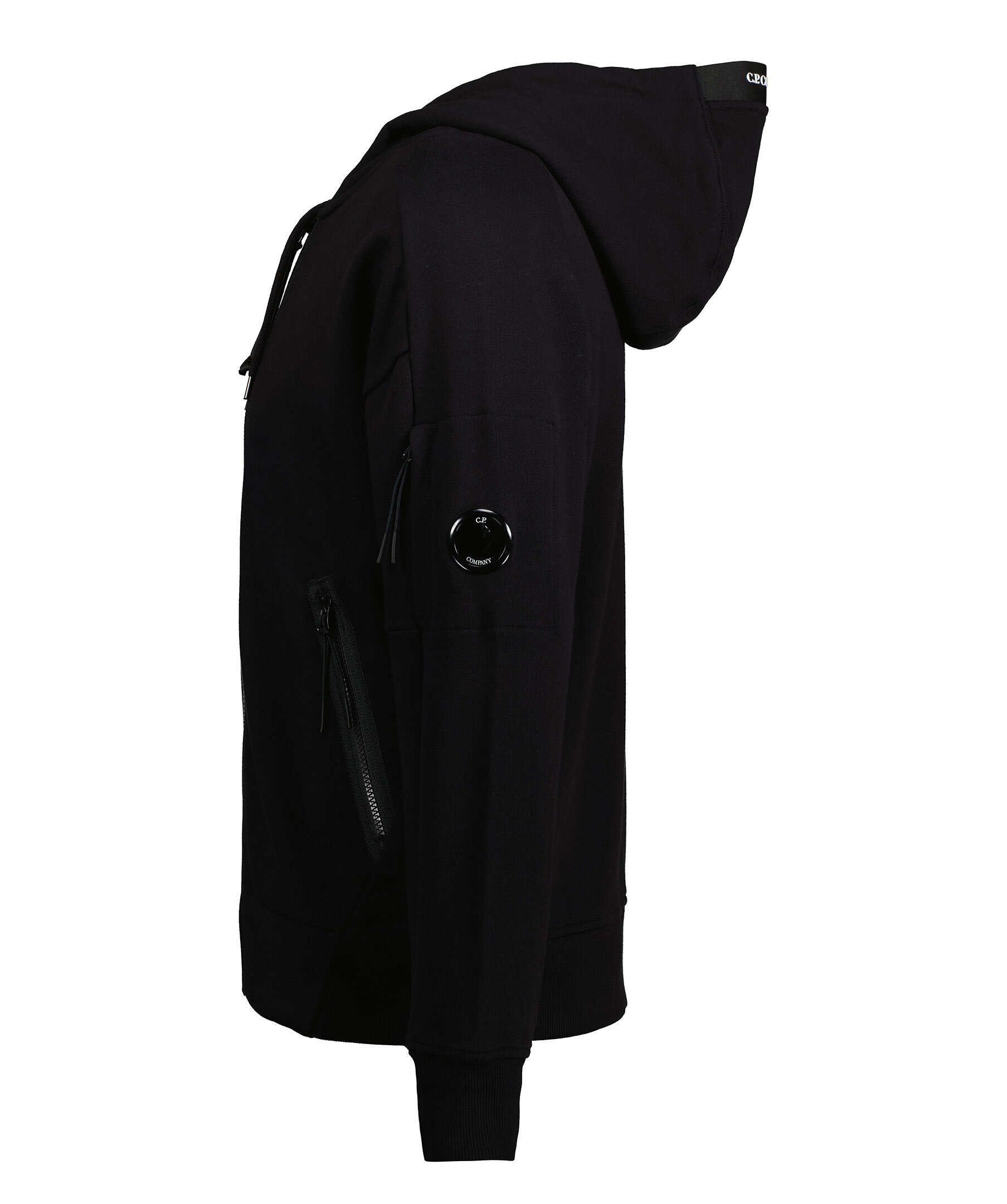 Svart hoodie med dragkedja fram från C.P Company. Tillverkad i 100% bomull. Ficka på vänster ärm med dragkedja och rund, svart patch i plast med logotyp på. Fint ribbade muddar vid ärm och plaggslut och luva med snörning. Fickor med dragkedja i sidorna.