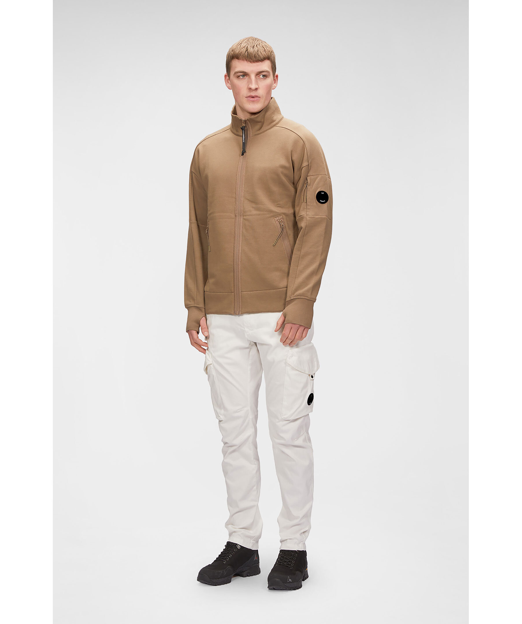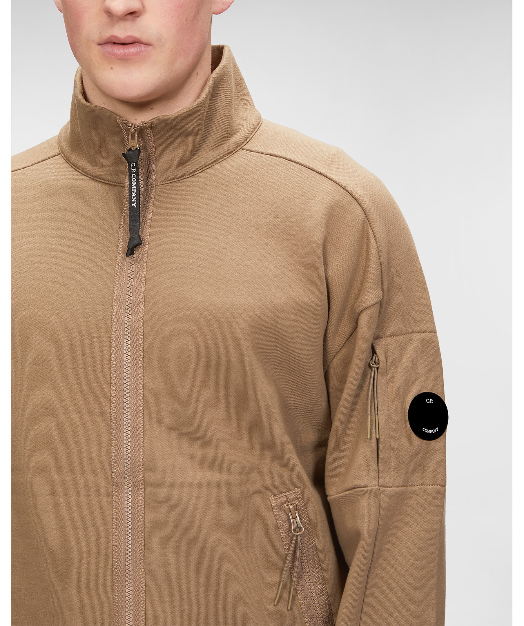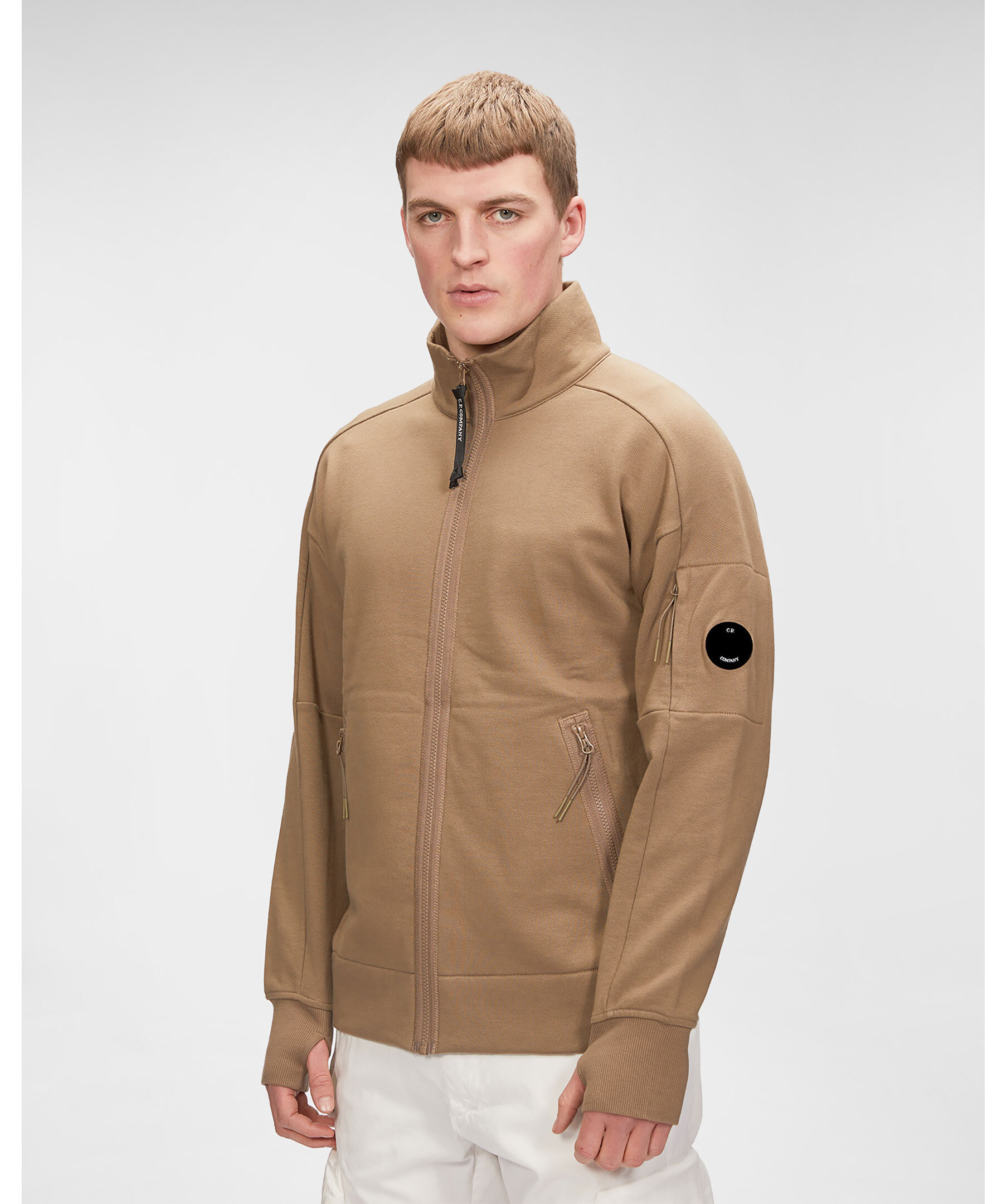 Brun långärmad tröja med dragkedja hela vägen fram från C.P Company. Tillverkad i 100% bomull. Ficka på vänster ärm med dragkedja och runt patch i plast med logotyp. Fint ribbade muddar på ärm och plaggslut. Hög krage och framfickor med dragkedjor.