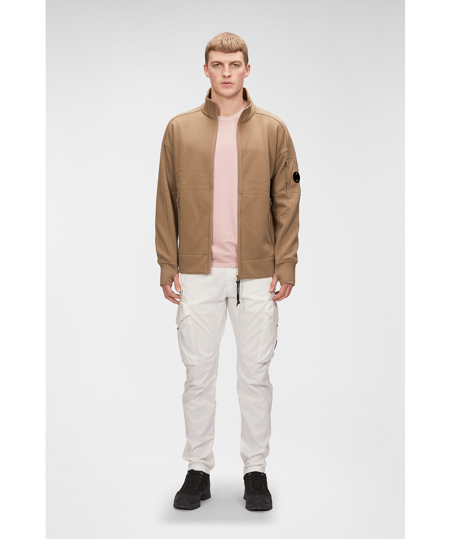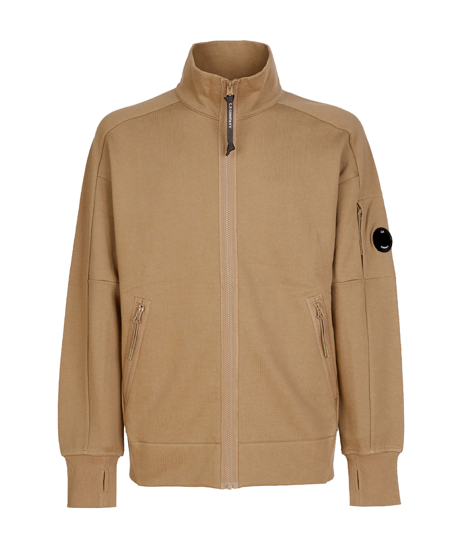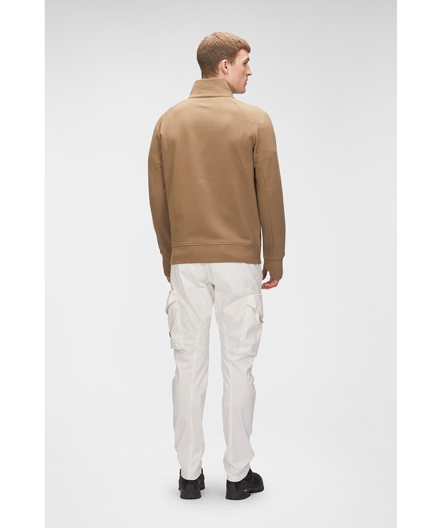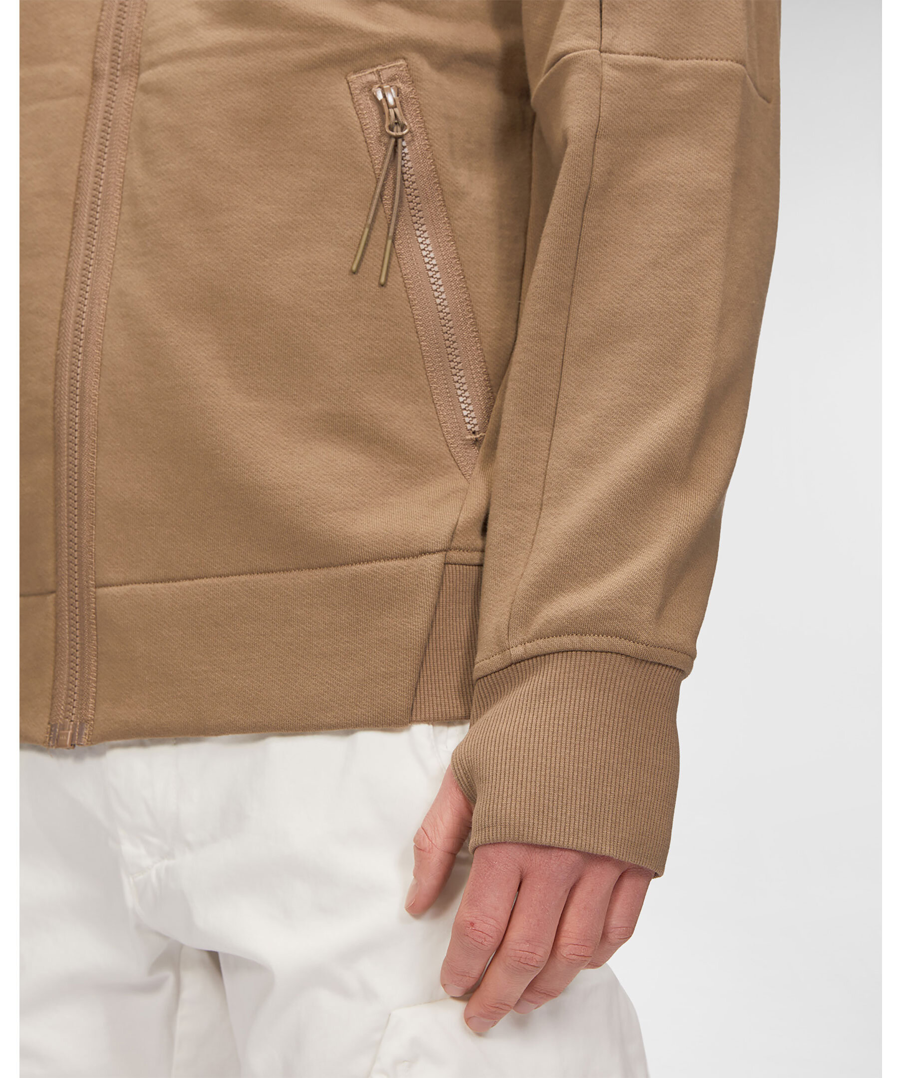Brun långärmad tröja med dragkedja hela vägen fram från C.P Company. Tillverkad i 100% bomull. Ficka på vänster ärm med dragkedja och runt patch i plast med logotyp. Fint ribbade muddar på ärm och plaggslut. Hög krage och framfickor med dragkedjor.