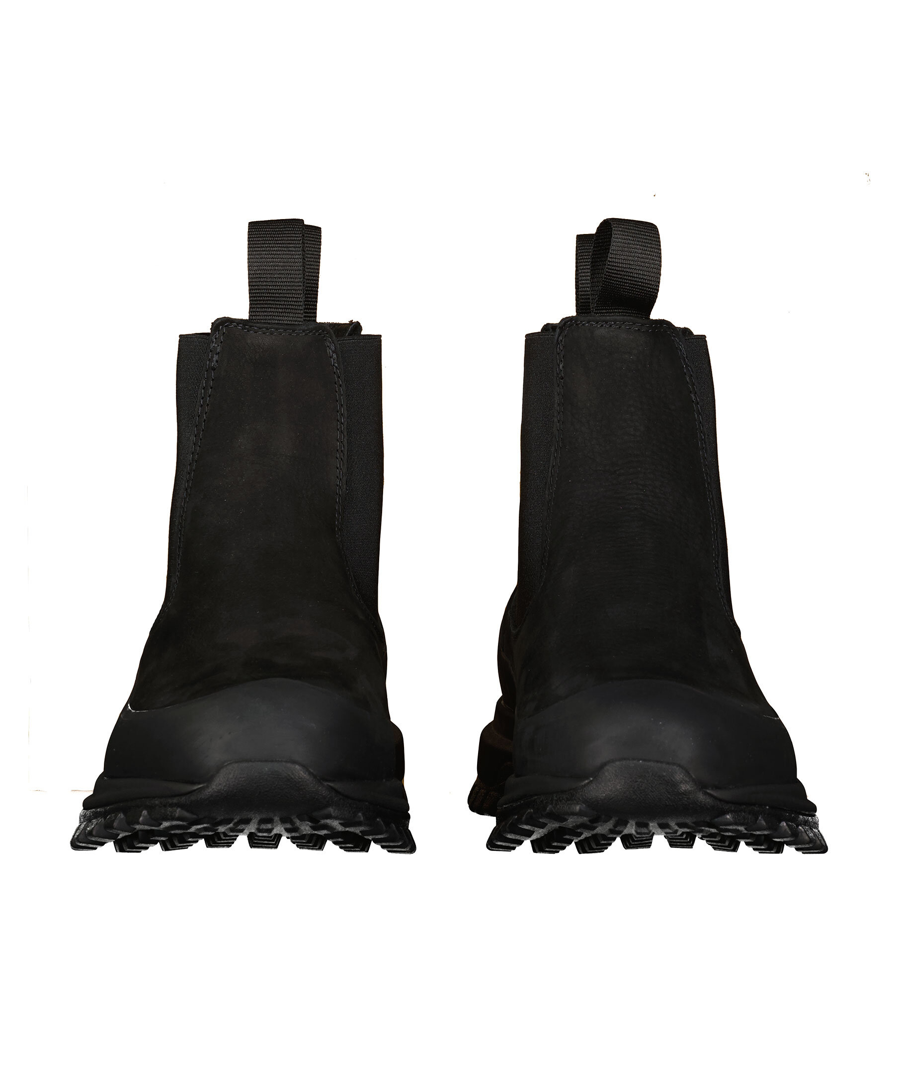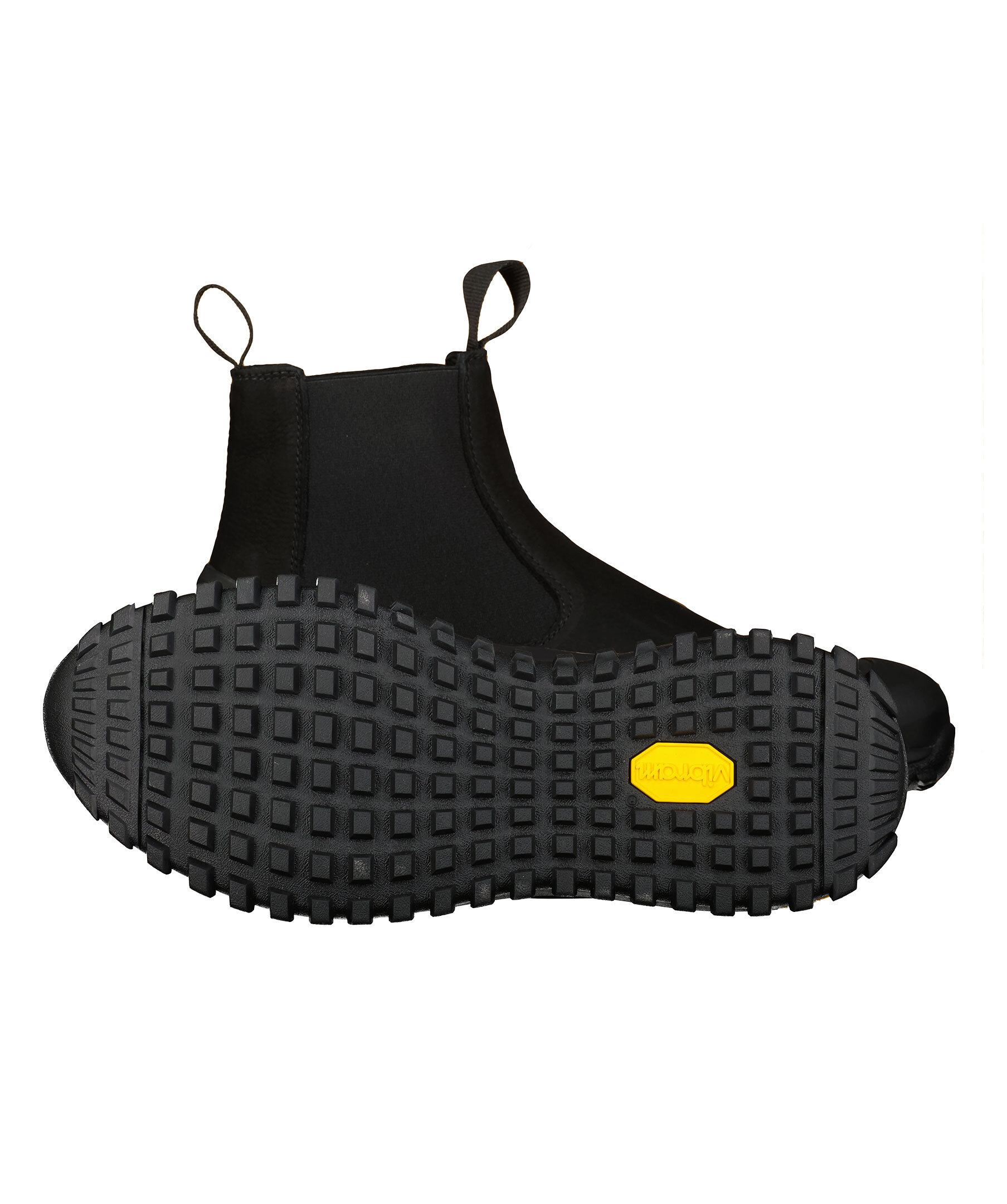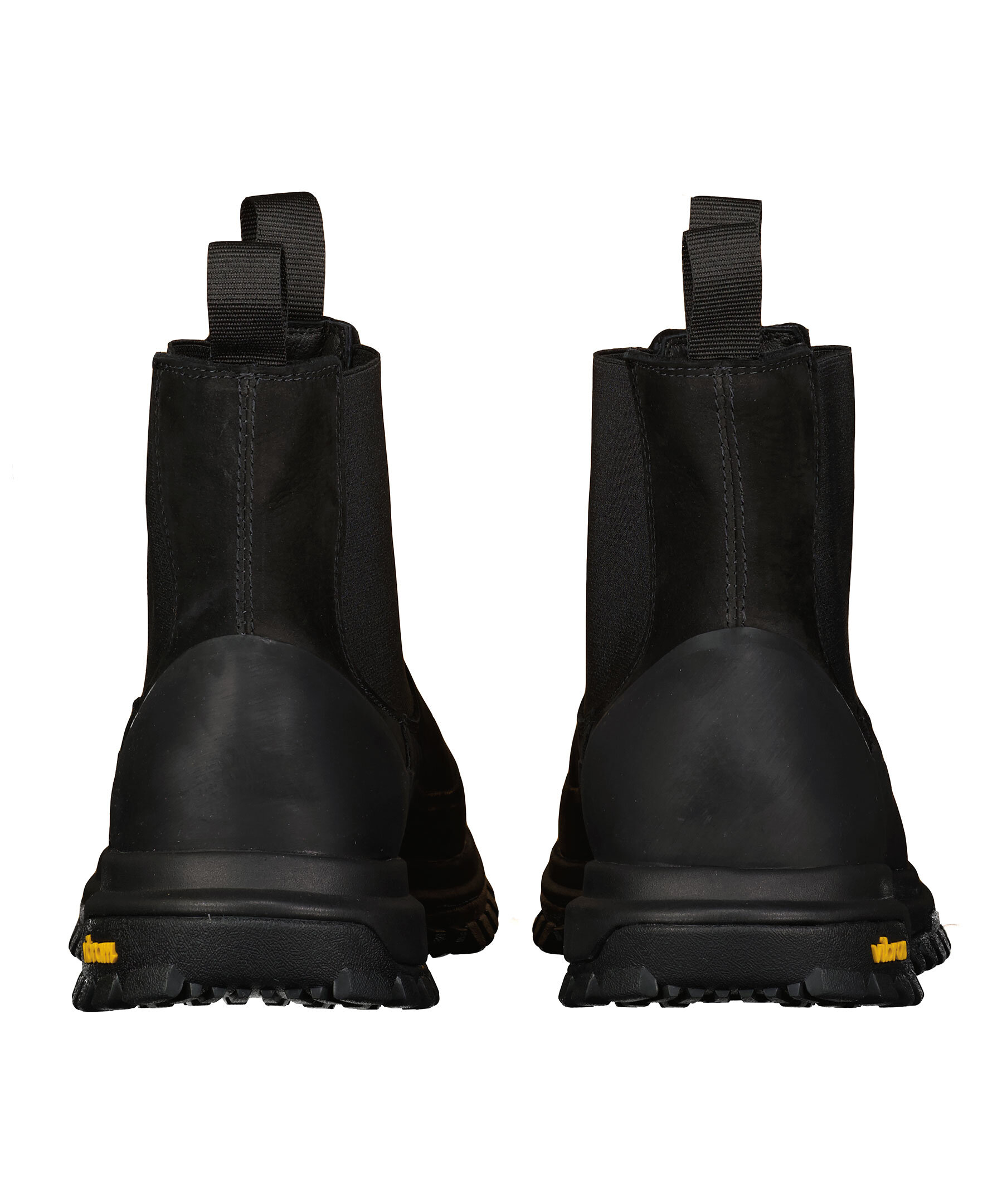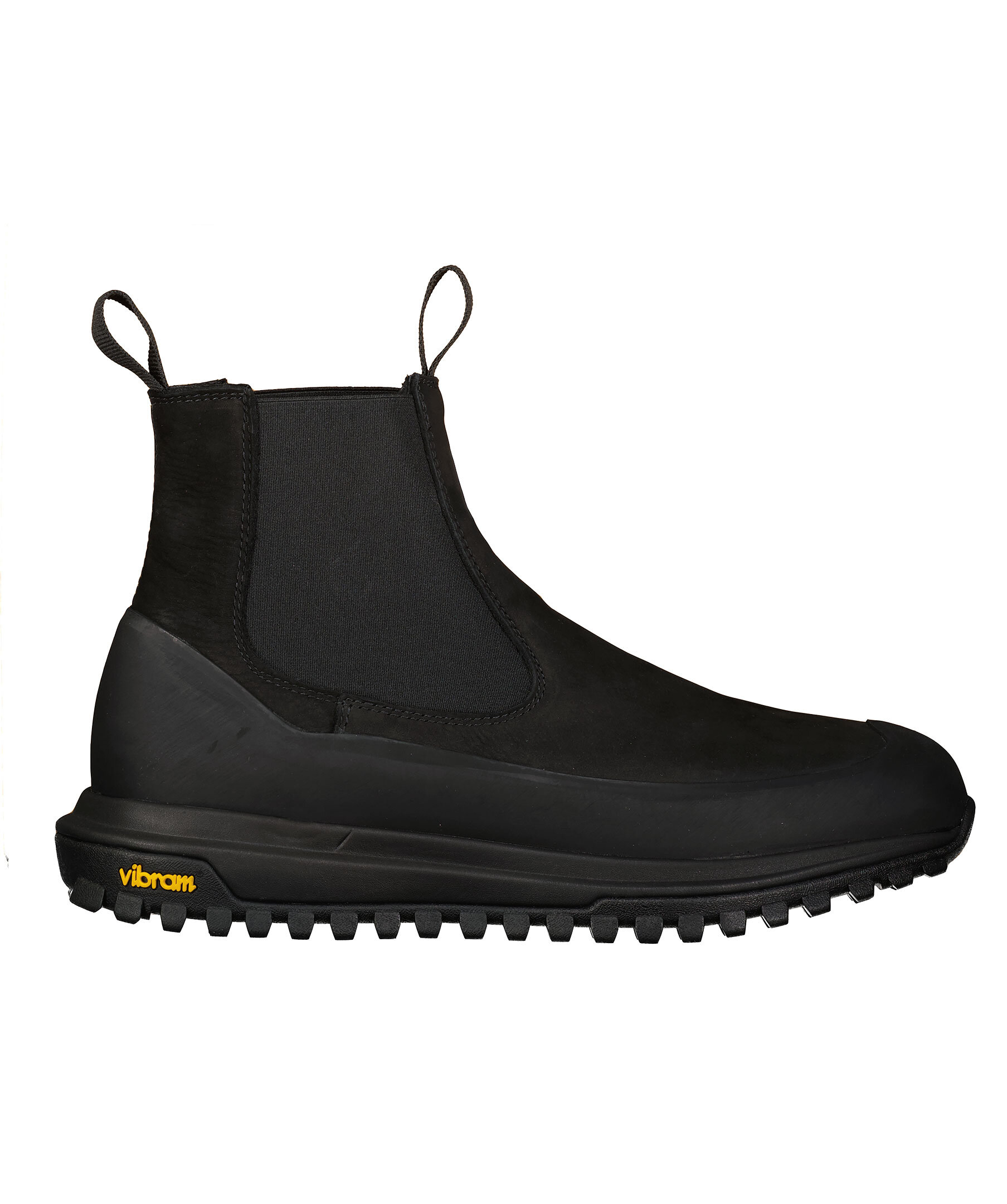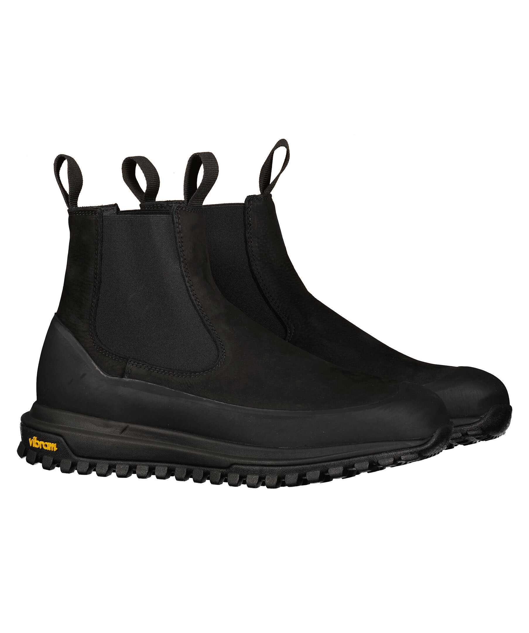 Svarta chelsea boots i mocka från Diemme. Grov sula från vibram. Gummerad kant som går en bit upp över skon nedtill så skorna håller sig torra.