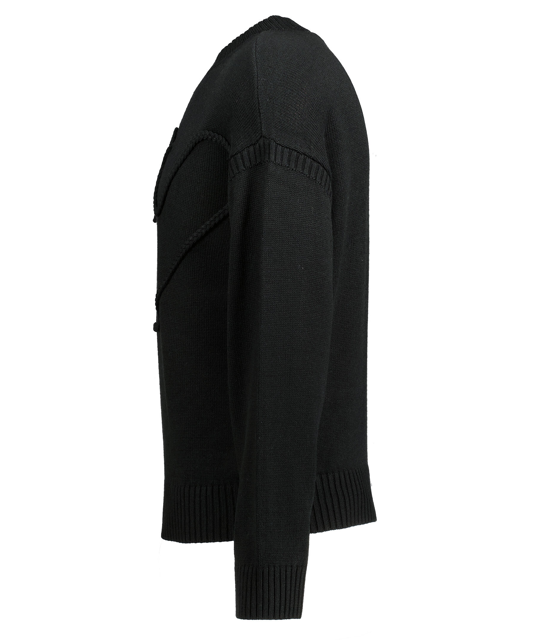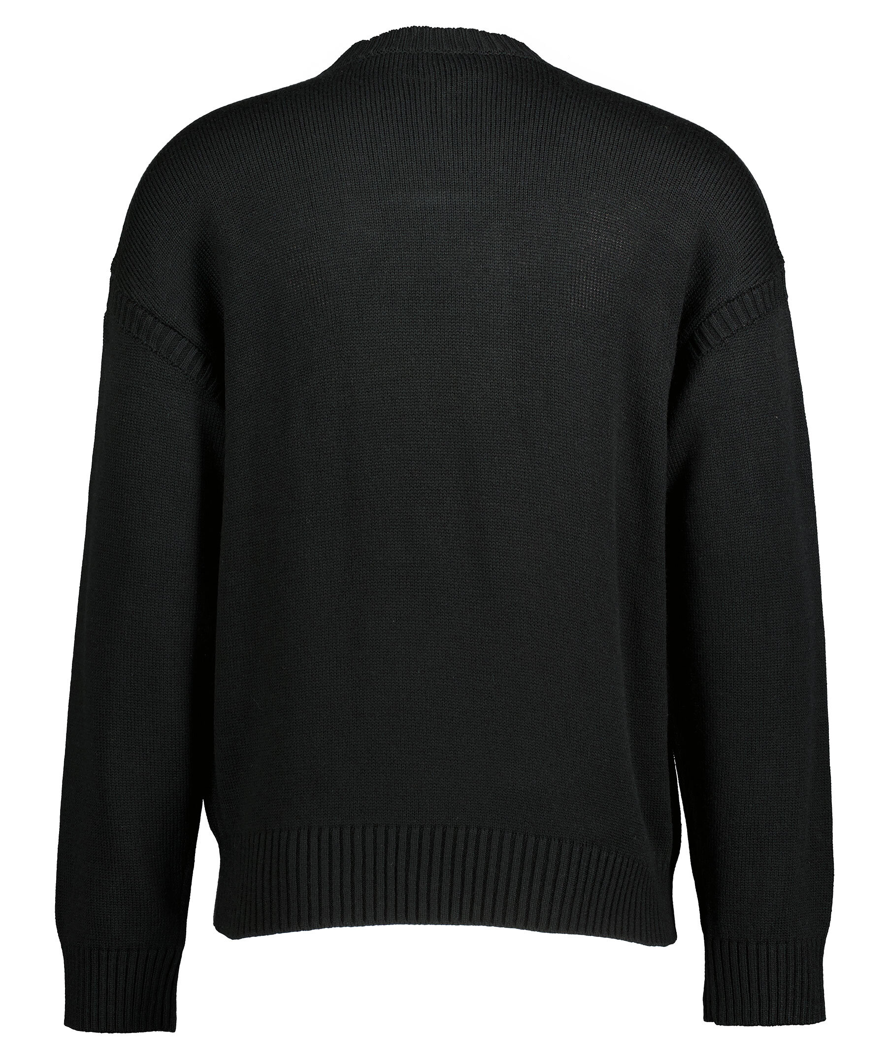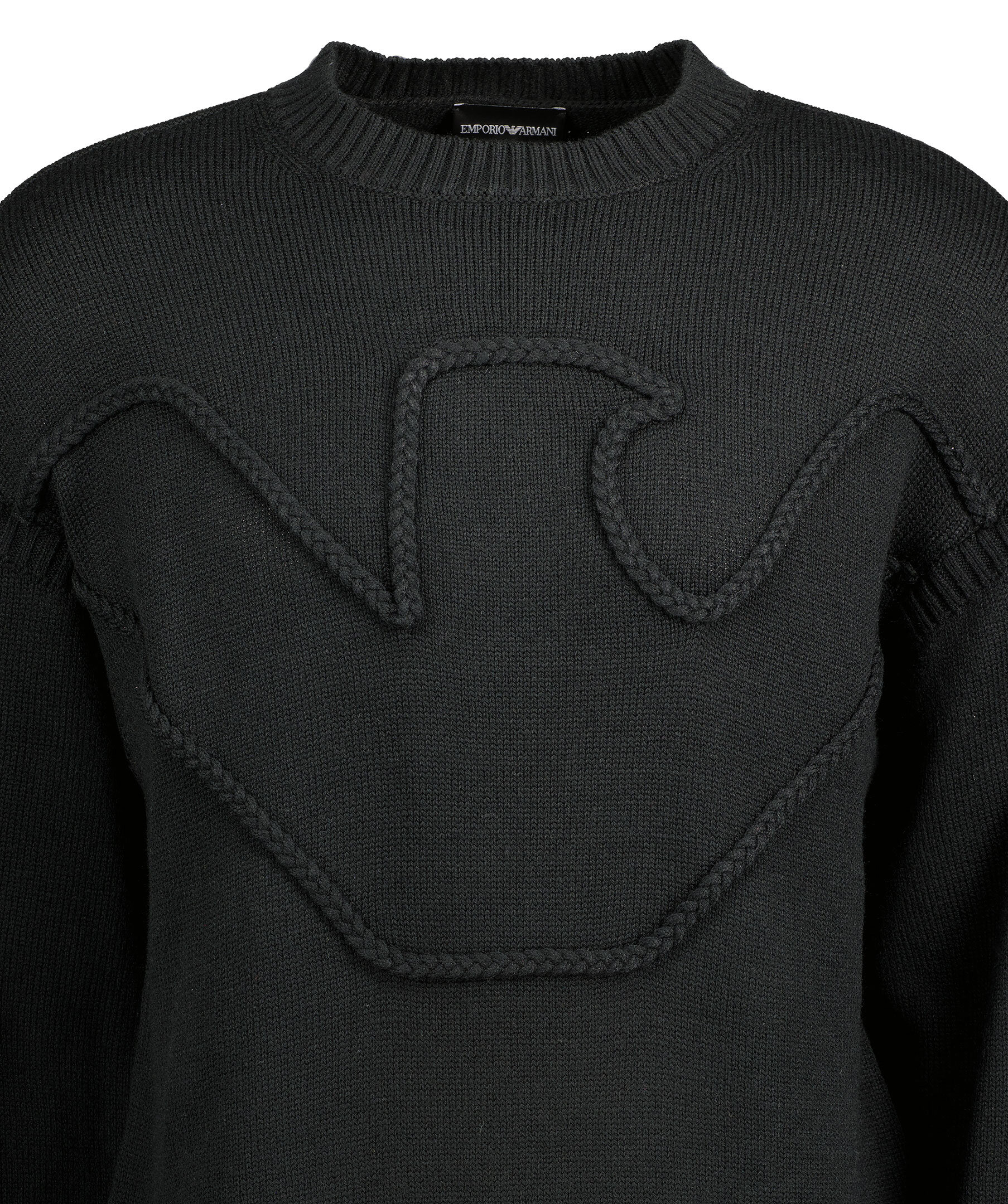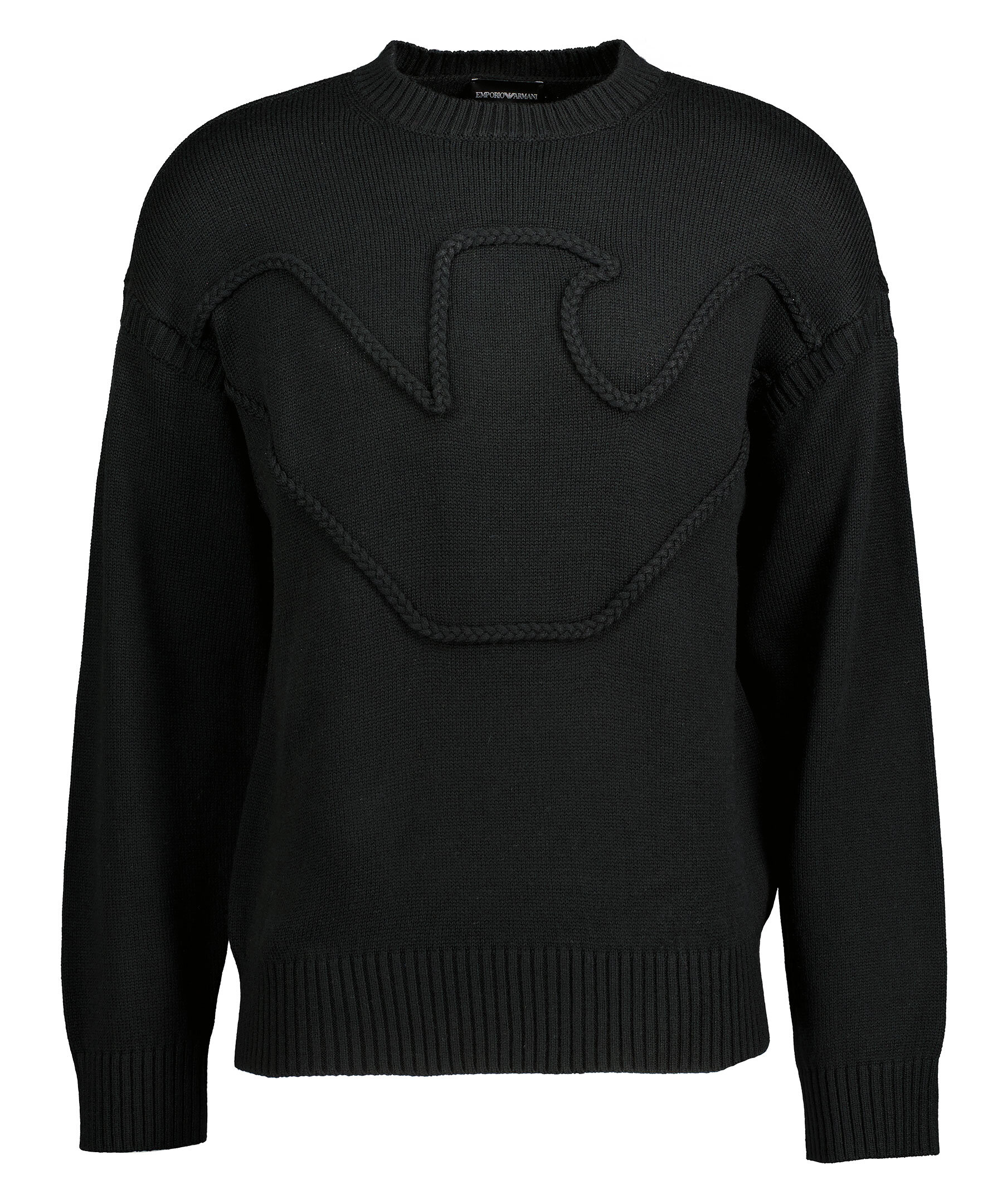 Svart stickad tröja från Emporio Armani. Tillverkad i en ullblandning. Tröjan har en flätat, utstickande motiv på framsidan i svart. Ribbstickad krage samt ärm och plaggslut.
