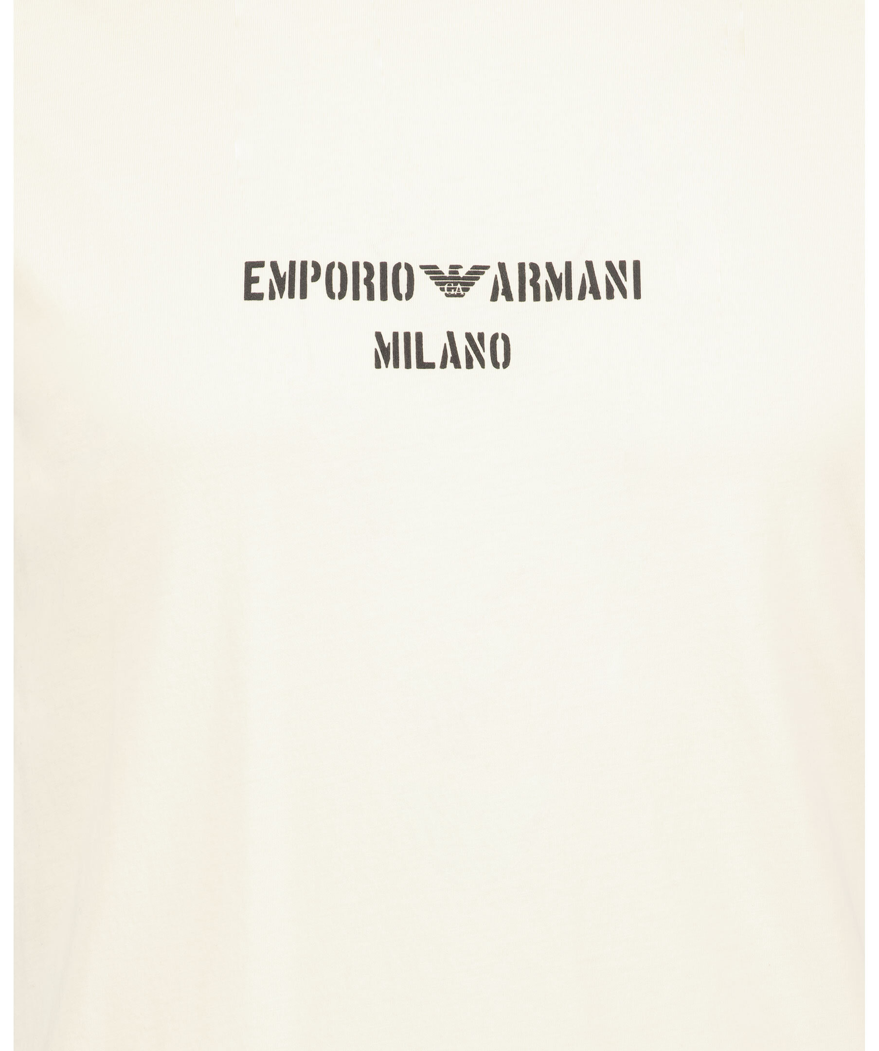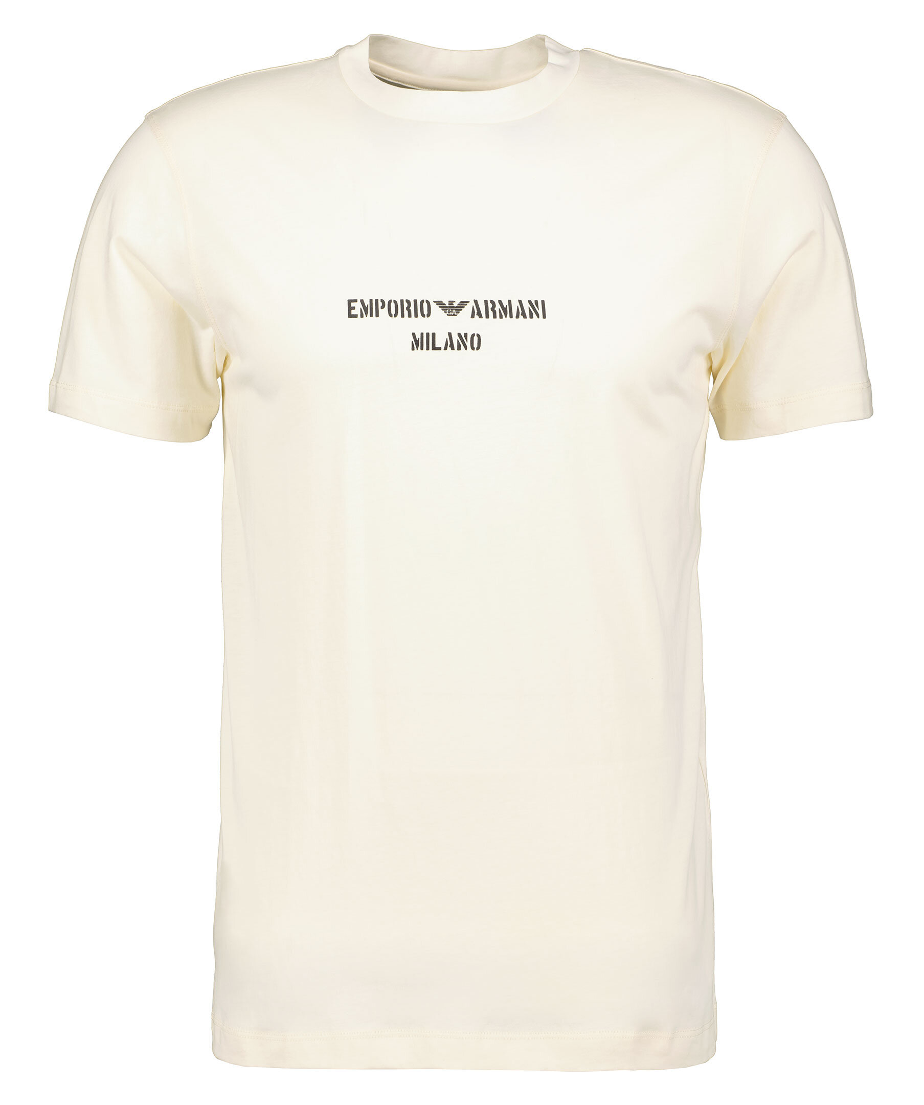 Krämvit t-shirt från Emporio Armani. Tillverkad i bomull. Svart, tryckt logotyp på bröstet och har en rundad halsringning.