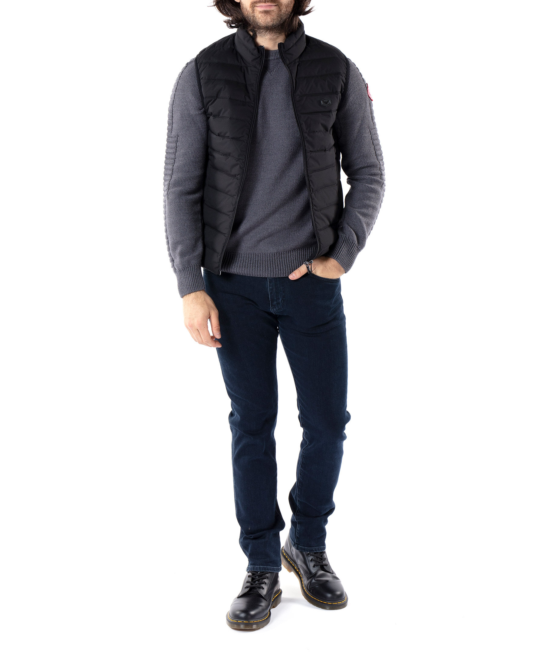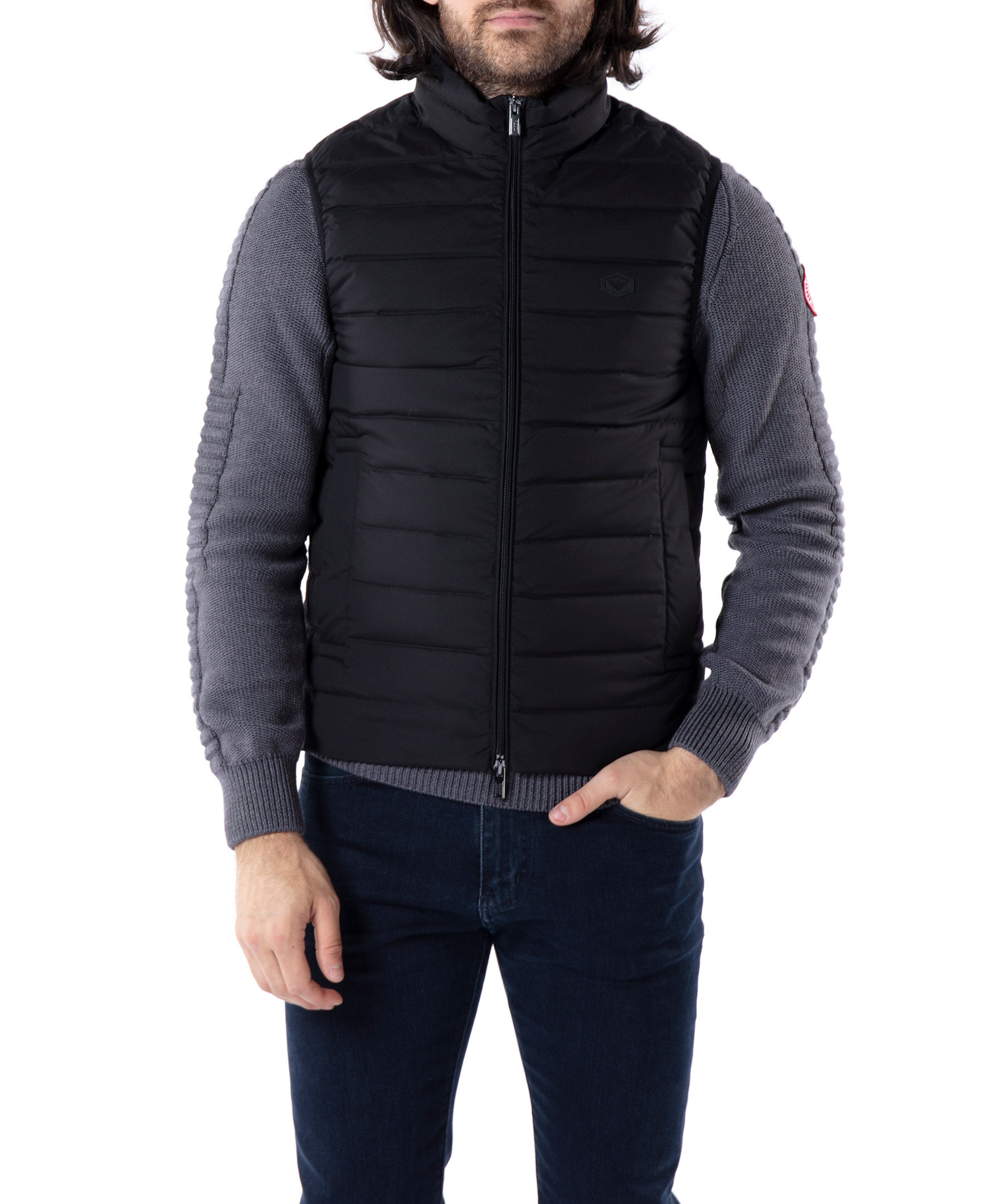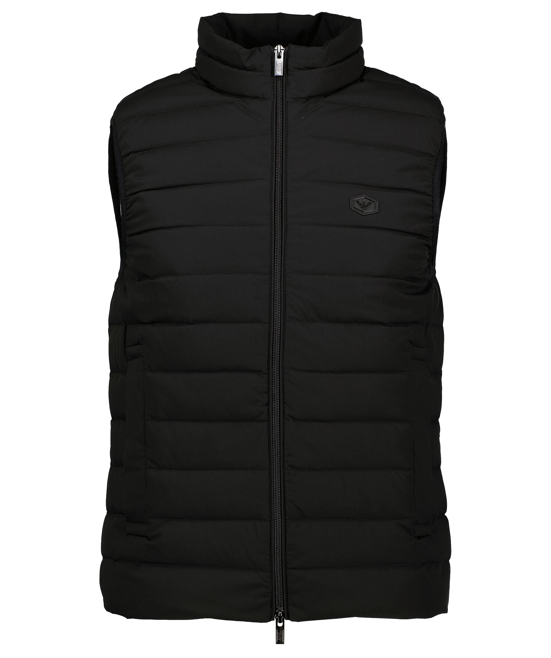 Svart matt dunväst från Emporio Armani. Stängs med tvåvägsdragkedja framtill. Två fickor fram som stängs med tryckknapp samt Innerficka med dragkedja. Svart logotyp på vänster bröst. Modellen är 185 cm lång och bär storlek 48.