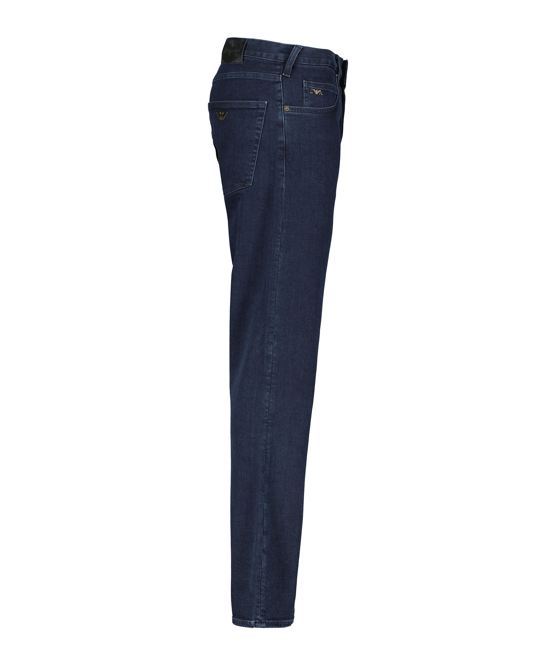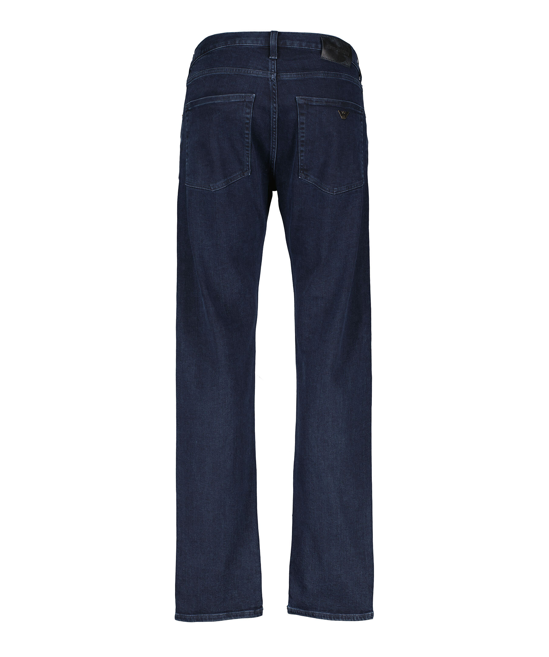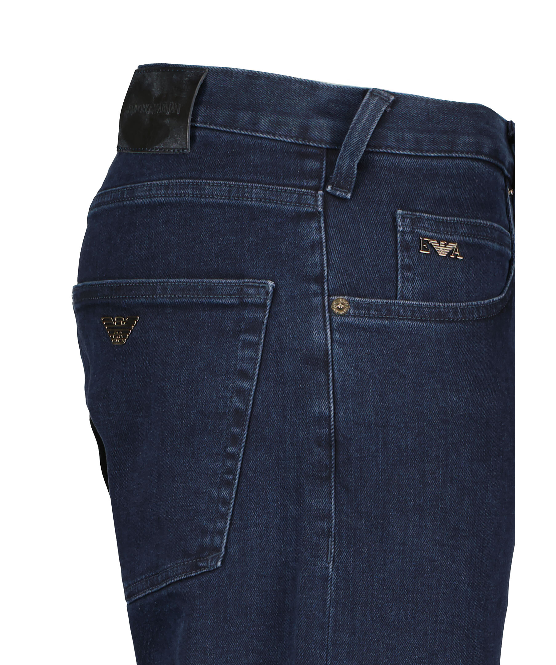 Mörkblåa jeans från Emporio Armani. Jeansen har bälteshällor i midjan, fem fickor, lapp med logotyp baktill på linningen samt logotyp i metall på myntfickan och ena bakfickan. Tillverkade i en stretchig bomullsblandning.