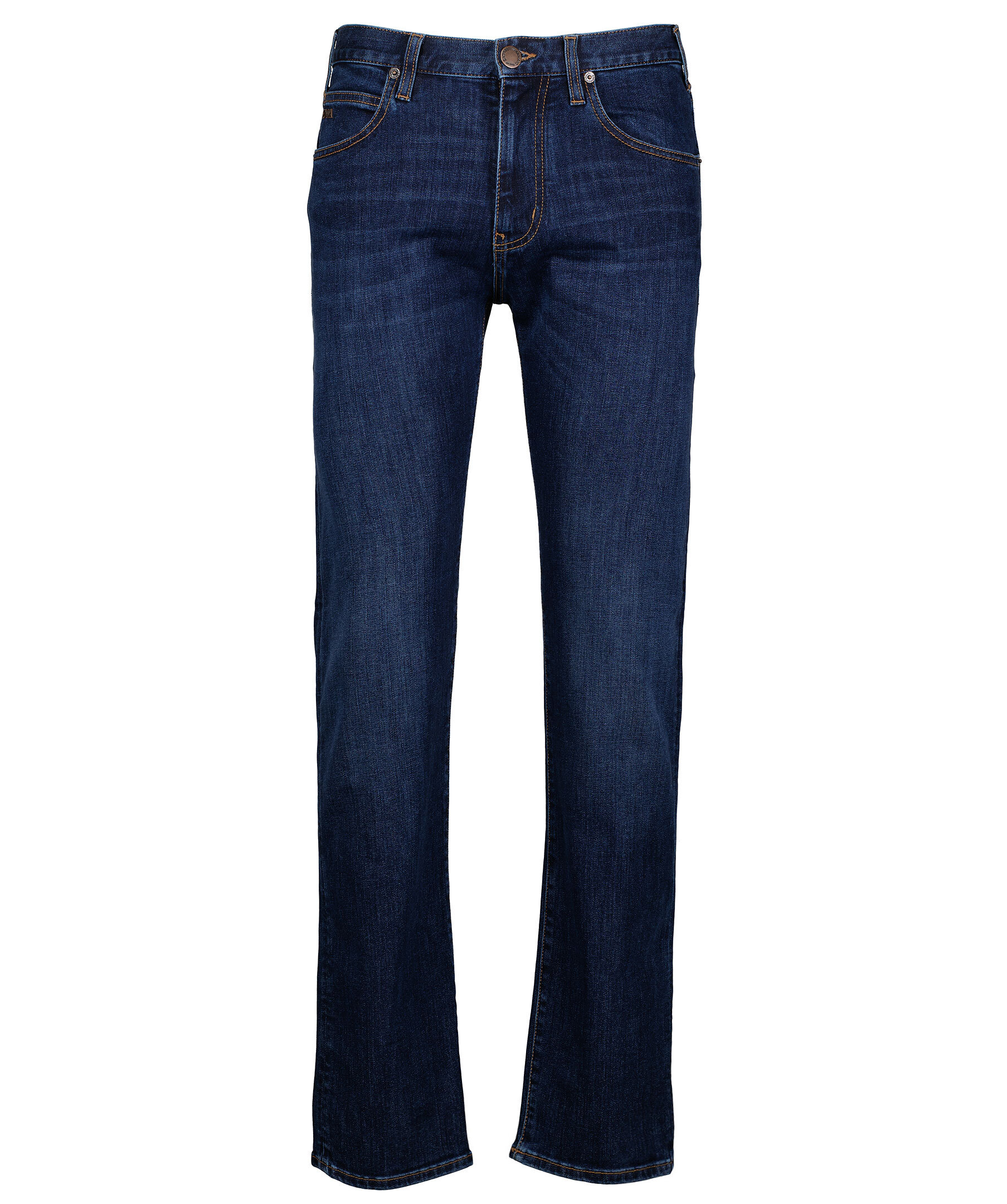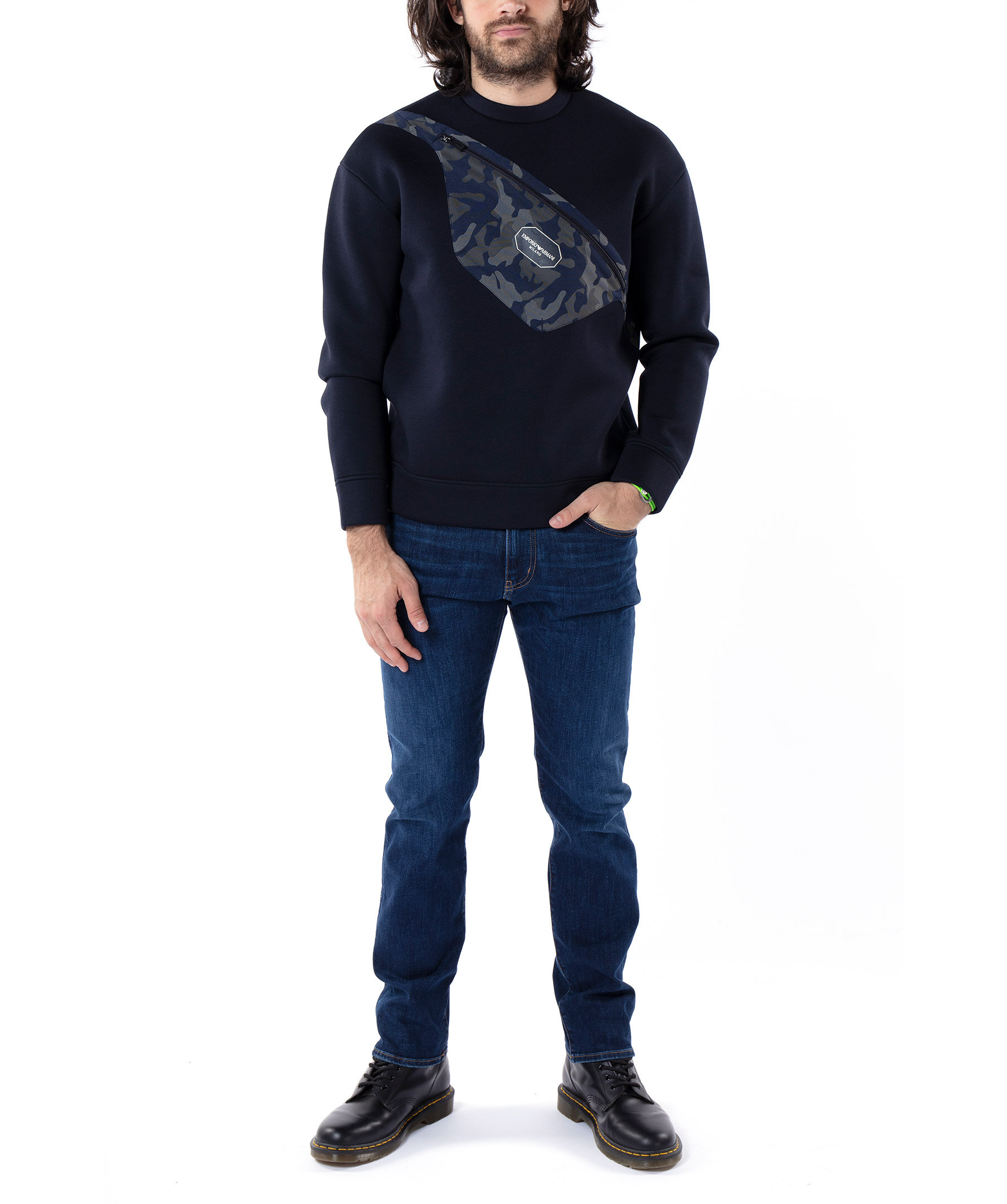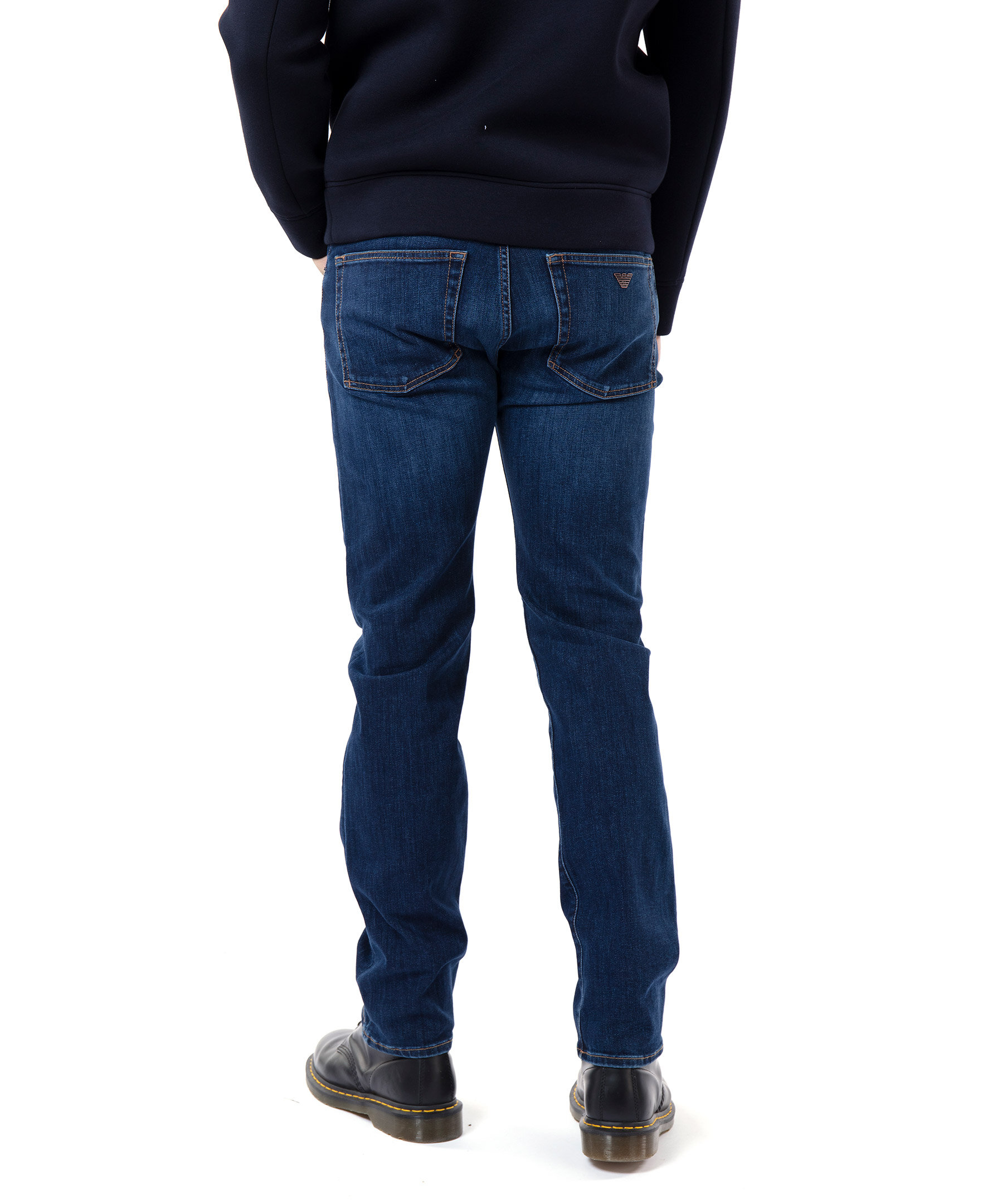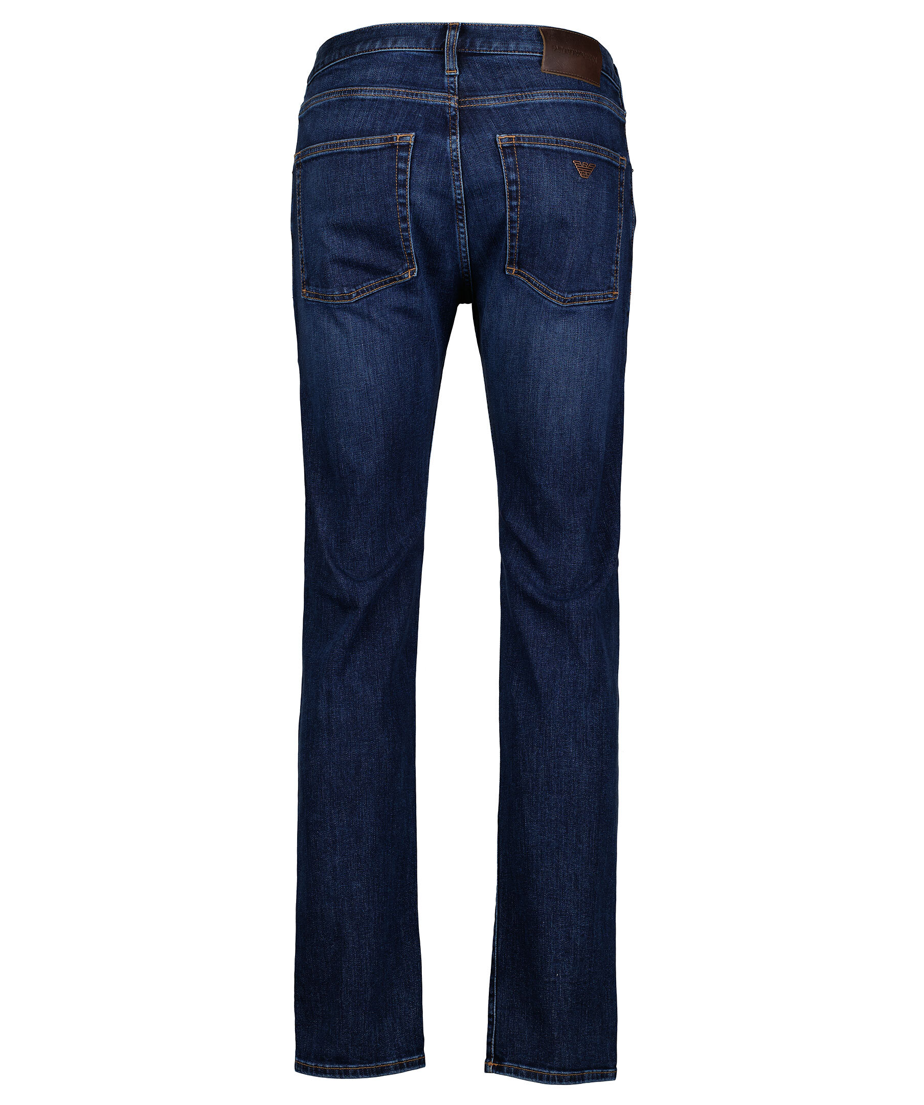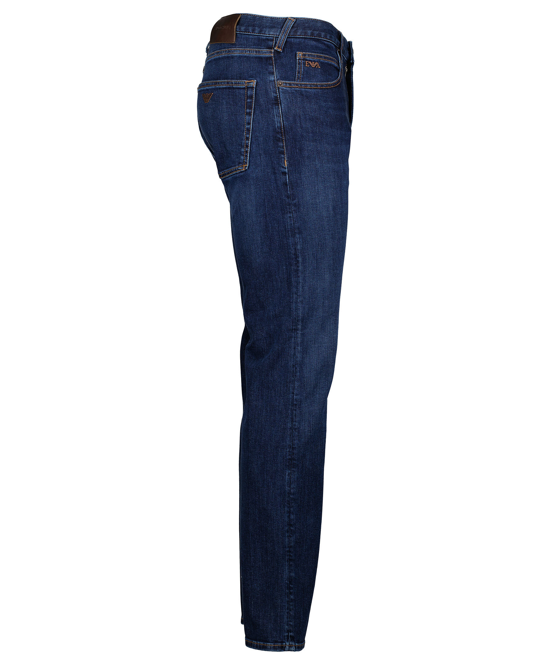 Mörkblå, Jeans med stretch från Emporio Armani. Femficksmodell, logotyp i metall på bakfickan och på den lilla fickan fram. Gylf med dold dragkedja och knapp. Hällor för bälte. Modellen är 185 cm lång och bär storlek 32.