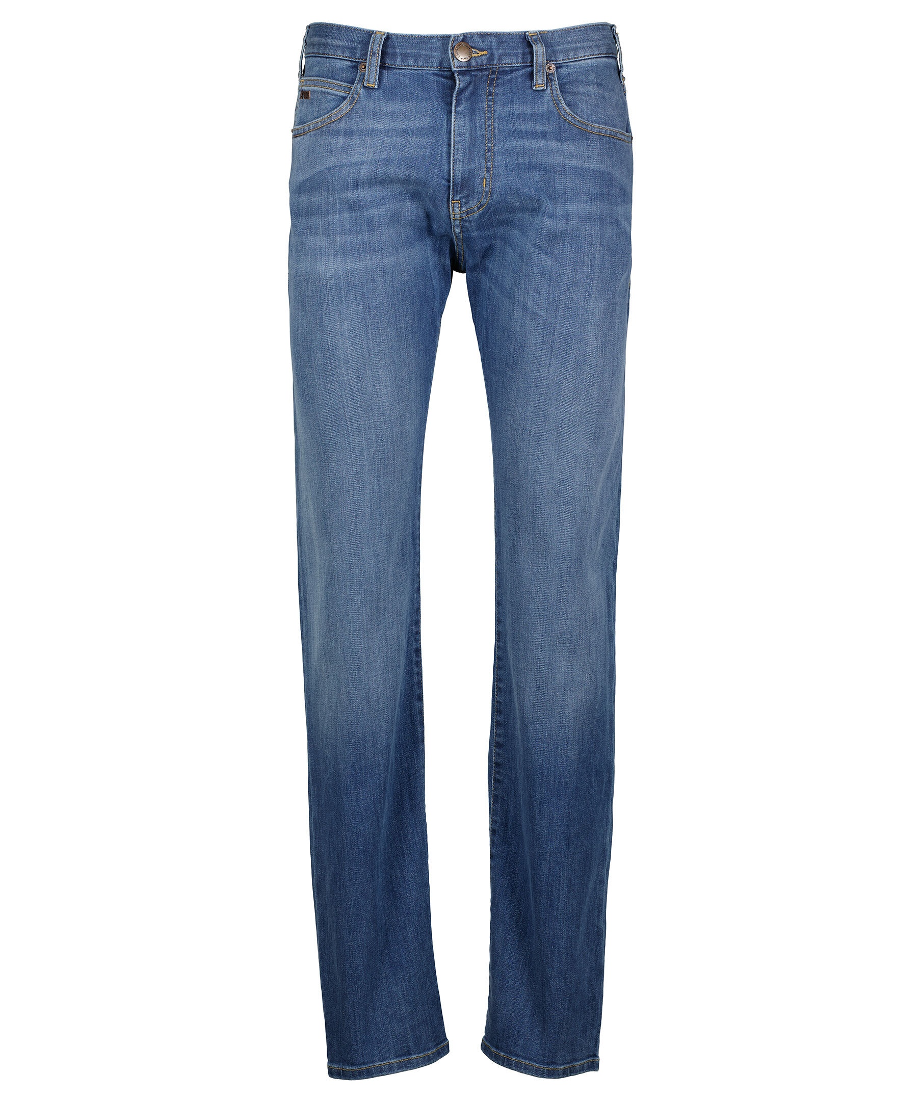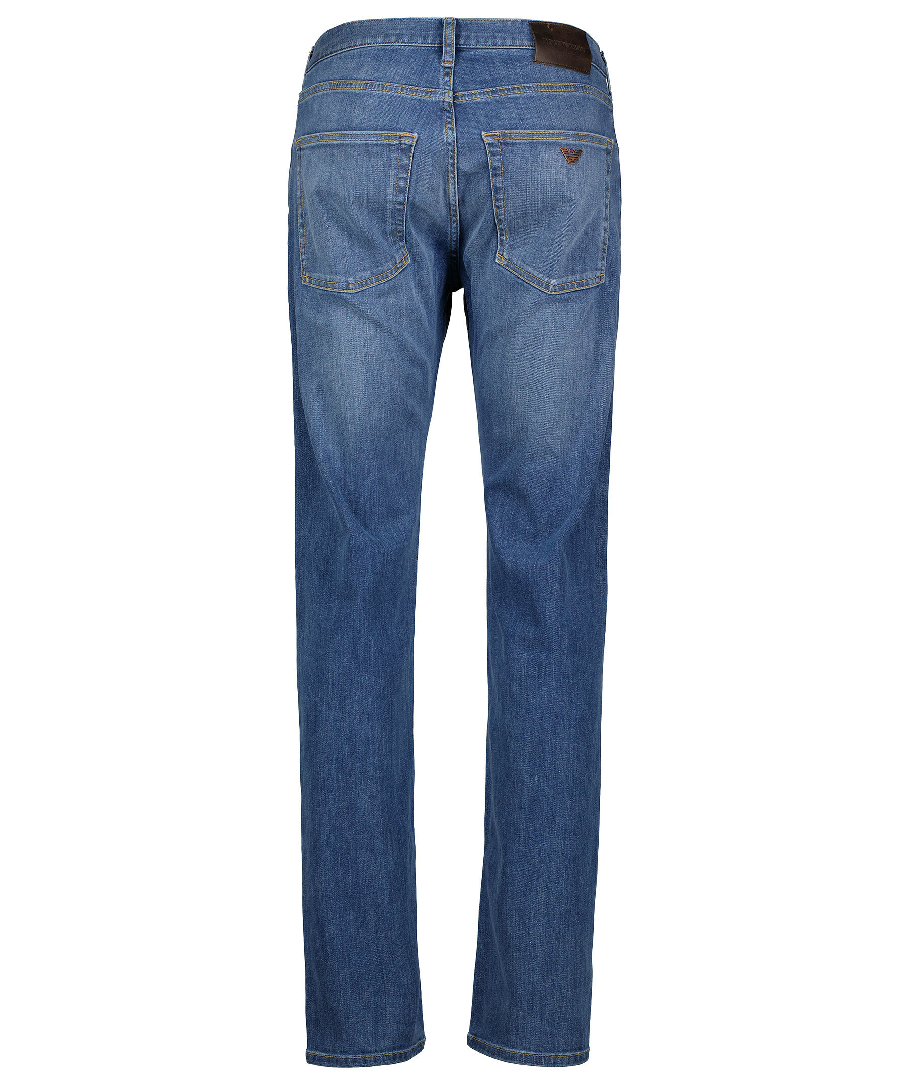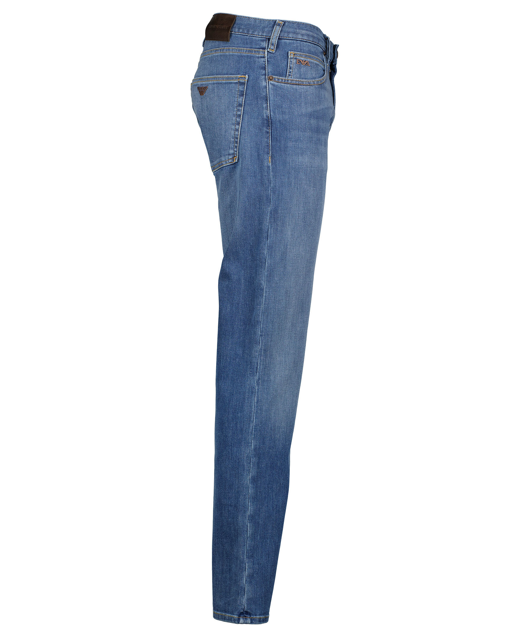 Ljusblå, tvättade jeans i regular fit från Emporio Armani. Tillverkade i bomullsstretch. Femficksmodell, logotyp i metall på bakfickan och på den lilla fickan fram. Gylf med dold dragkedja och knapp samt hällor för bälte.