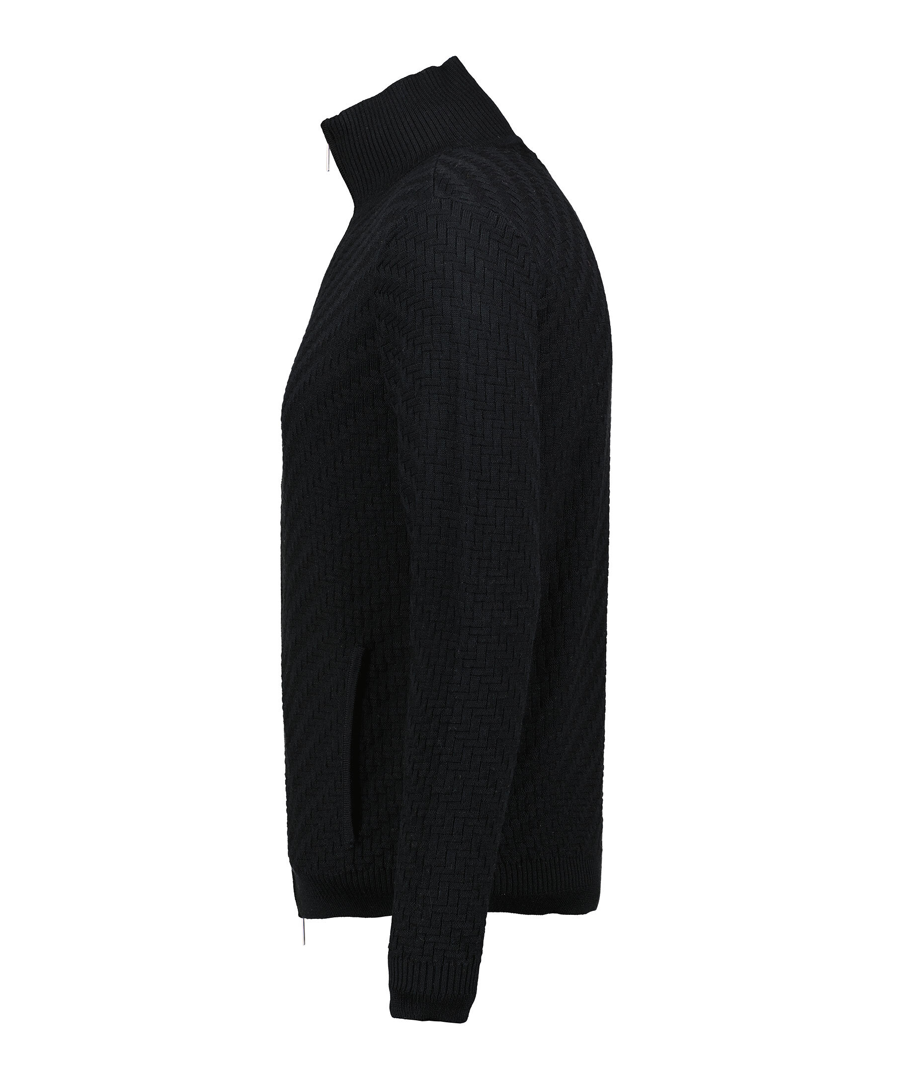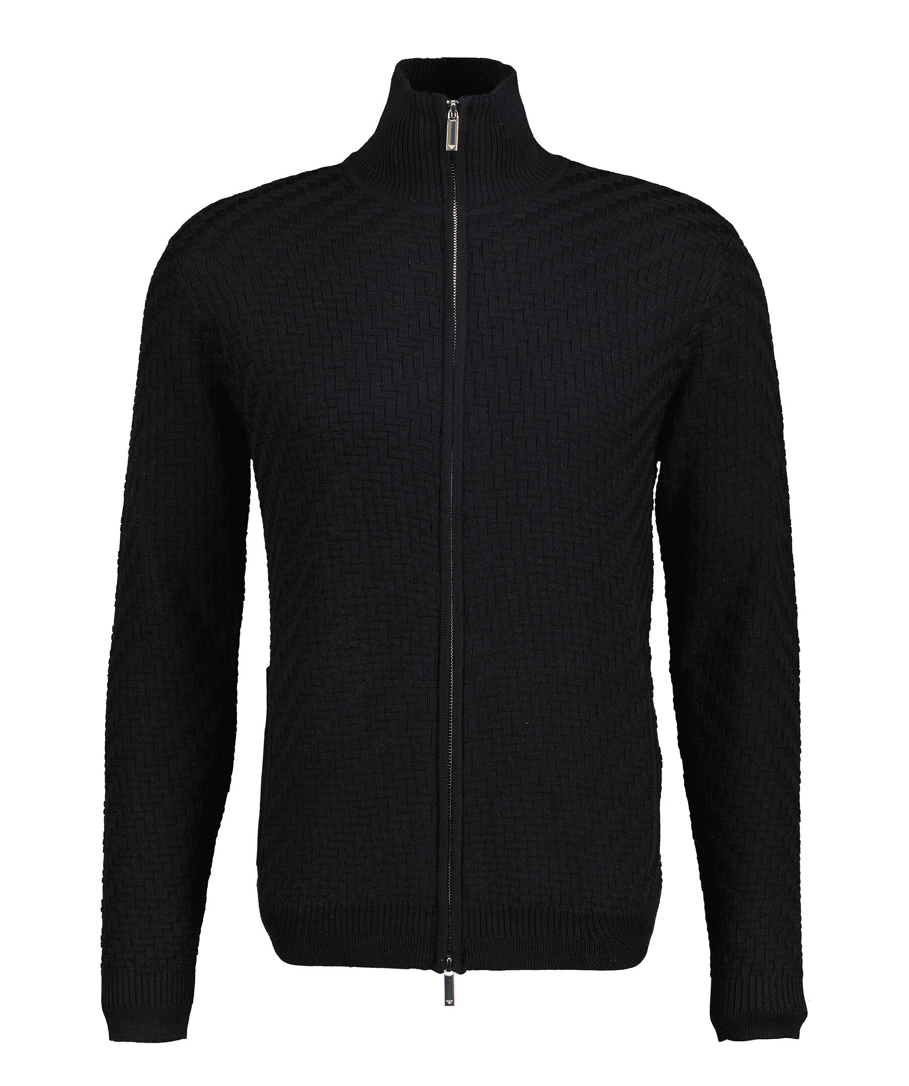 Svart stickad och mönstrad sweatshirt med hel tvåvägsdragkedja framtill från Emporio Armani. Tröjan har två sidfickor och är tillverkad i en ullblandning. Normal passform.