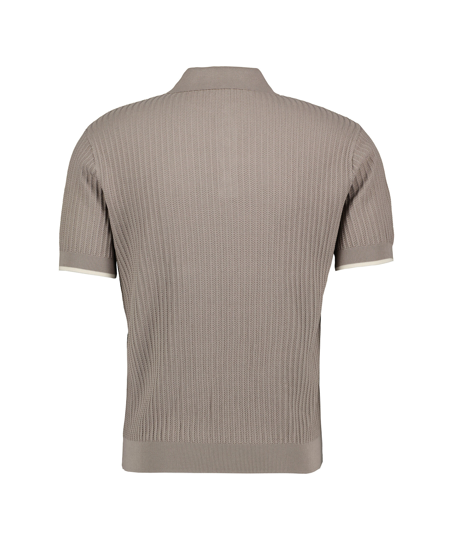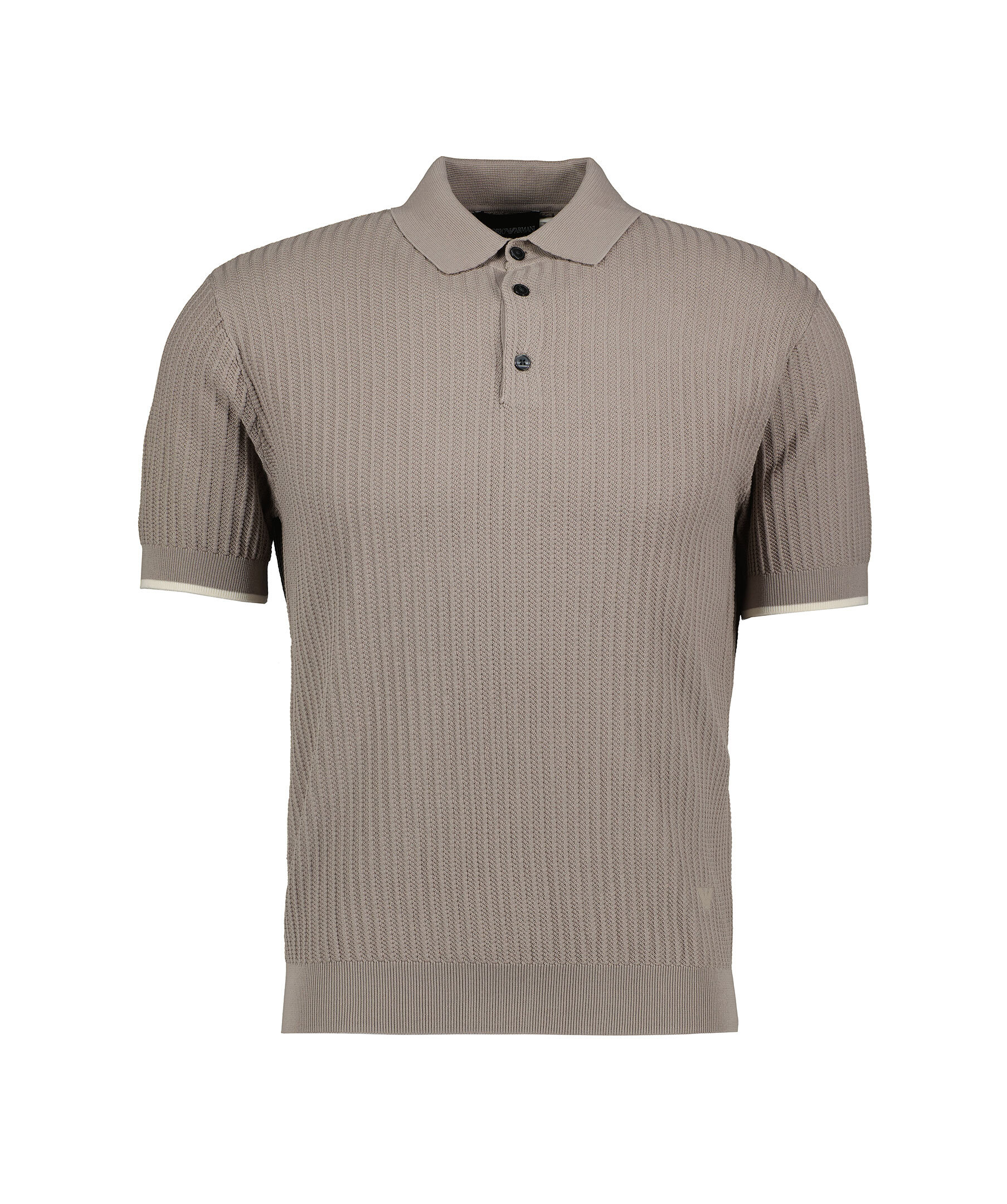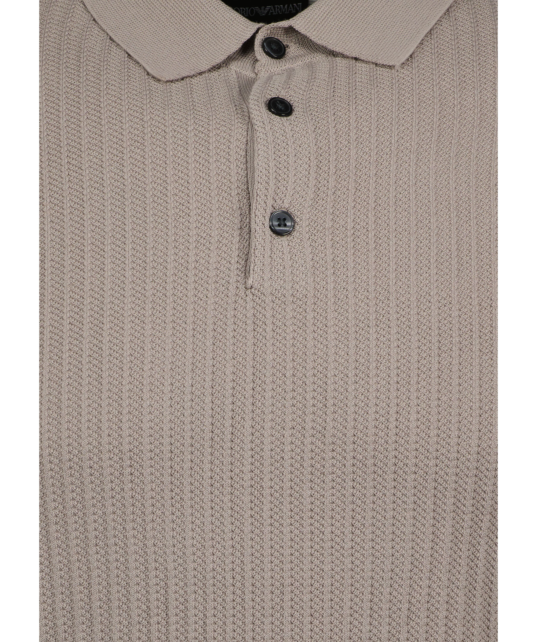Gråbrun pikétröja från Emporio Armani. Tre knappar framtill. Ribbstickad plaggslut, kontrasterande rand vid ärmslut. Tillverkad i 100% bomull.