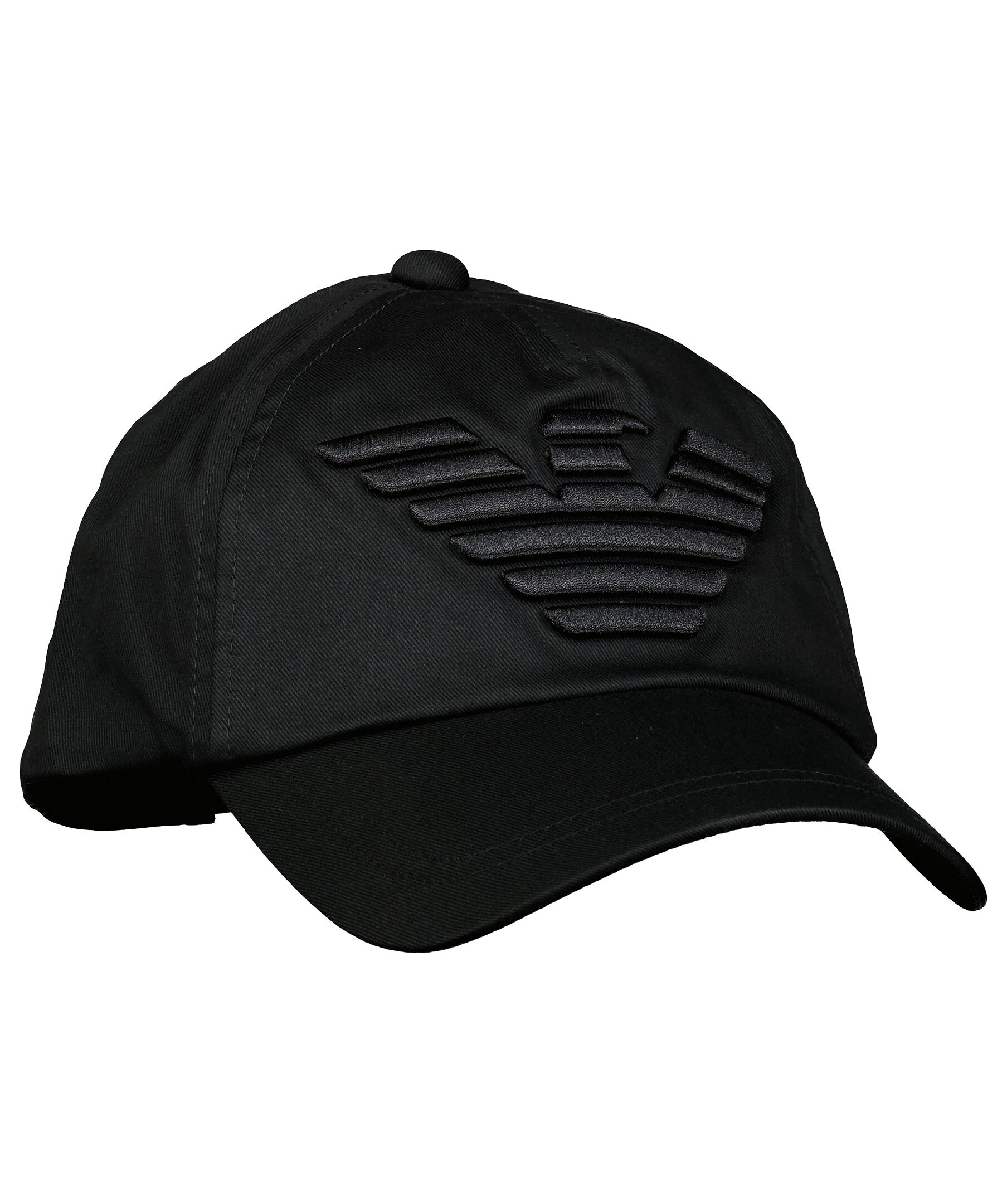 Svart keps från Emporio Armani i bomull. Stor, broderad logotyp i svart fram. Kepsens skärm är böjd och det går att justera kepsen baktill med spänne i plast.
