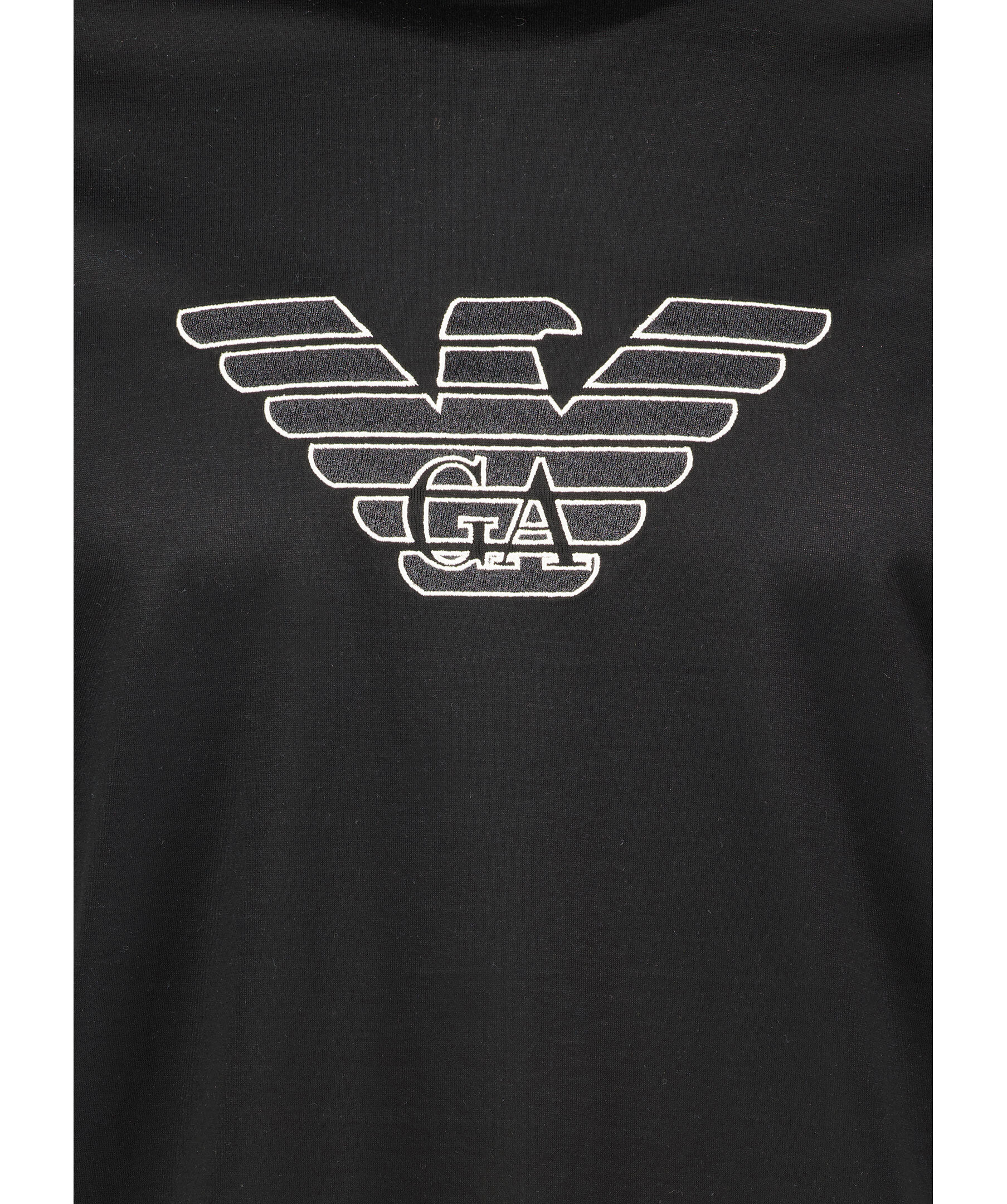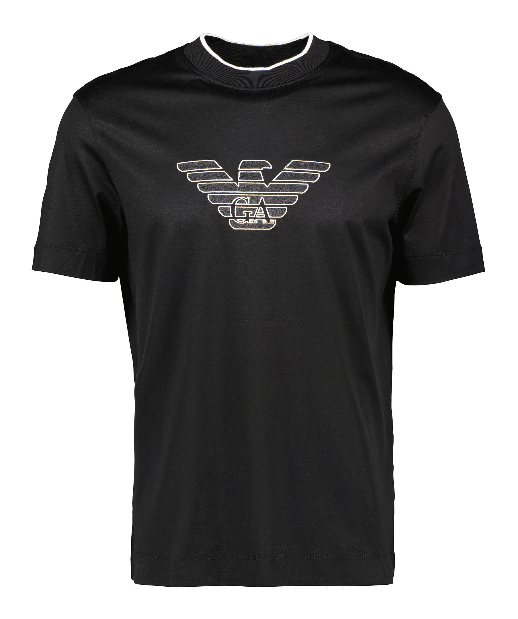 Svart t-shirt från Emporio Armani. Stor, broderad logotyp på bröstet, vit tunn rand runt halsringningen. Avslappnad passform. Tillverkad i en tunn och luftig lyocell- och bomullsblandning.