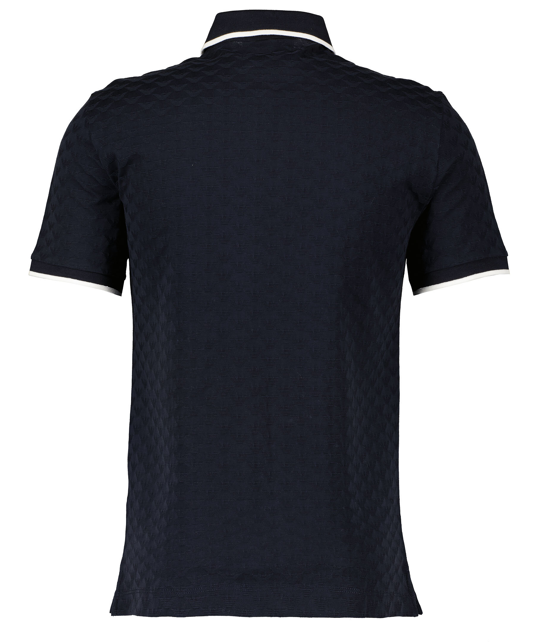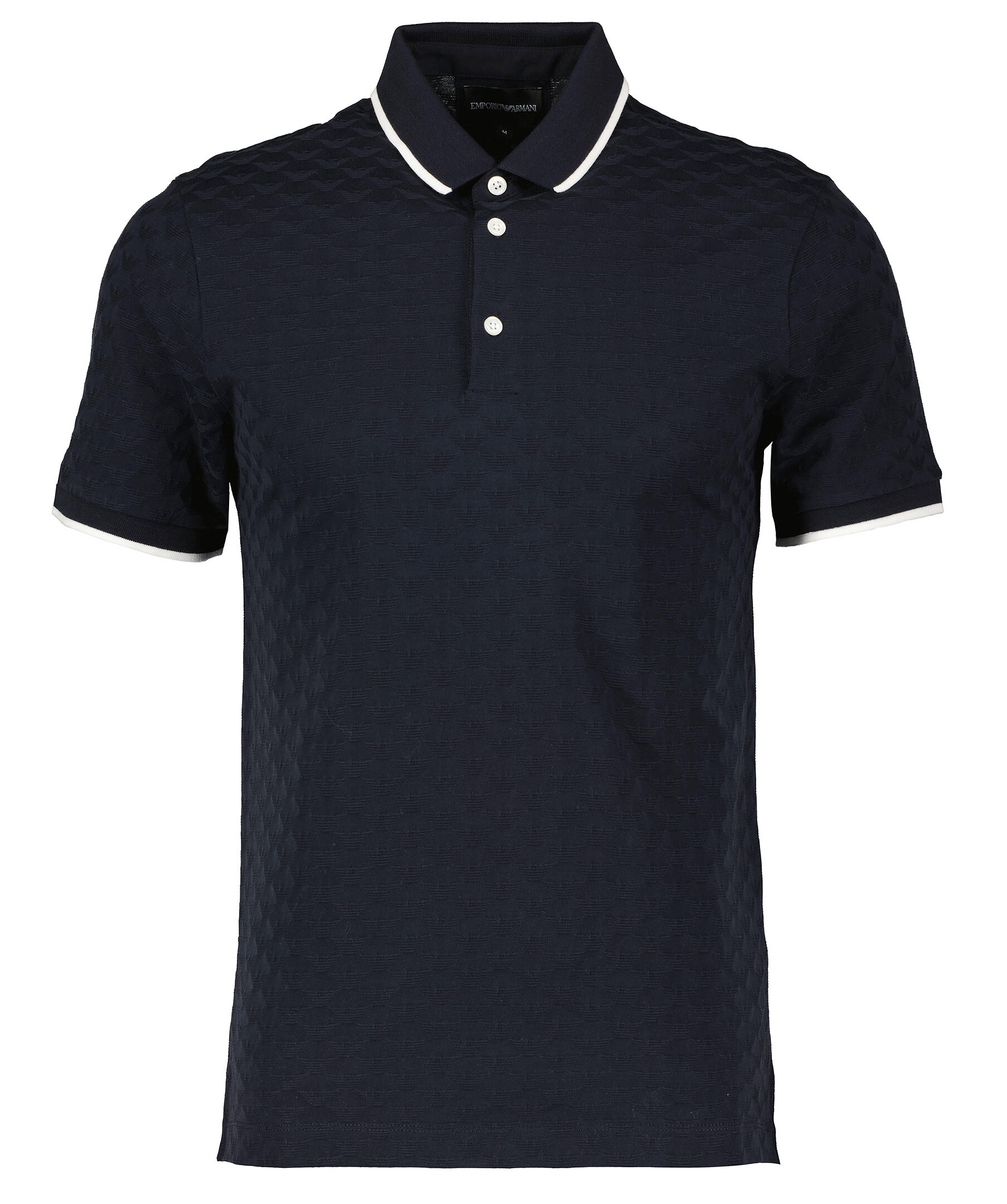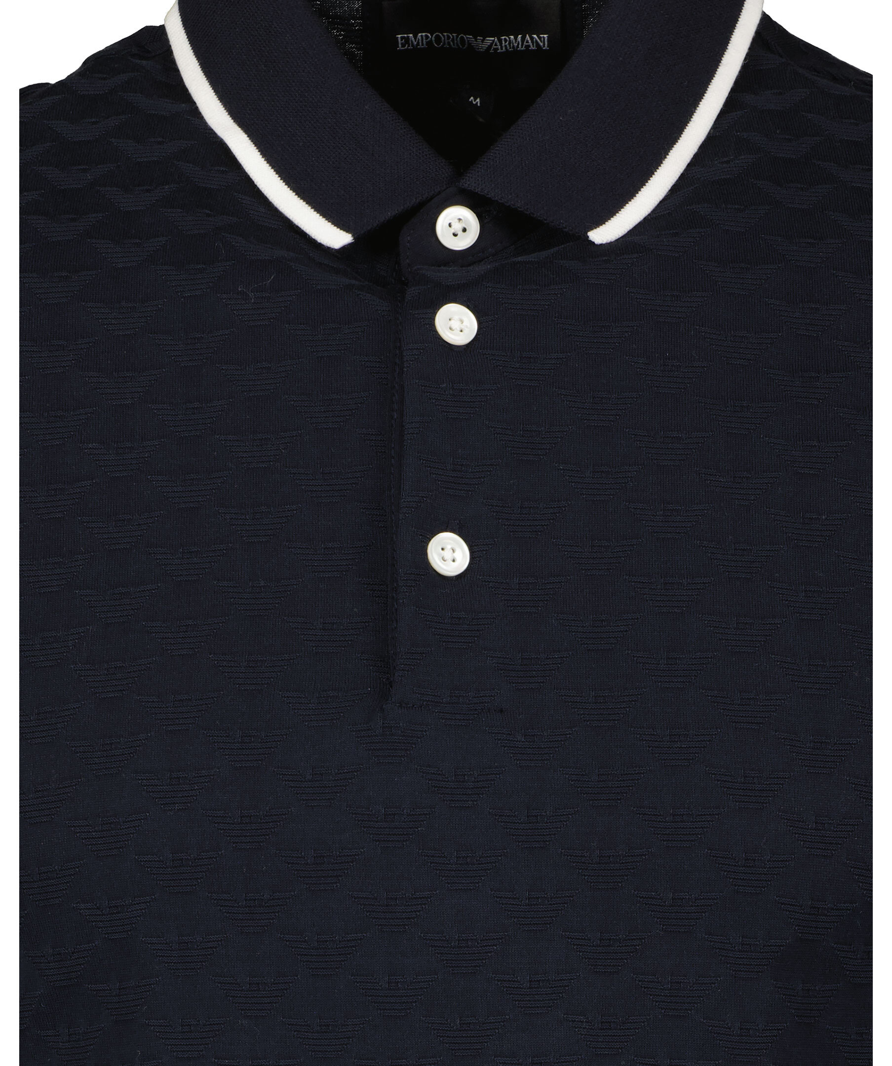Marinblå pikétröja med korta ärmar från Emporio Armani. Tillverkad i 100% bomull och har en krage och ärmslut med vita, smala kanter och tre vita knappar fram. Mönstrat, tyg med upphöjda logotyper över hela pikétröjan. Korta slitsar i sidorna och tunn mudd i ärmslut.