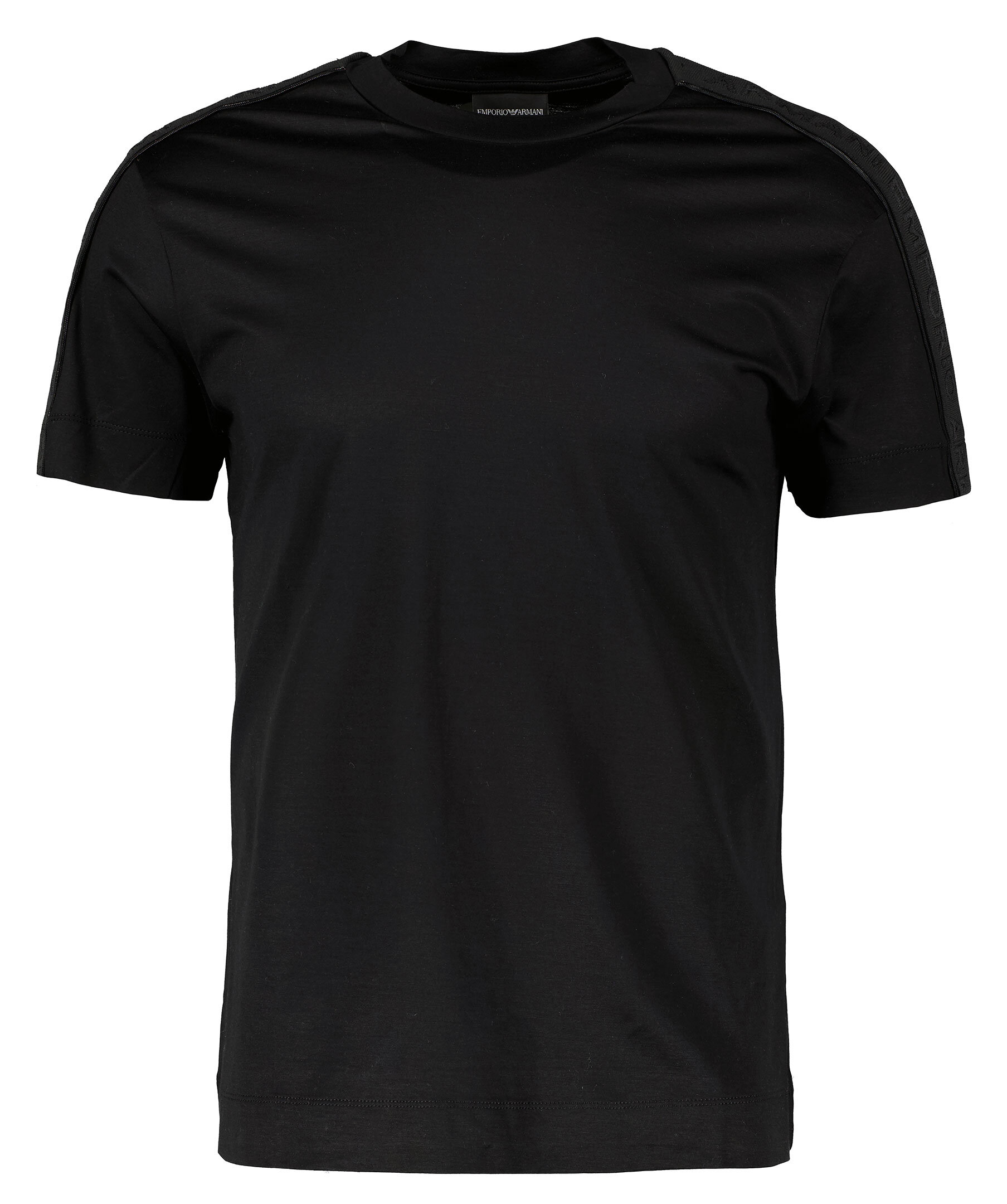 Svart t-shirt från Emporio Armani. Tillverkad i lyocell och bomullsblandning och har en rundad halsringning. Svart, bred revär med svarta logotyper längs ärmarna.