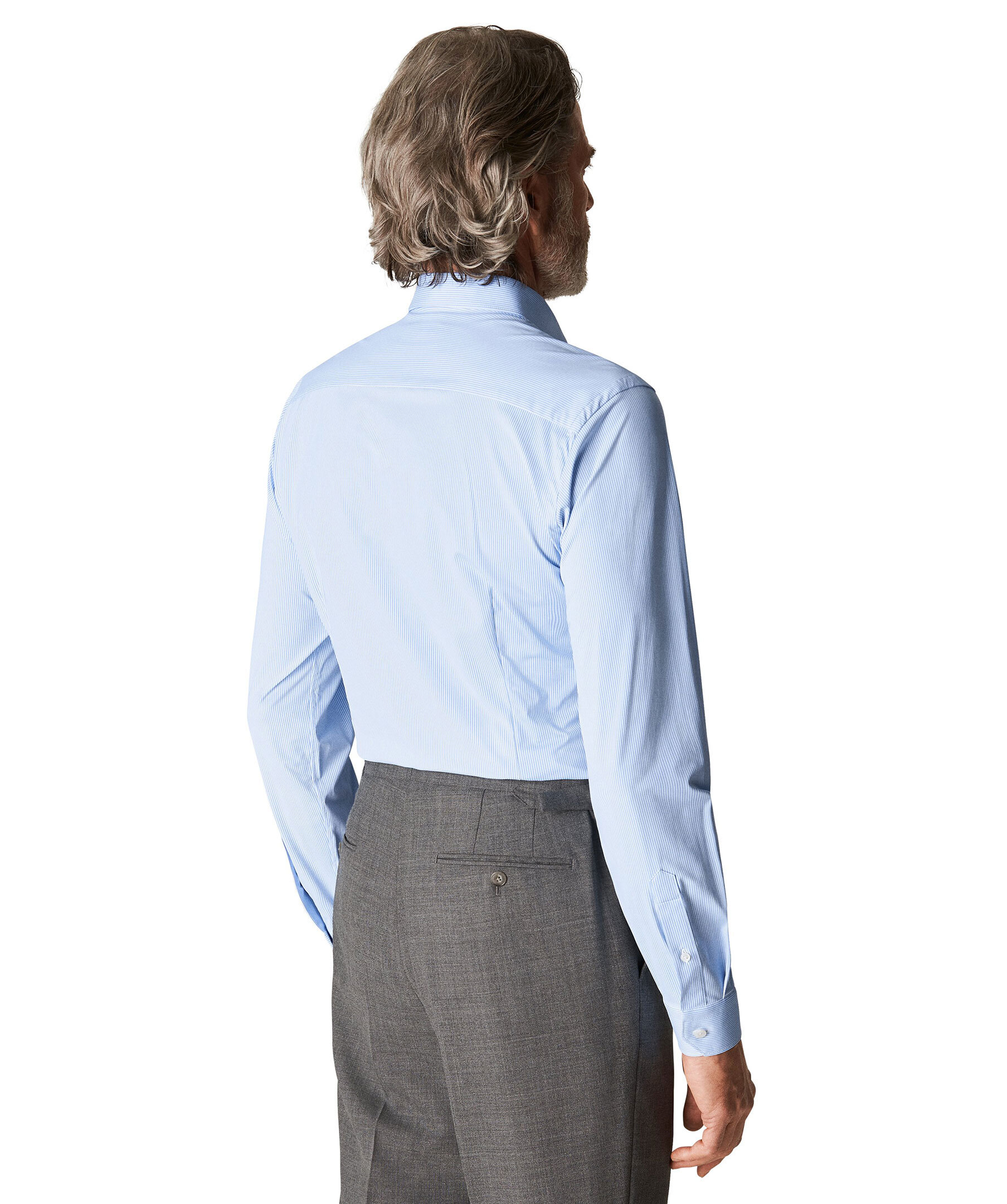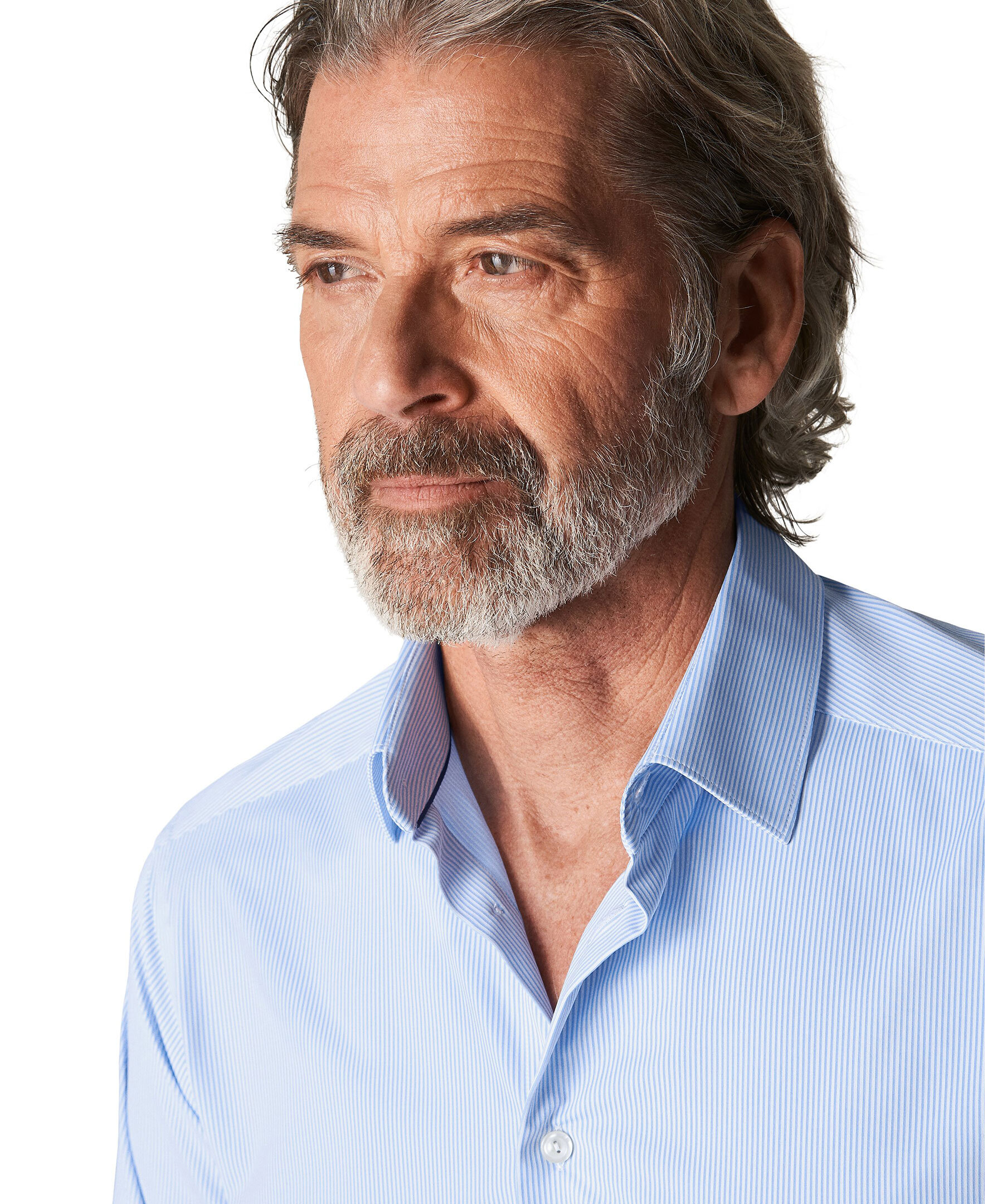 Vår innovativa skjorta i fyrvägsstretch – en stilfull businessklassiker framtagen för maximal bekvämlighet. Skjortan är tillverkad i ett mycket mjukt och elastiskt polyamidgarn som är återvunnet och förstärkt med elastan. Den är vävd i ett diskret mikromönster för maximal flexibilitet och god andningsförmåga.
