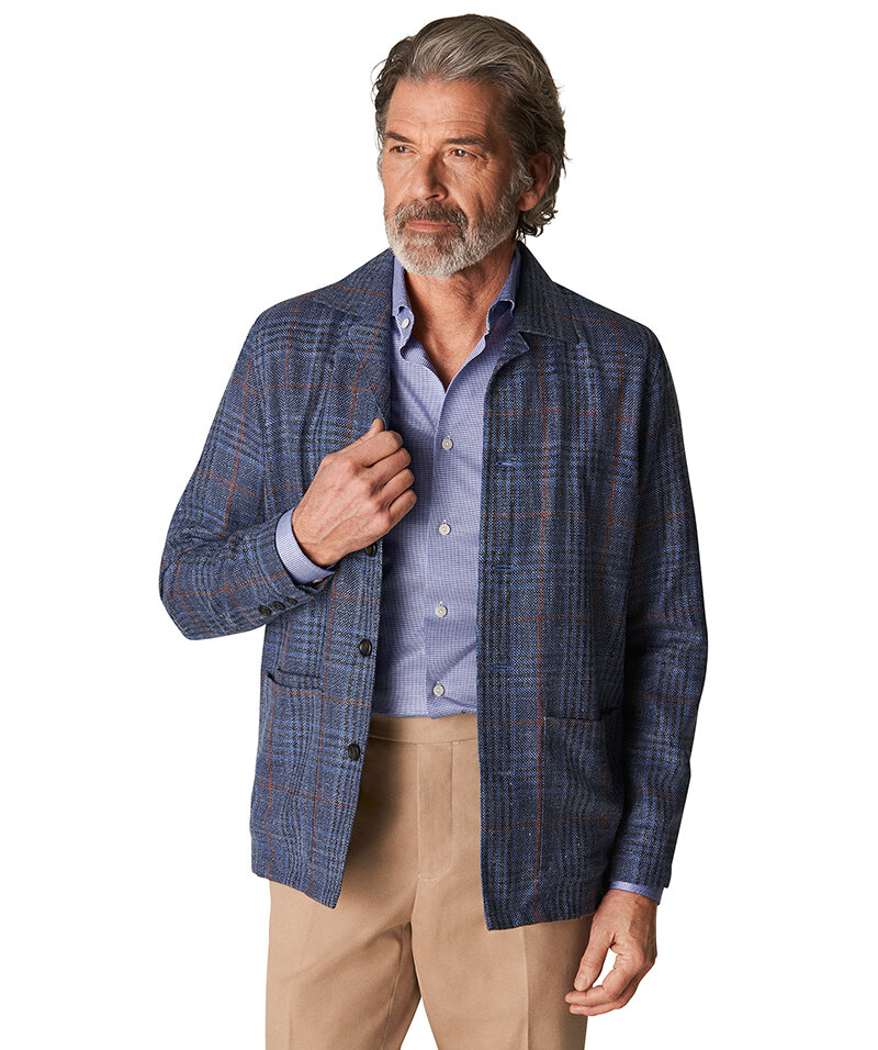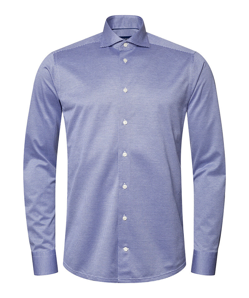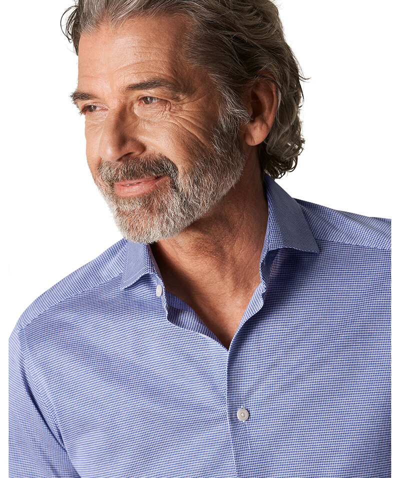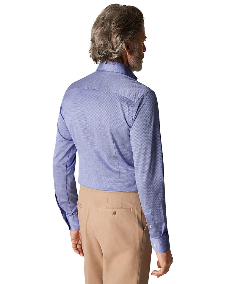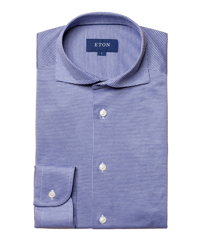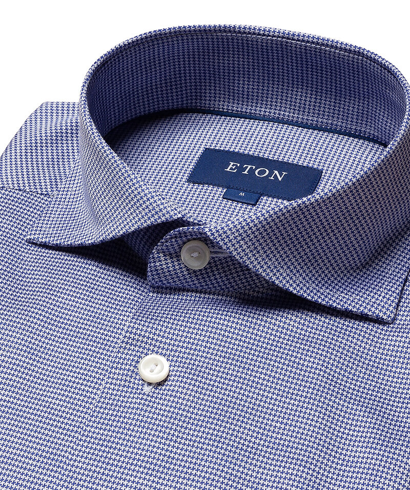 Skjorta från Eton tillverkad i ett skimrande, fint tyg stickat av Filo di Scozia-garn, med ett diskret hundtandsmönster. En business casual-klassiker med naturlig stretch, god andningsförmåga och hög bekvämlighet.
