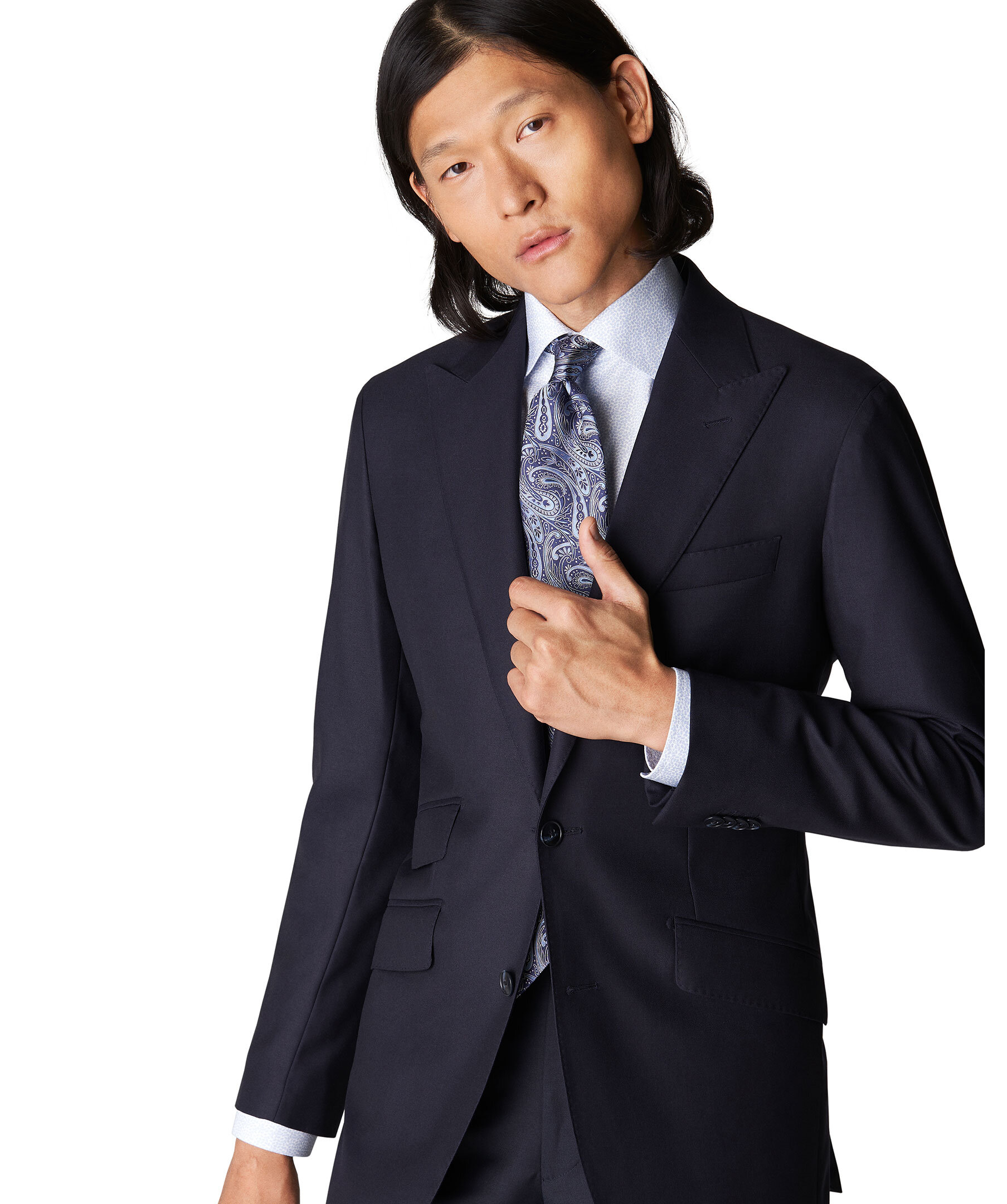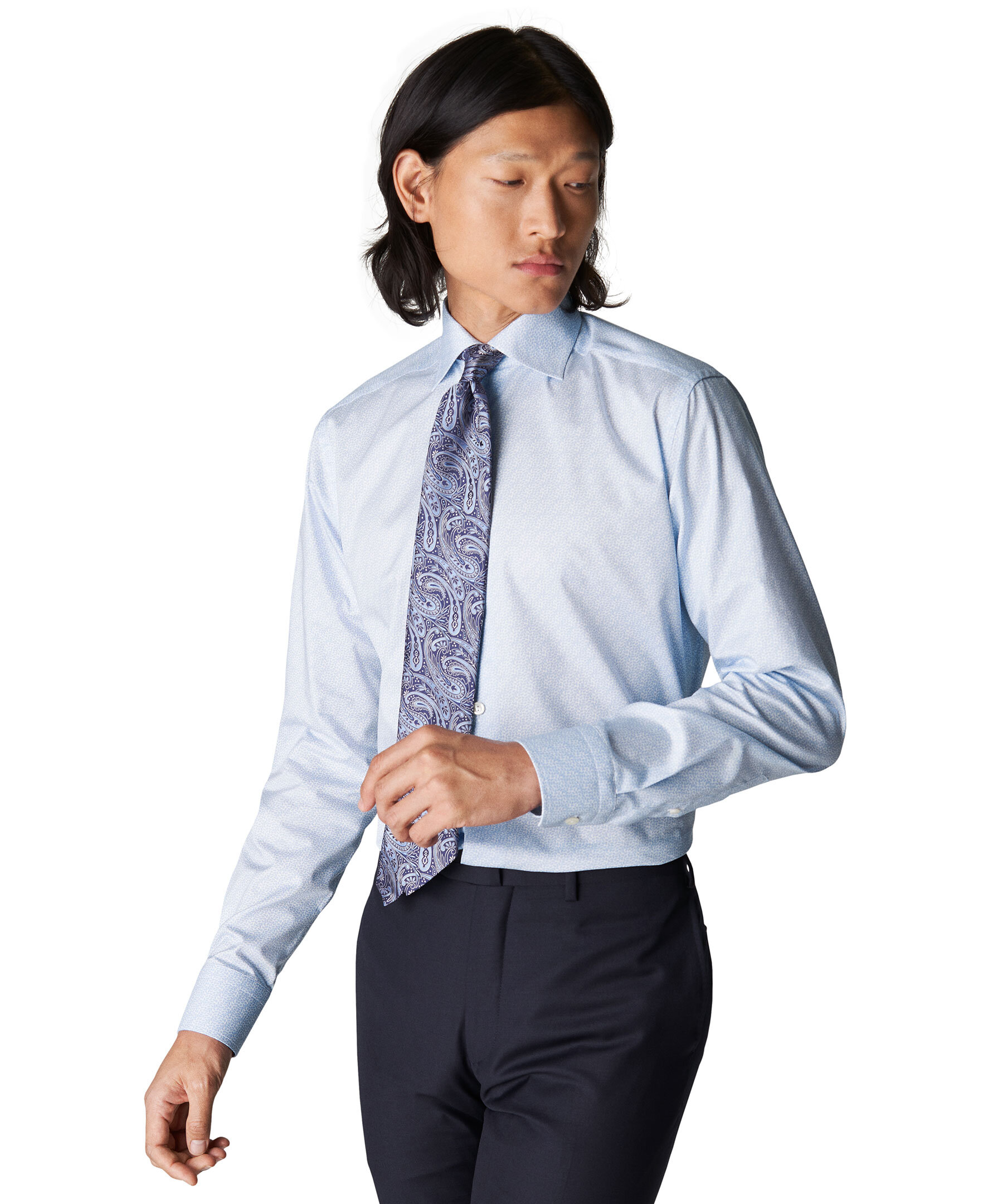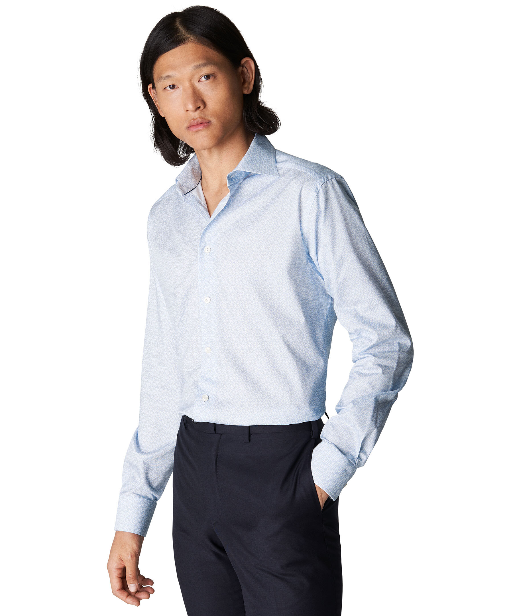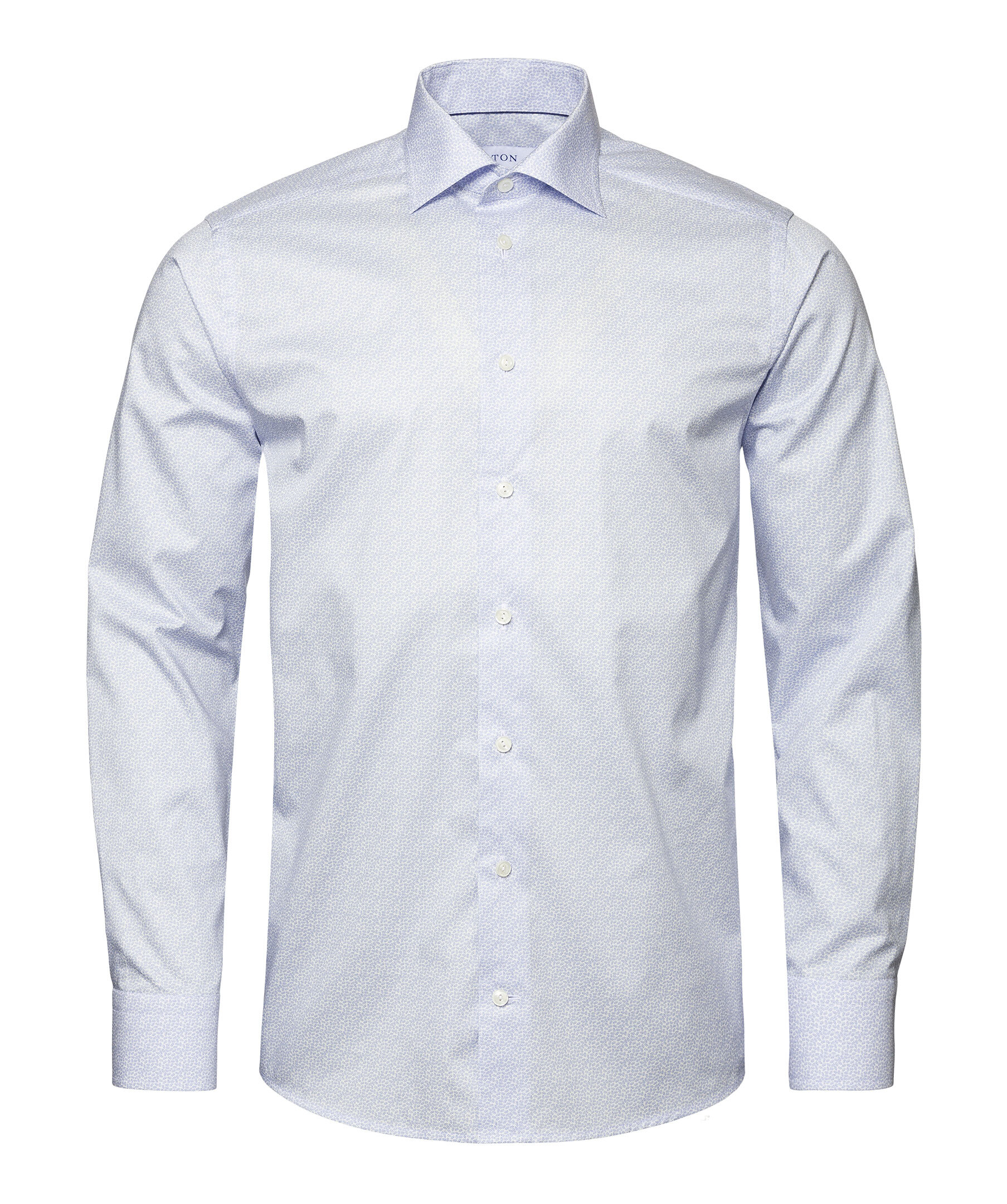 Skjorta från Eton tillverkad i ett skimrande, fint tyg stickat av Filo di Scozia-garn, med ett diskret hundtandsmönster. En business casual-klassiker med naturlig stretch, god andningsförmåga och hög bekvämlighet.