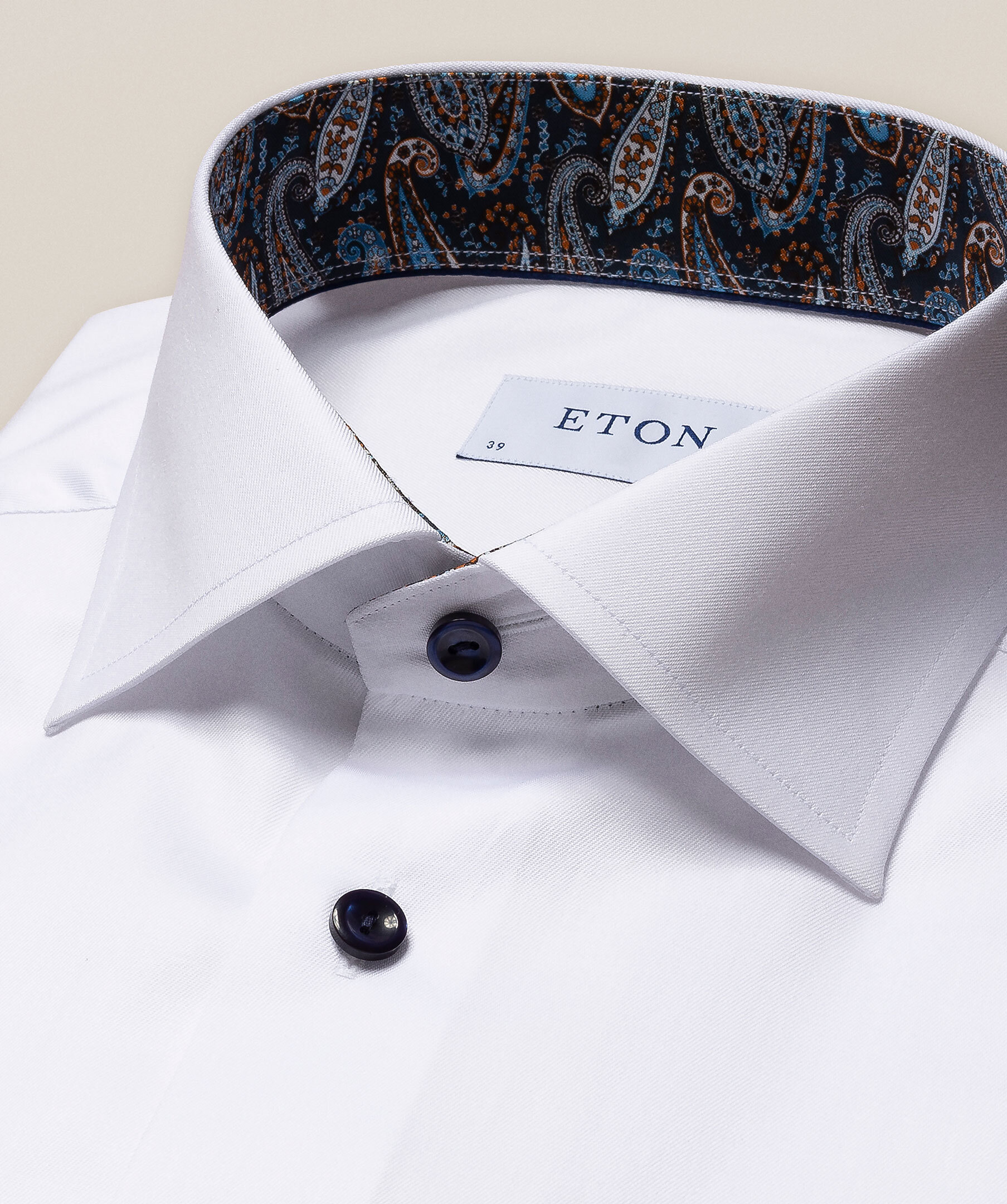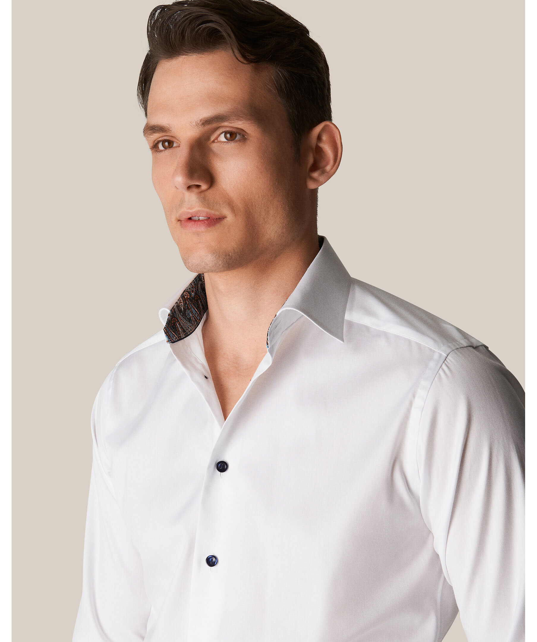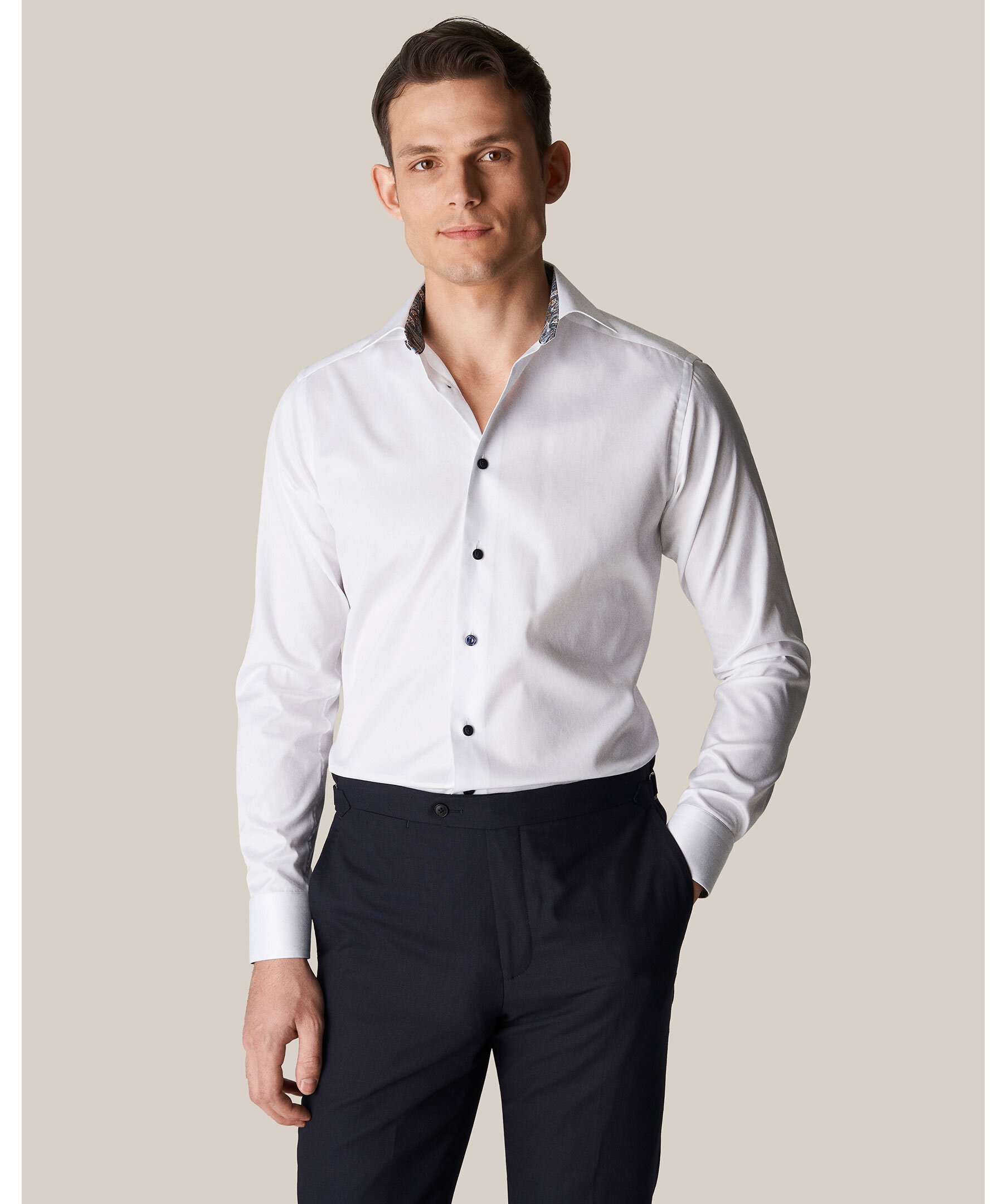 Skjorta i Etons populäraste tyg i ekologisk bomull, med ett elegant kontrasterande paisleymönster på insidan av krage och manschetter. Bär den uppknäppt för en extra snygg look.