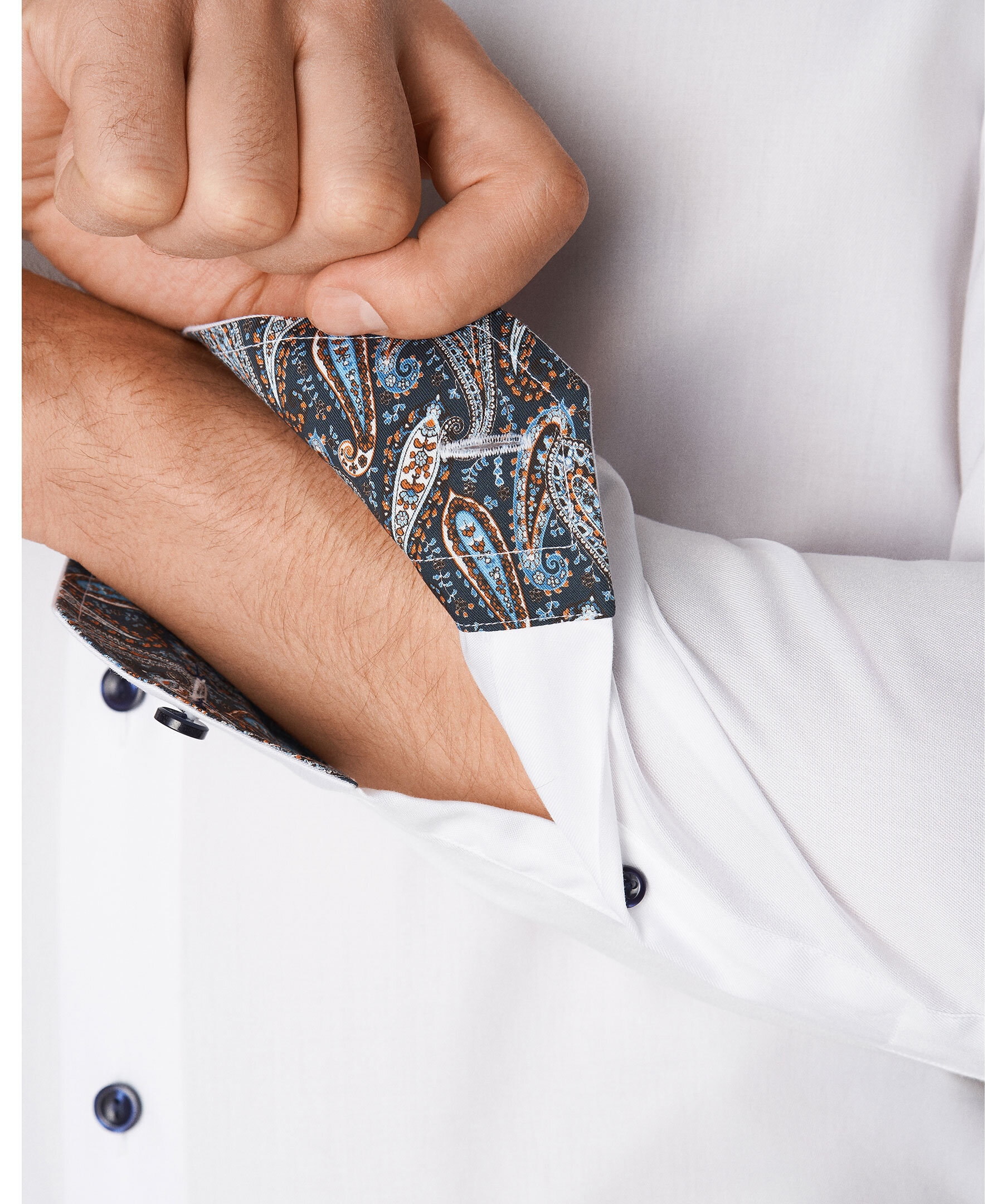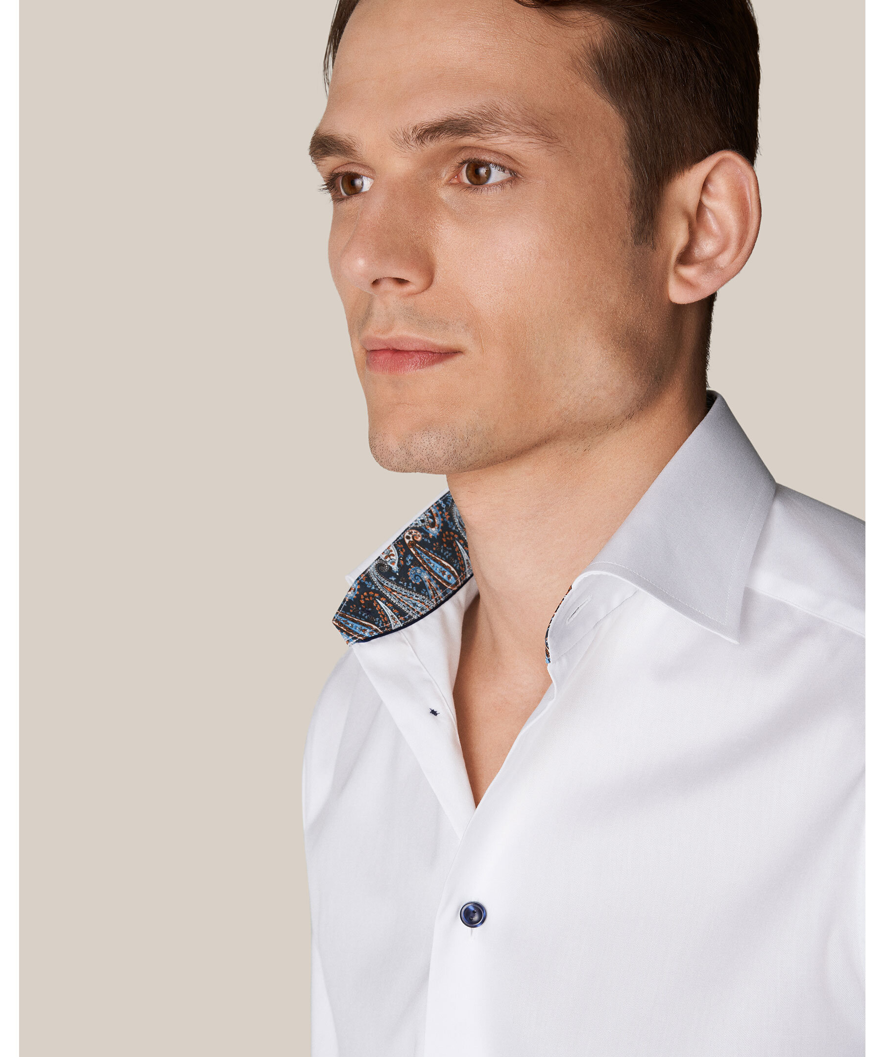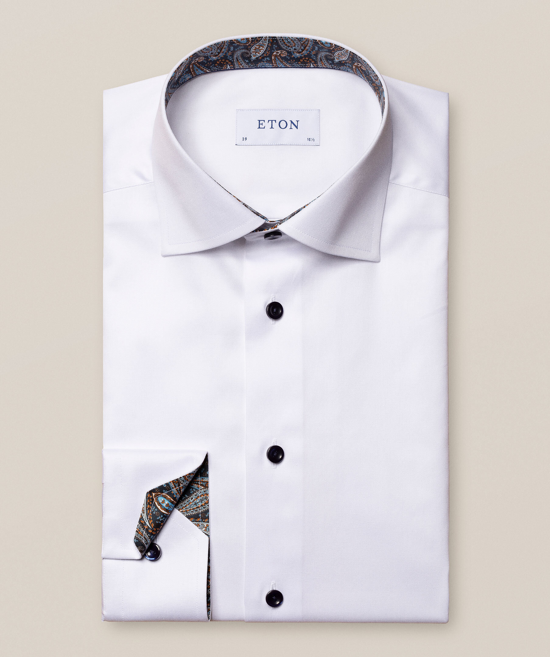 Skjorta i Etons populäraste tyg i ekologisk bomull, med ett elegant kontrasterande paisleymönster på insidan av krage och manschetter. Bär den uppknäppt för en extra snygg look.