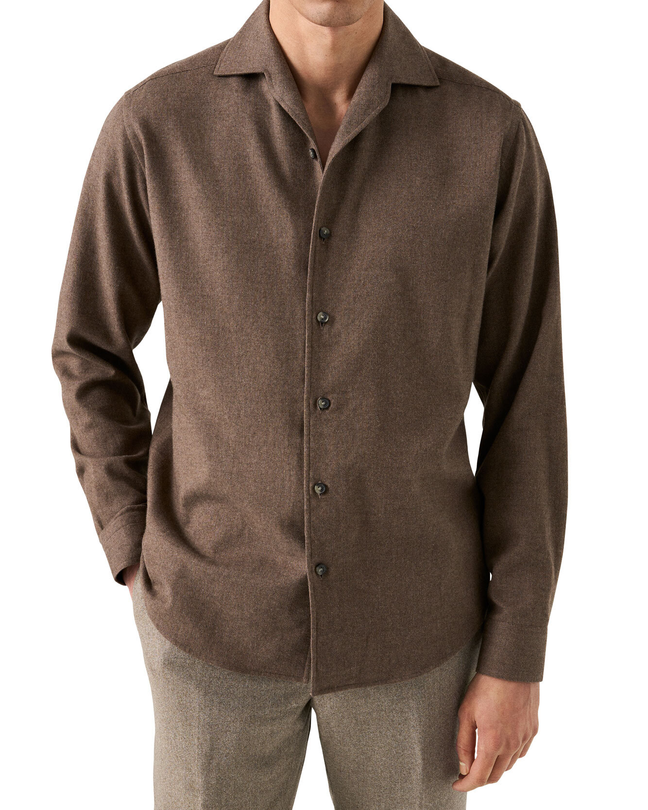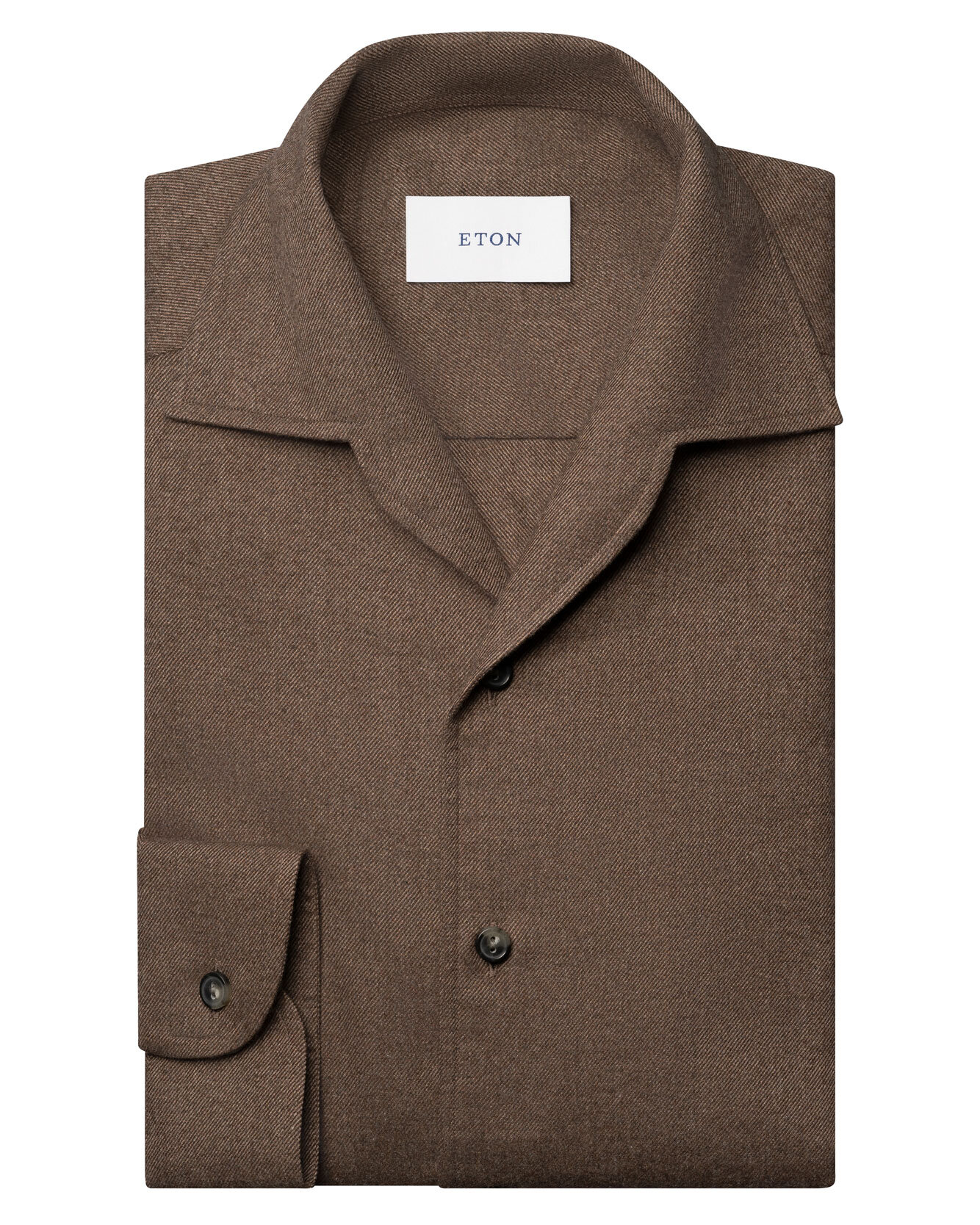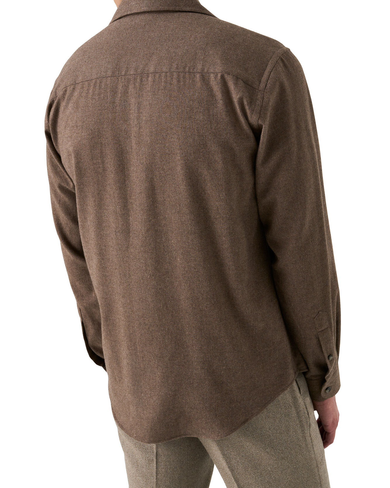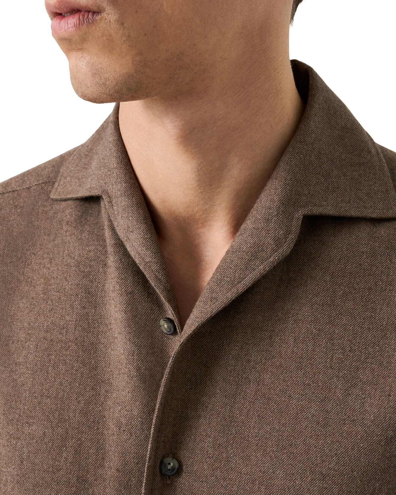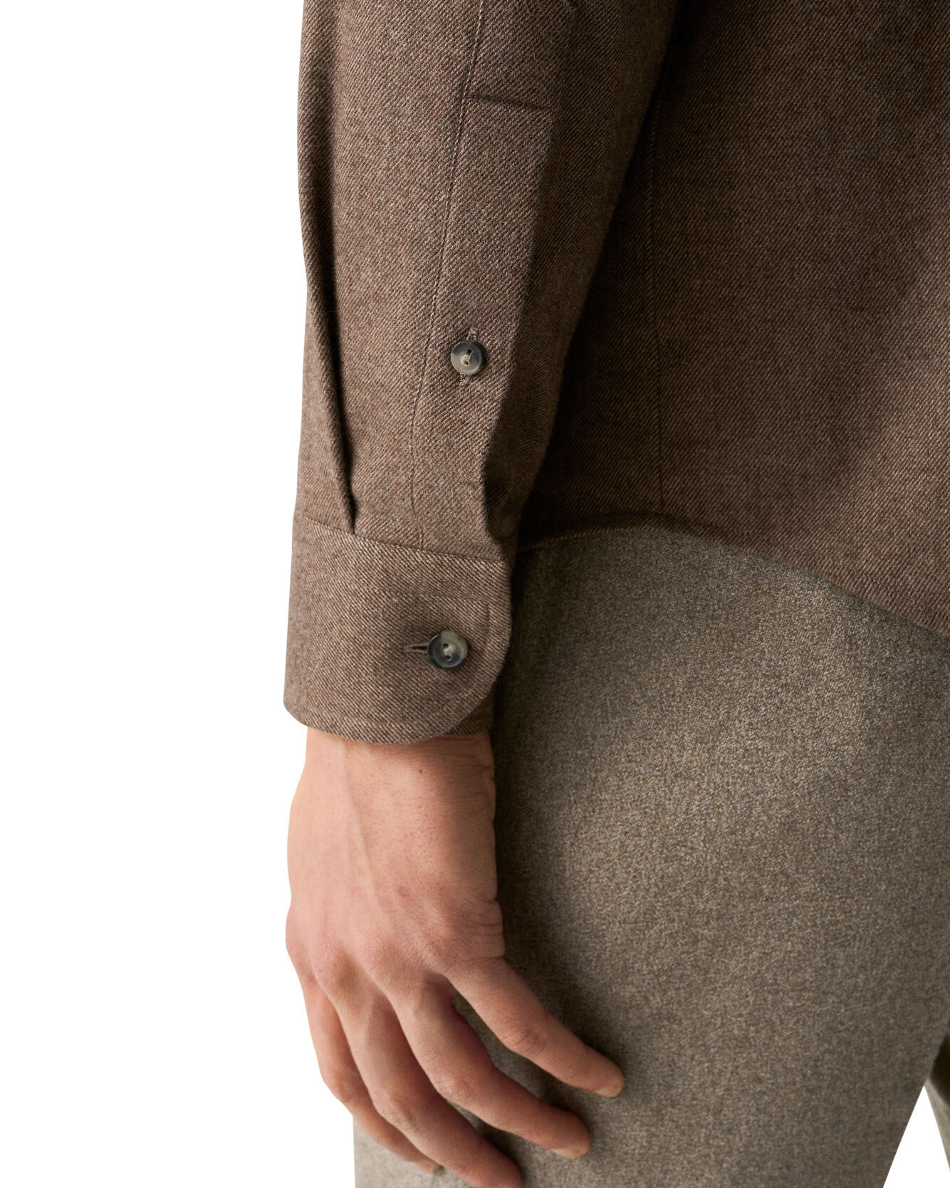 En casualskjorta i 100 % bomullsflanell, vävd i Italien av dubbeltvinnat garn och mjukt borstad för en oerhört mjuk och kashmirliknande känsla. Den solida designen framhäver twillstrukturen och de fylliga melange-tonerna. Skjortan har benfärgade knappar, spread-krage och böjd fåll. Passformen är Casual Fit, vilket gör den lätt att styla, både instoppad och oinstoppad.