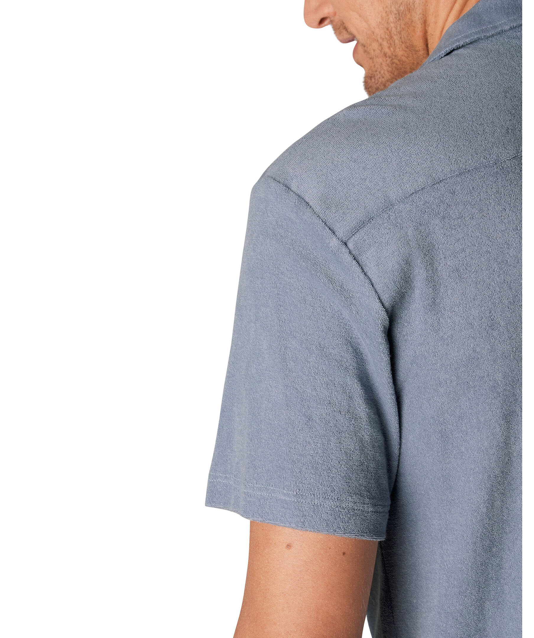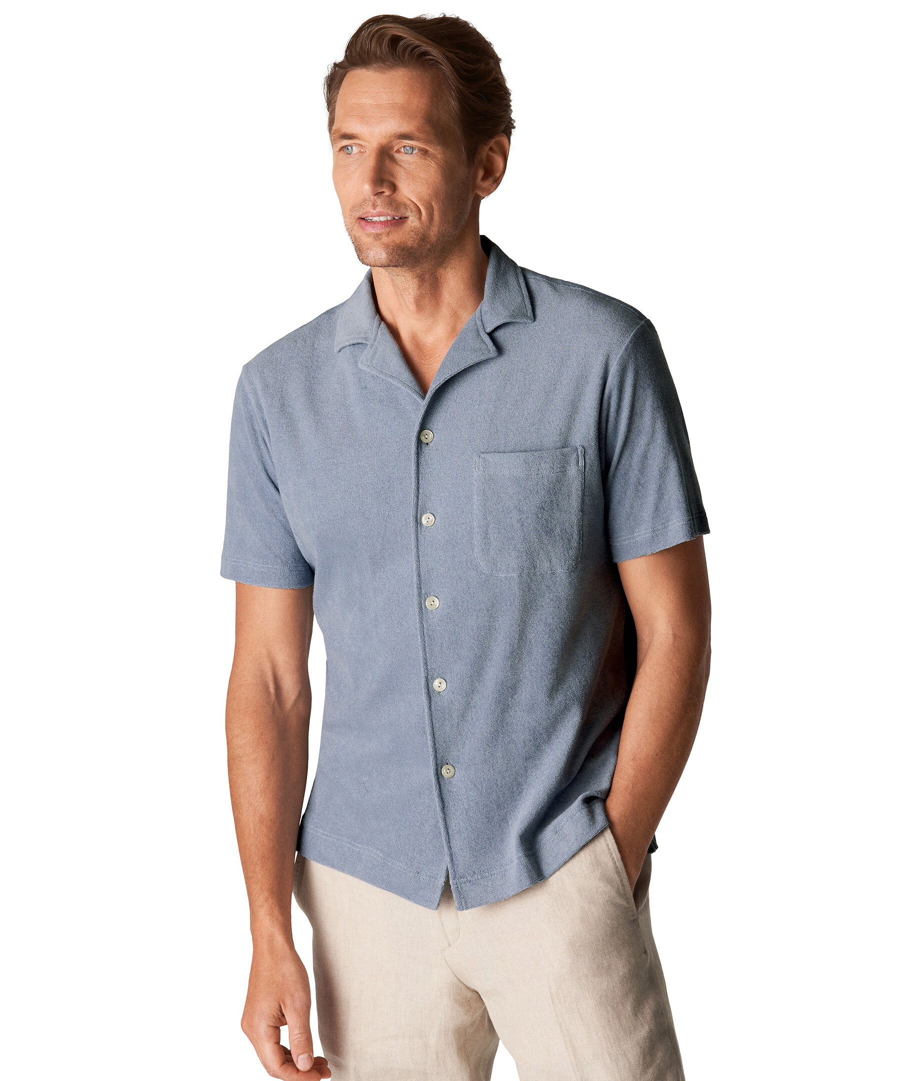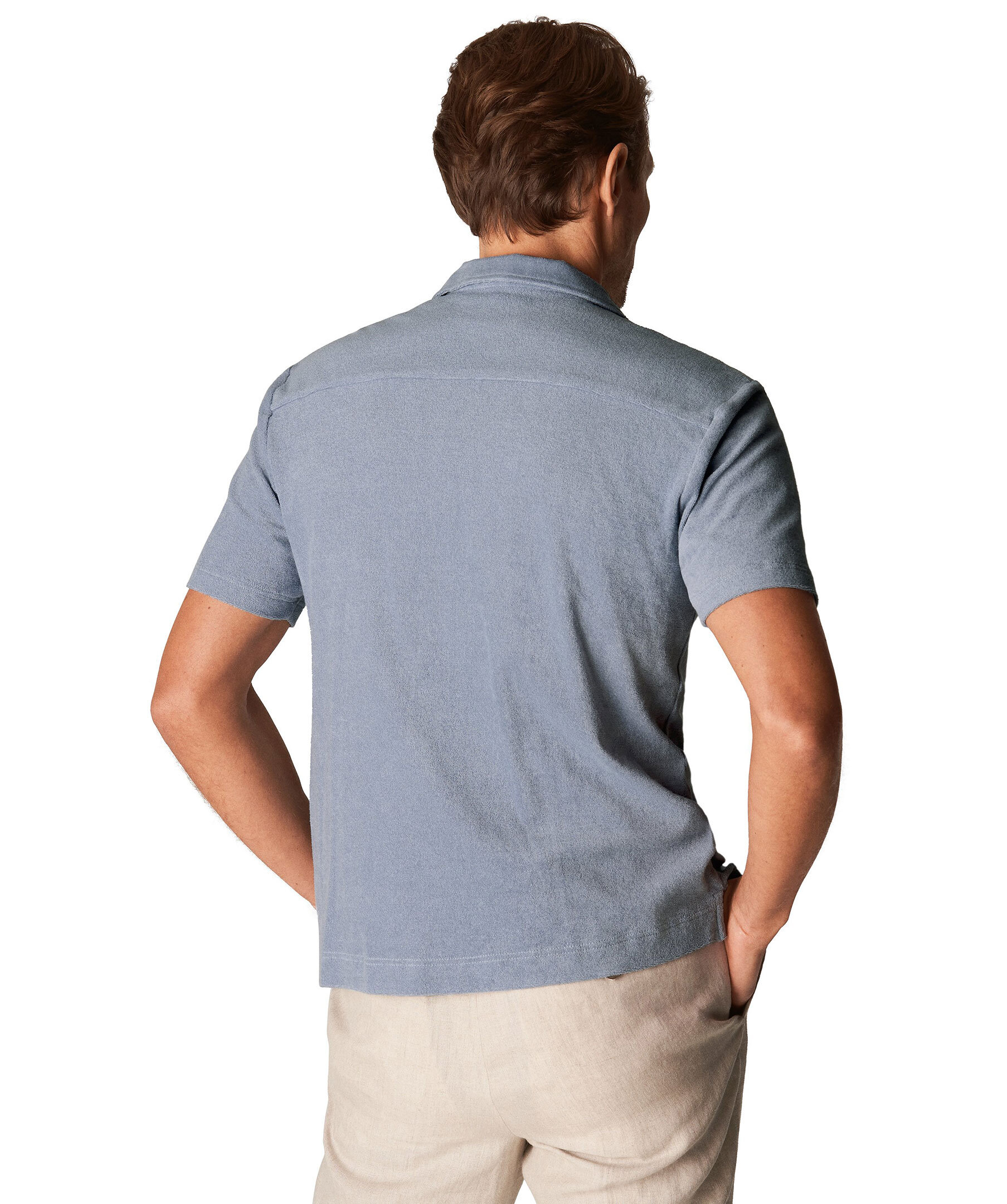 Blå retroinspirerad resortskjorta med knäppning, gjord av mjuk och skön italiensk bomullsfrotté. En skön sextiotalskänsla som passar lika bra på stan som på stranden.