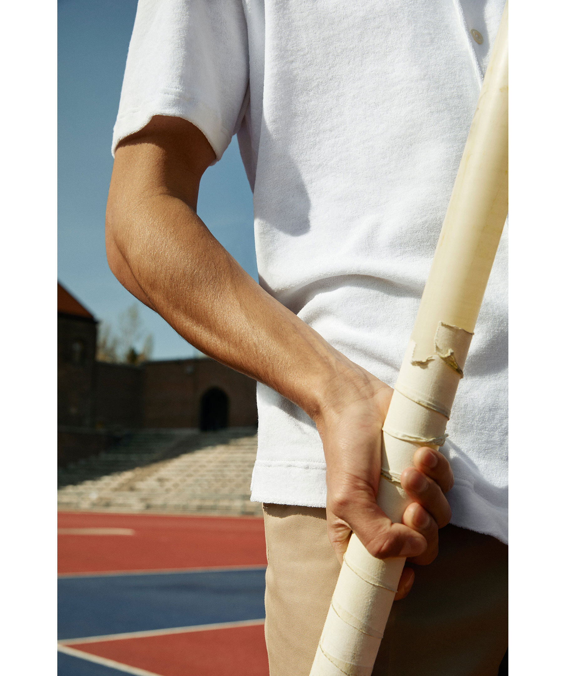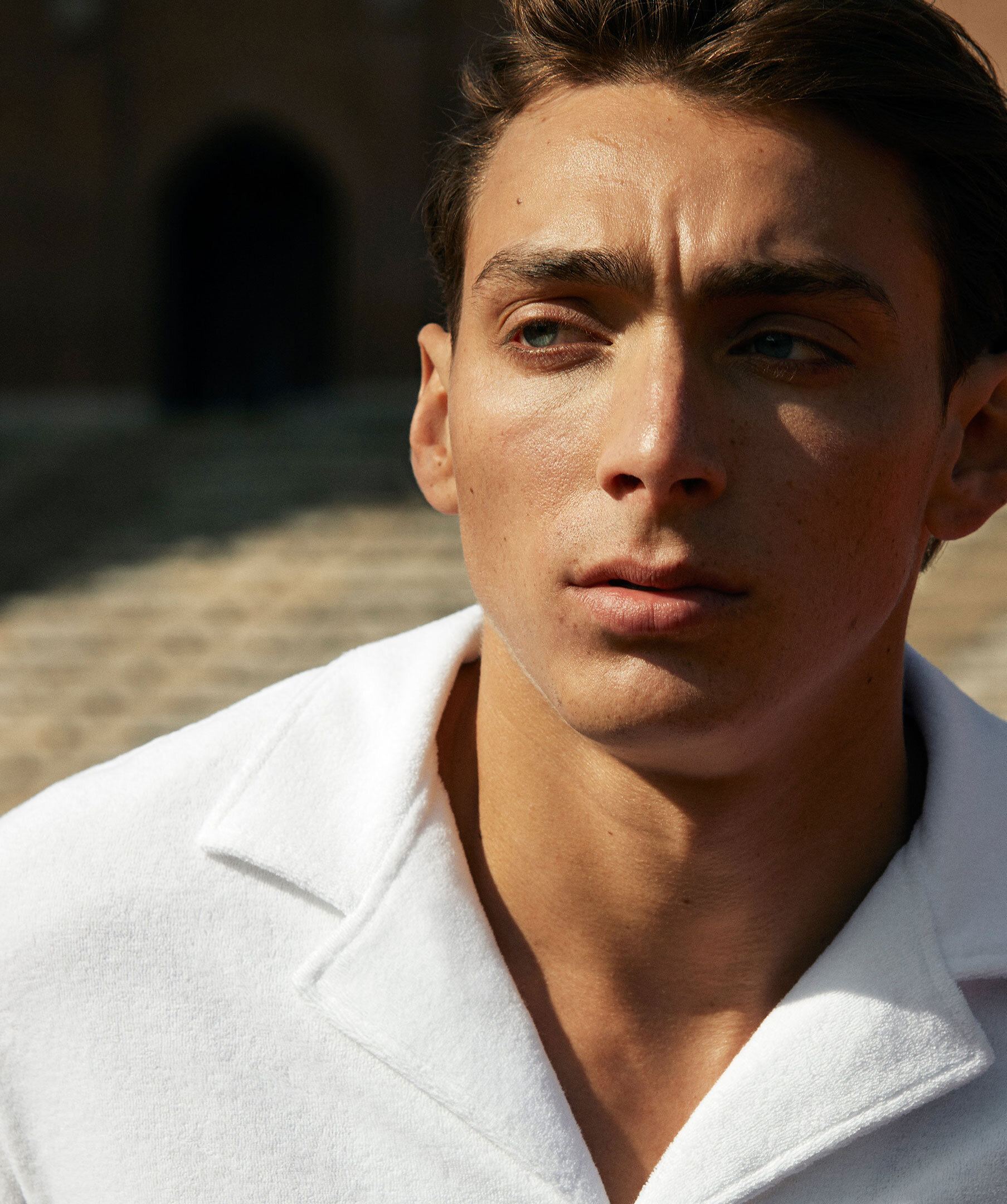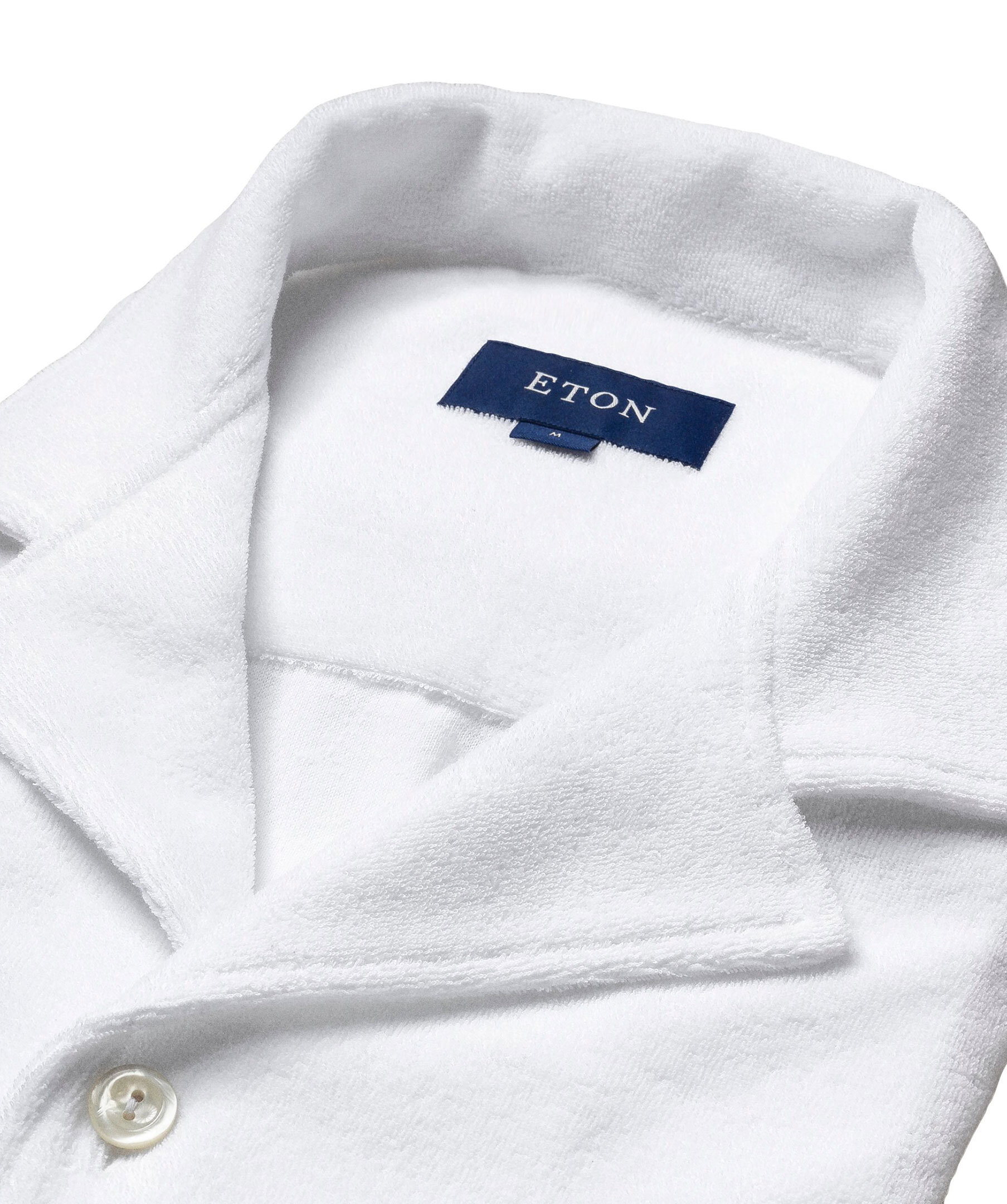 Vit retroinspirerad resortskjorta med knäppning, gjord av mjuk och skön italiensk bomullsfrotté. En skön sextiotalskänsla som passar lika bra på stan som på stranden.
