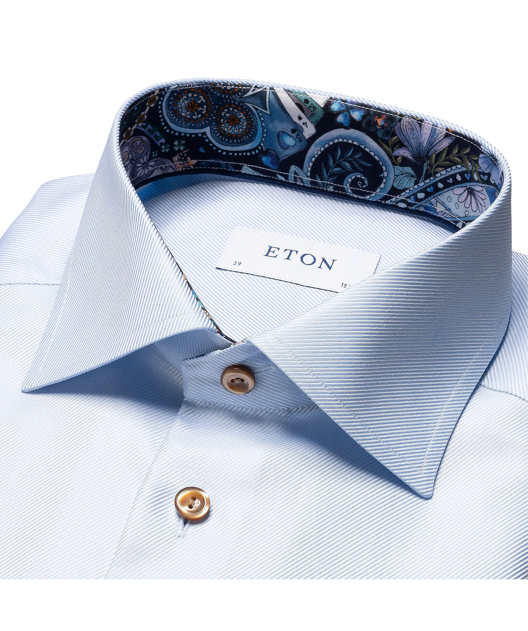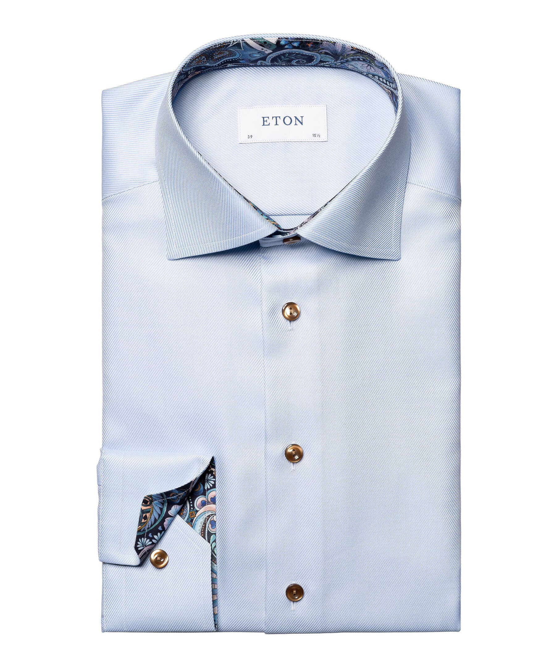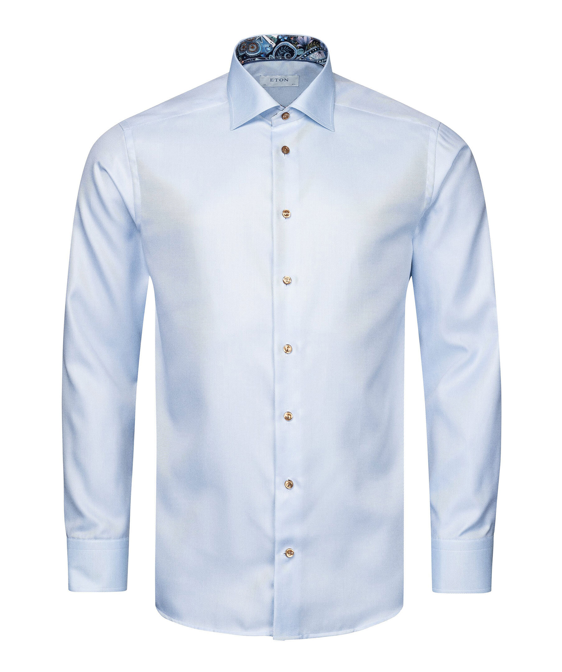 Ljusblå sofistikerad skjorta från Eton. Tillverkad av texturerad twill med eleganta detaljer som ett mönster på insidan av kragen och manschetterna samt knappar som matchar mönstret. Den texturerade twillen ger en vacker lyster och en stilfull diagonal struktur.