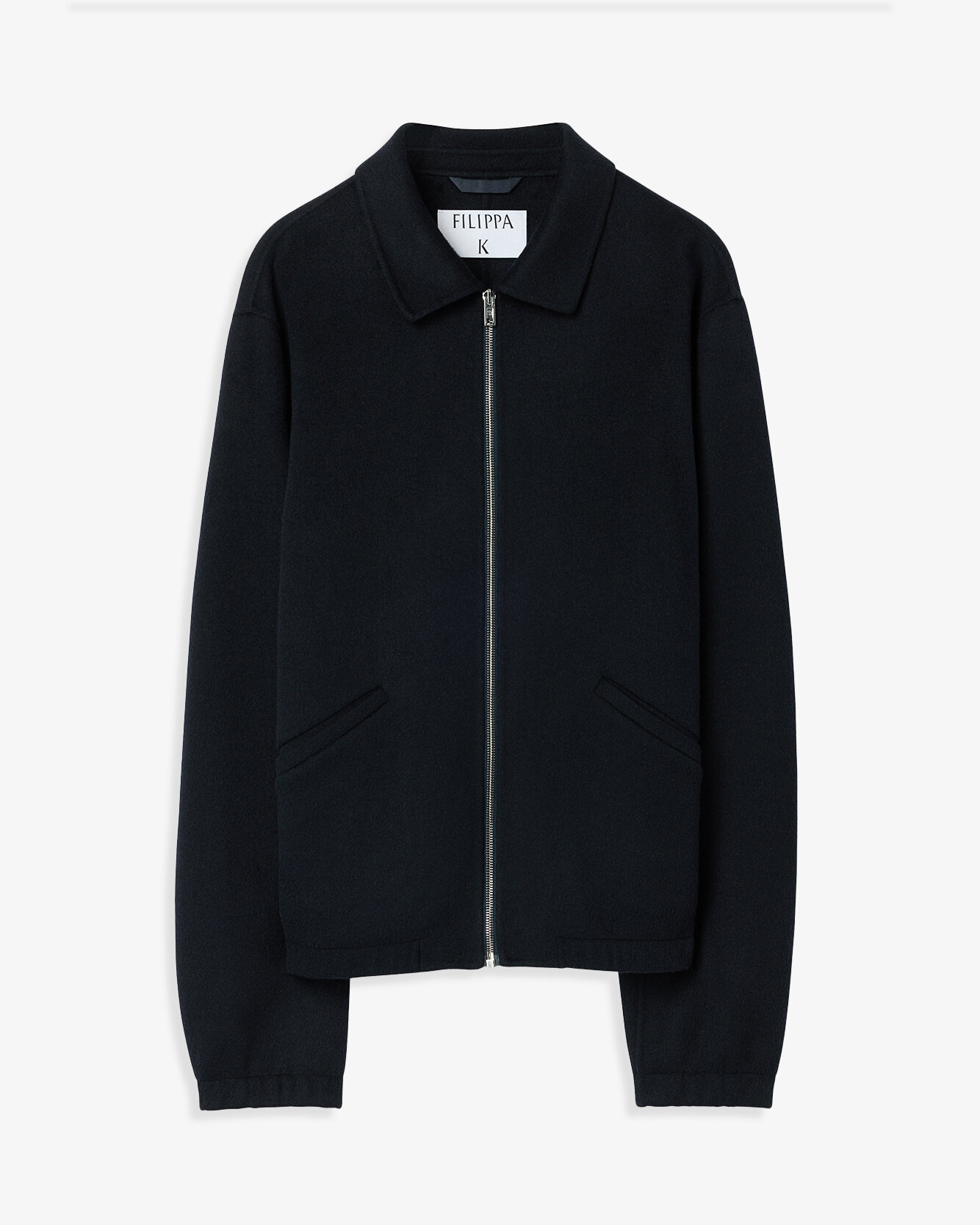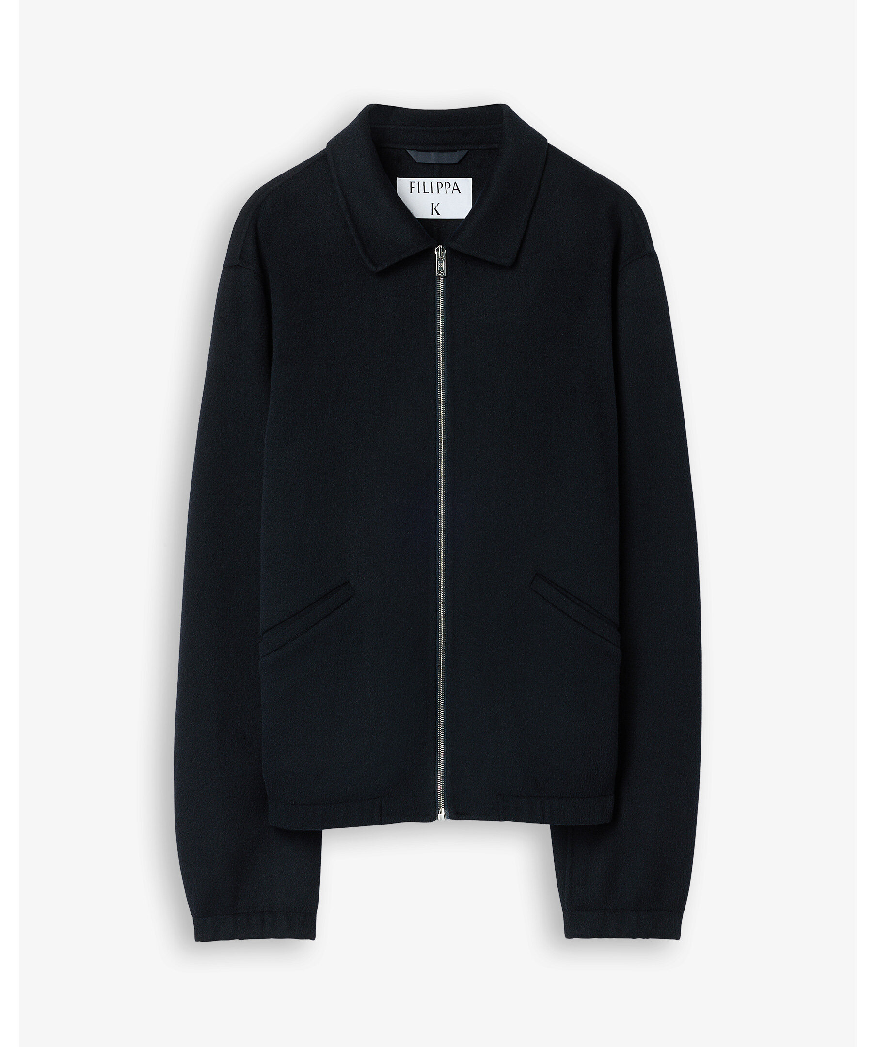 Mörkblå tidlös jacka från Filippa K i mellanviktigt, dubbelvävt ullmaterial med mjuk borstad yta. Jackan har regular fit, dragkedja fram, elastiska muddar och nederkant samt praktiska fickor — perfekt som elegant ytterlager över jeans och T‑shirt.