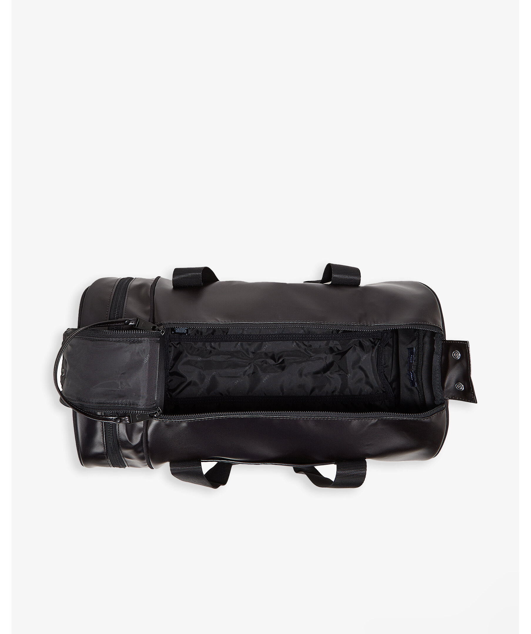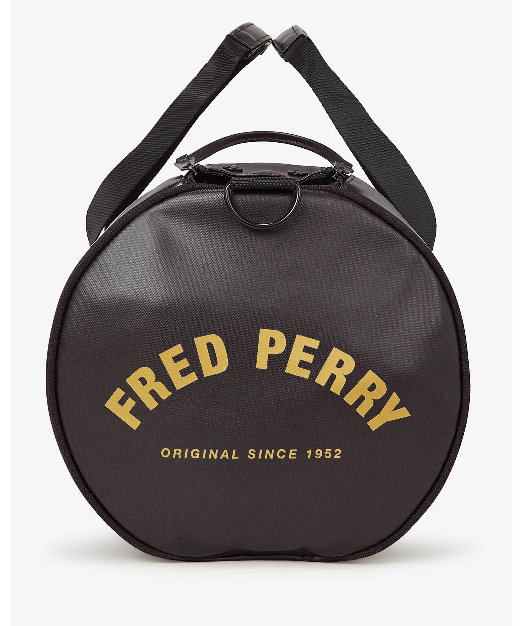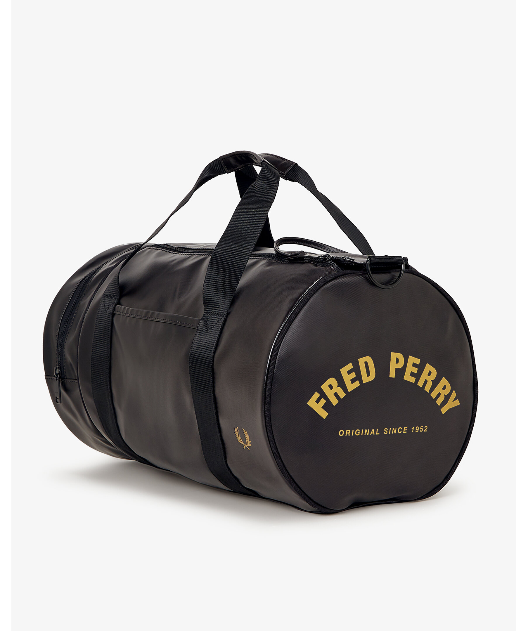 Klassisk väska från Fred Perry. Tillverkad i återvunnen polyester med svarta metalldetaljer, dubbla dragkedjor, justerbar axelrem samt guldfärgad branding och logotyp framtill.