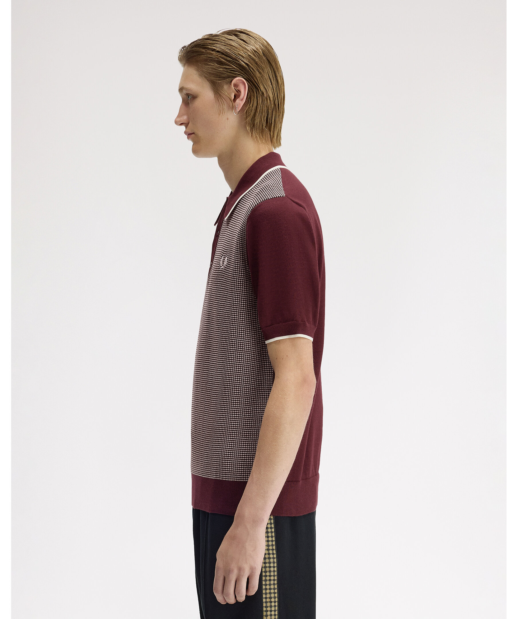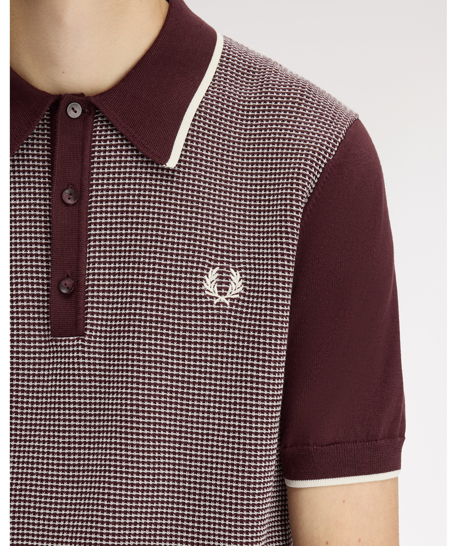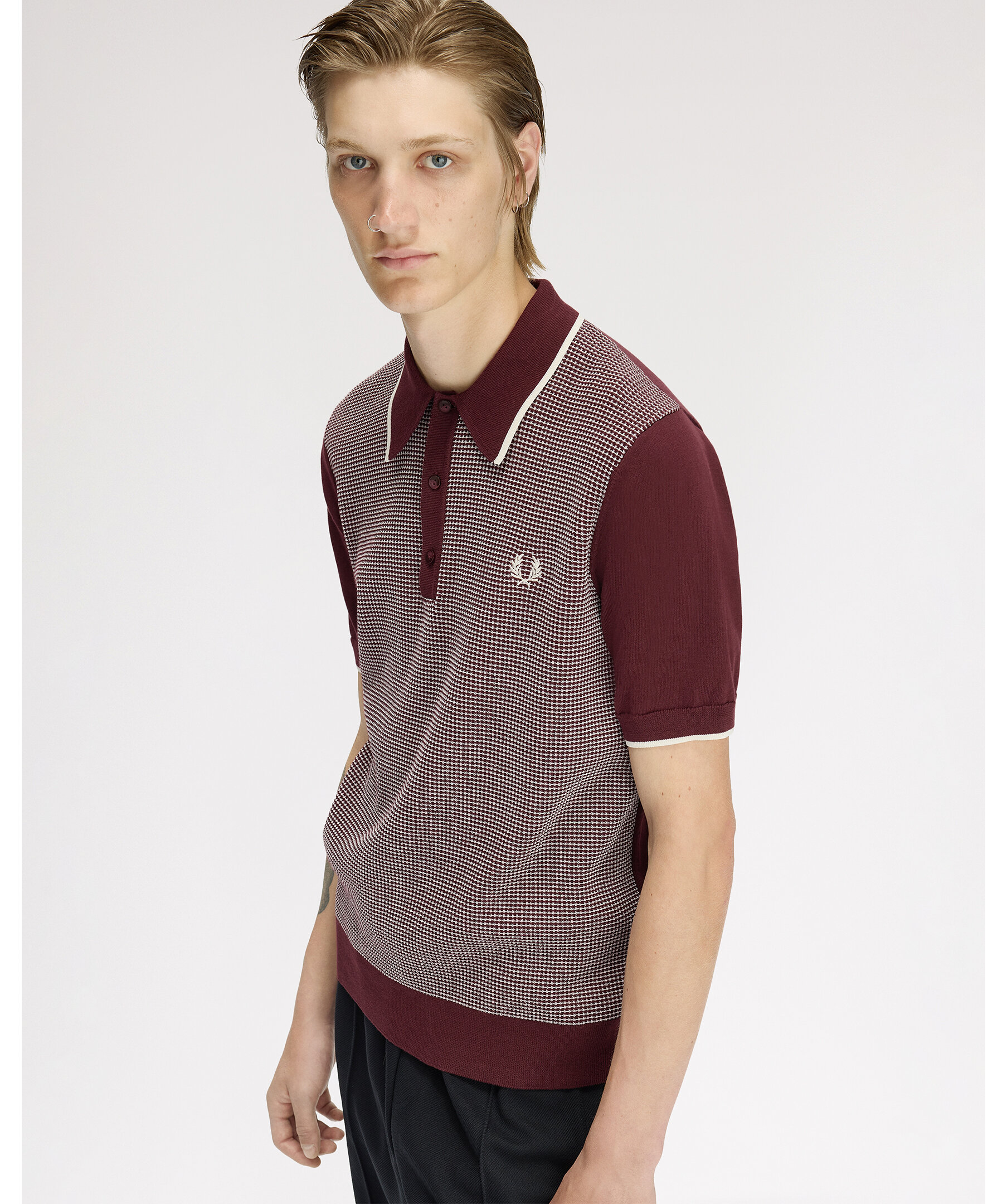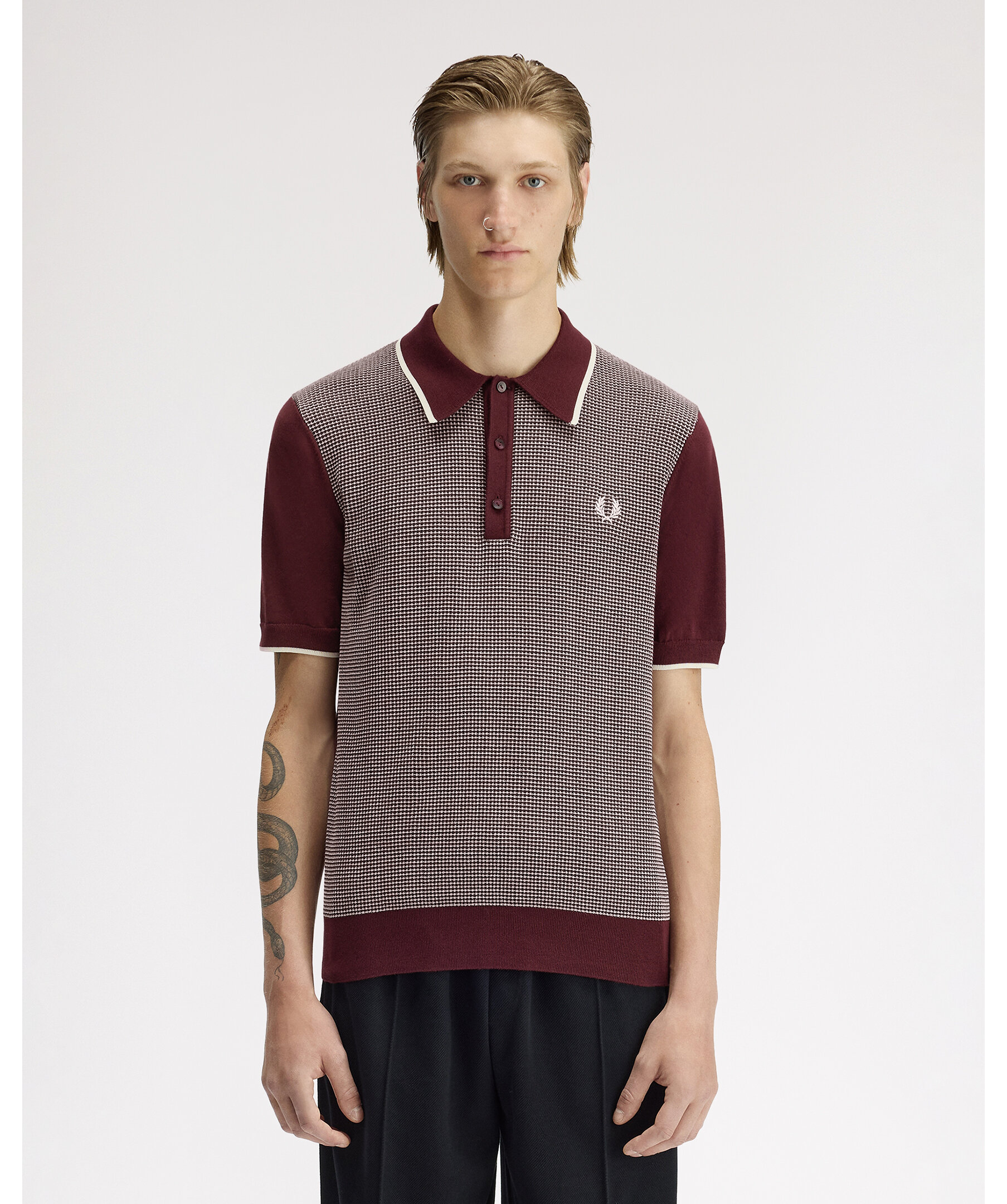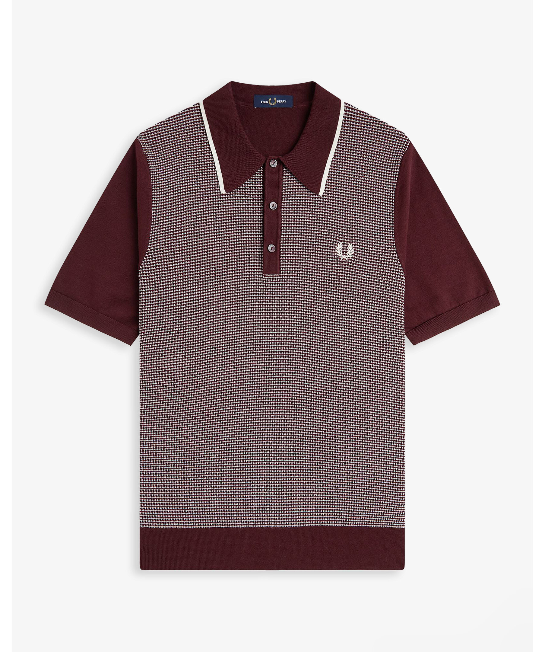 Stickad piké från Fred Perry med karaktäristisk waffle-konstruktion och en stor, markerad krage med single tipping. Regular fit med treknappsknäppning och broderad logotyp på bröstet.