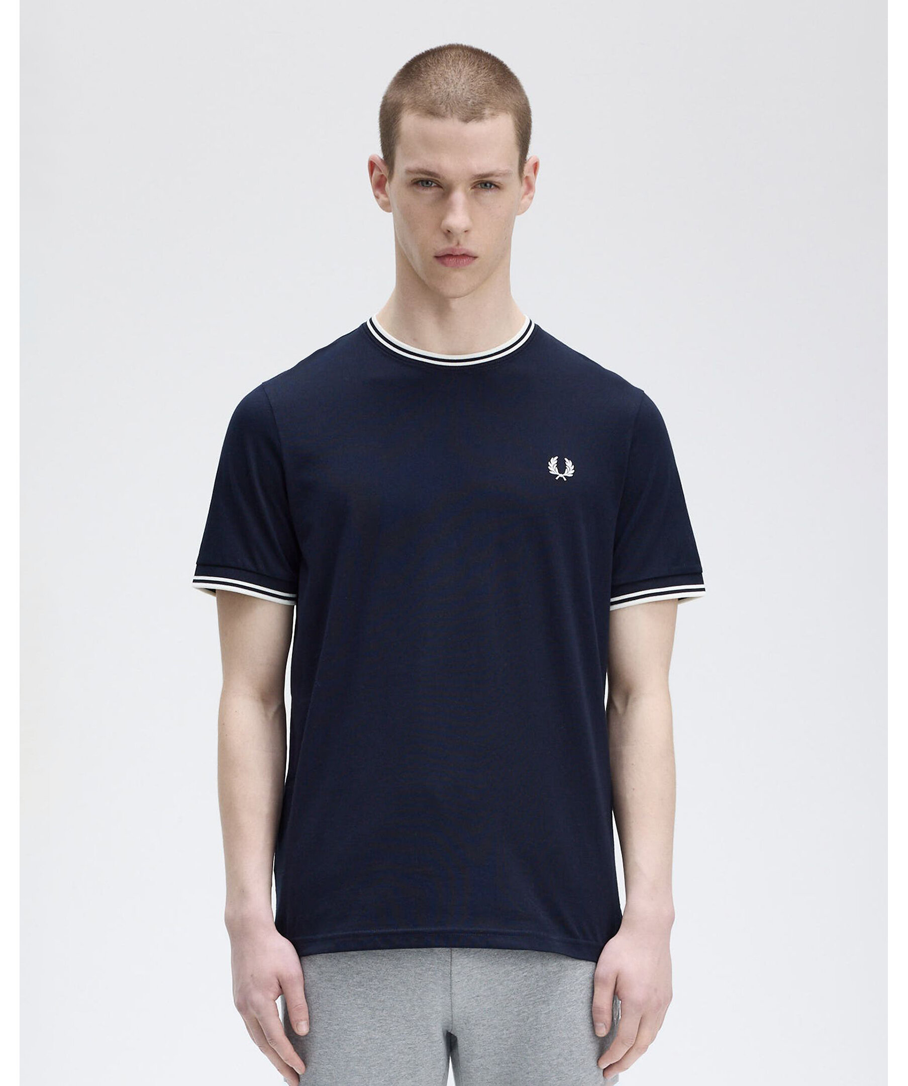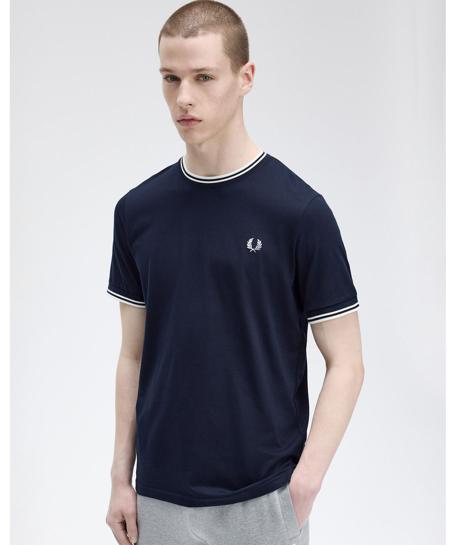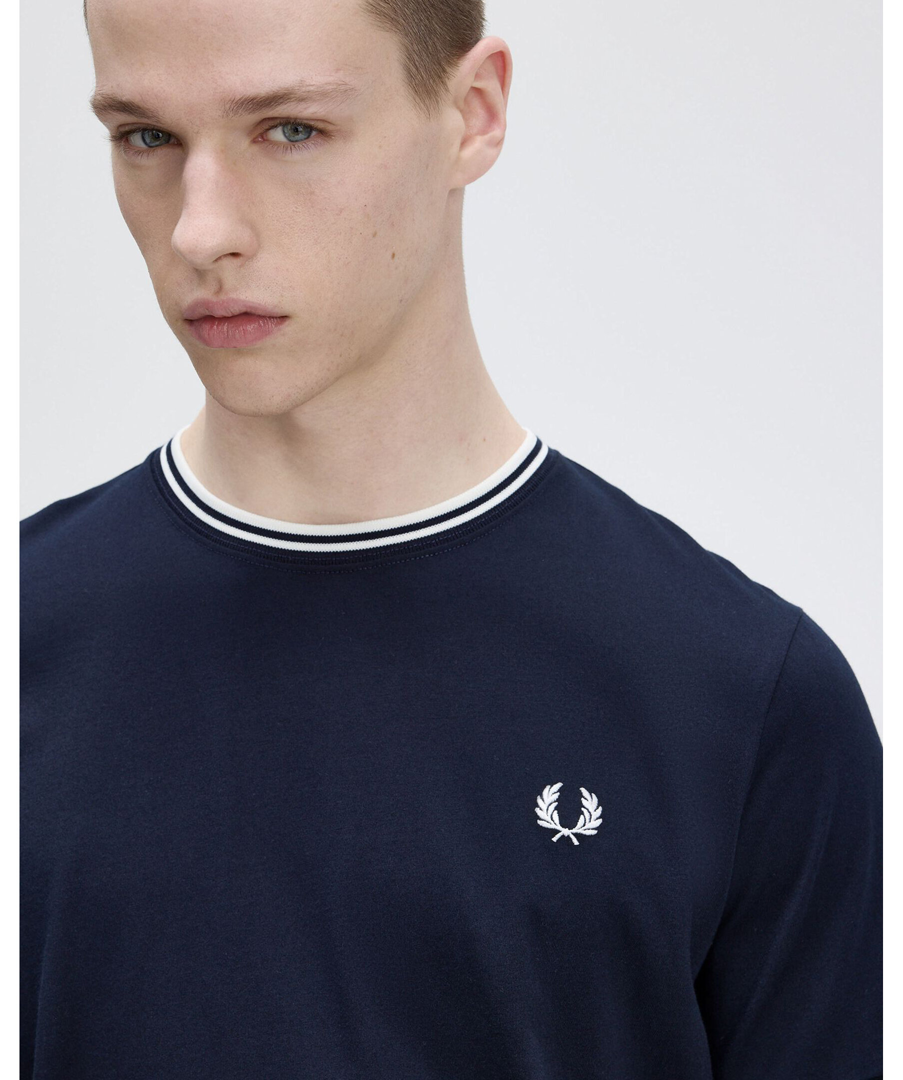 Vit t-shirt från fred Perry med rund hals och klassisk twin tipping på krage och ärmslut. Tillverkad i lätt bomullsjersey med normal passform för en tidlös och bekväm stil.