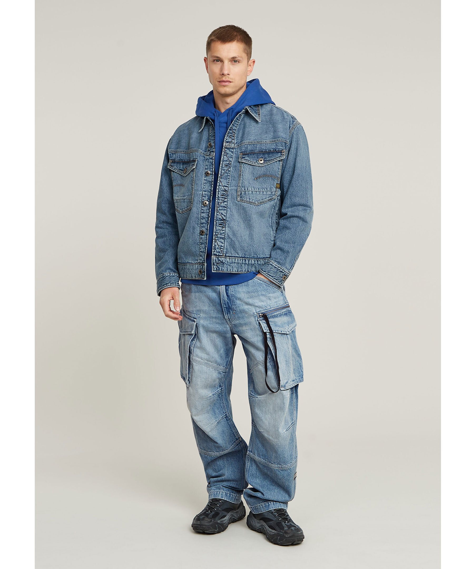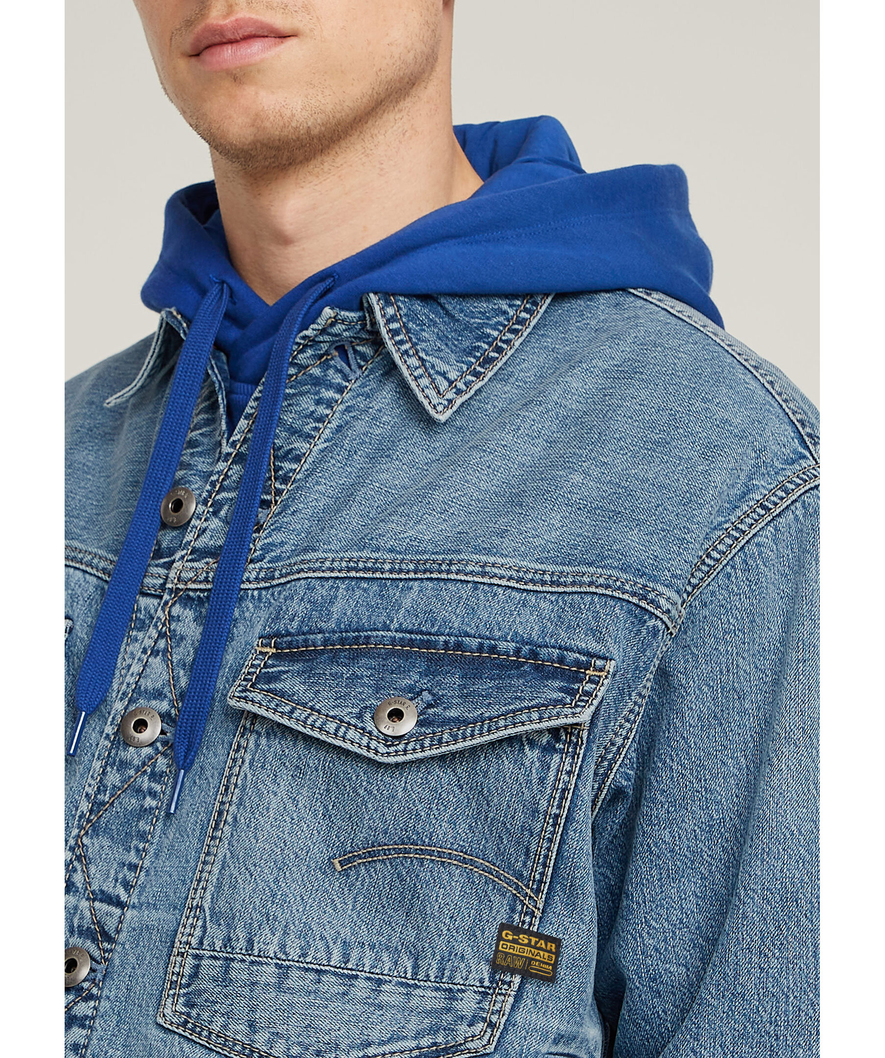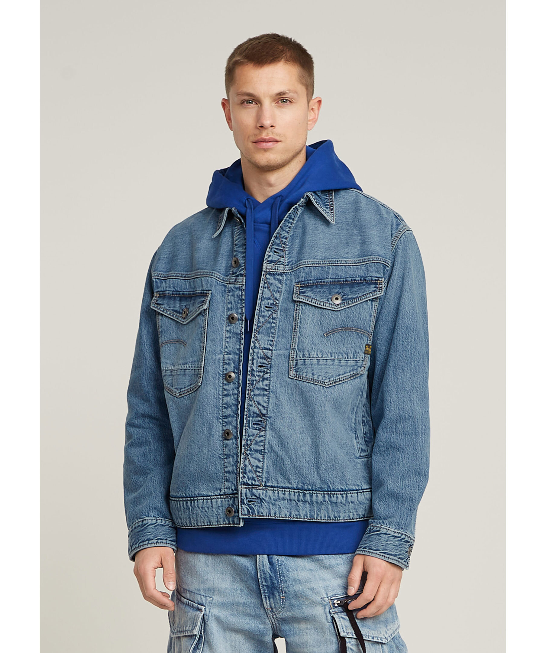 Blå jeansjacka från G Star. Stängs med knappar framtill och har två bröstfickor med lock, passpoalfickor i sidan samt liten logotyp-lapp på ena bröstfickan. Tillverkad i bomull.