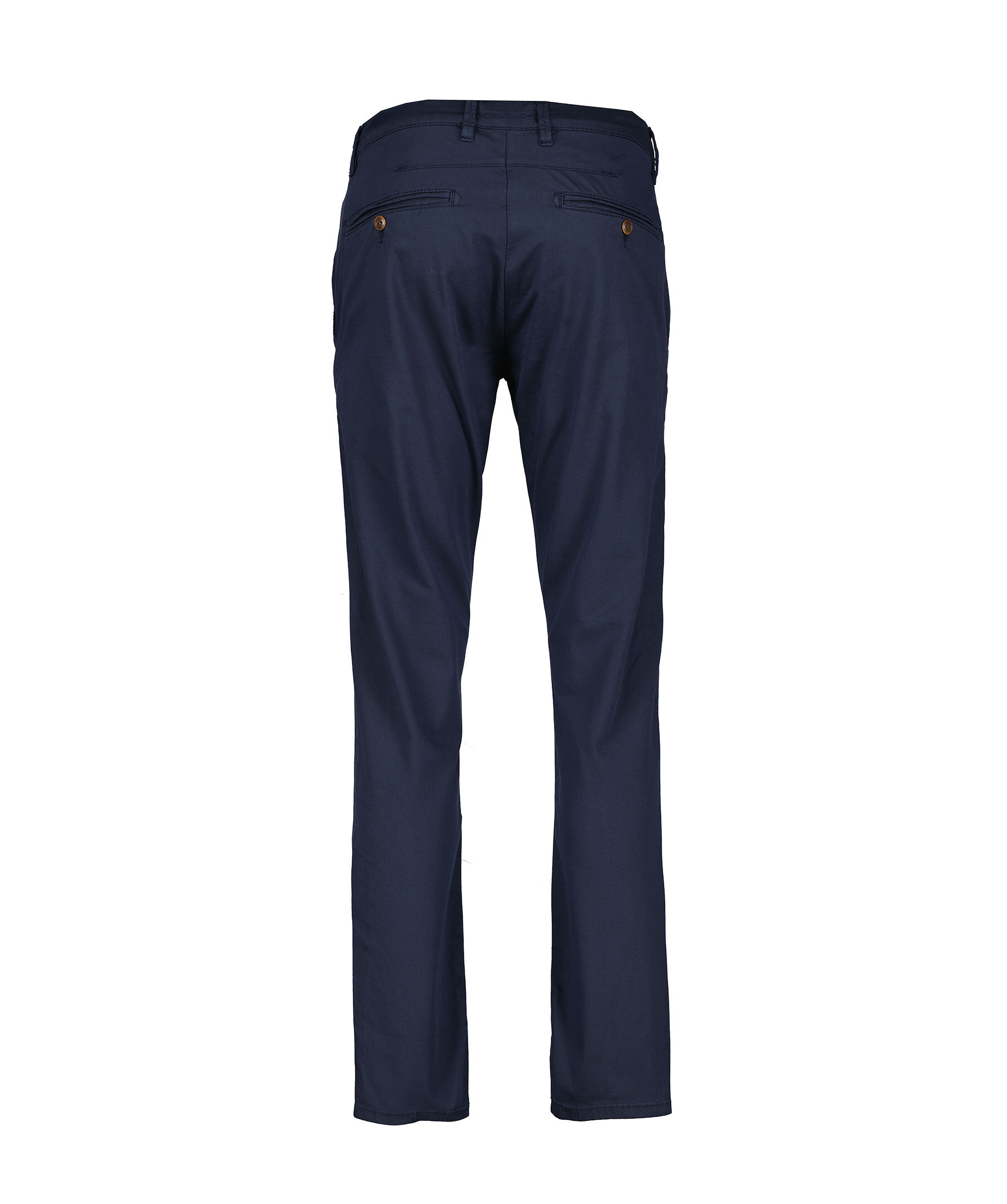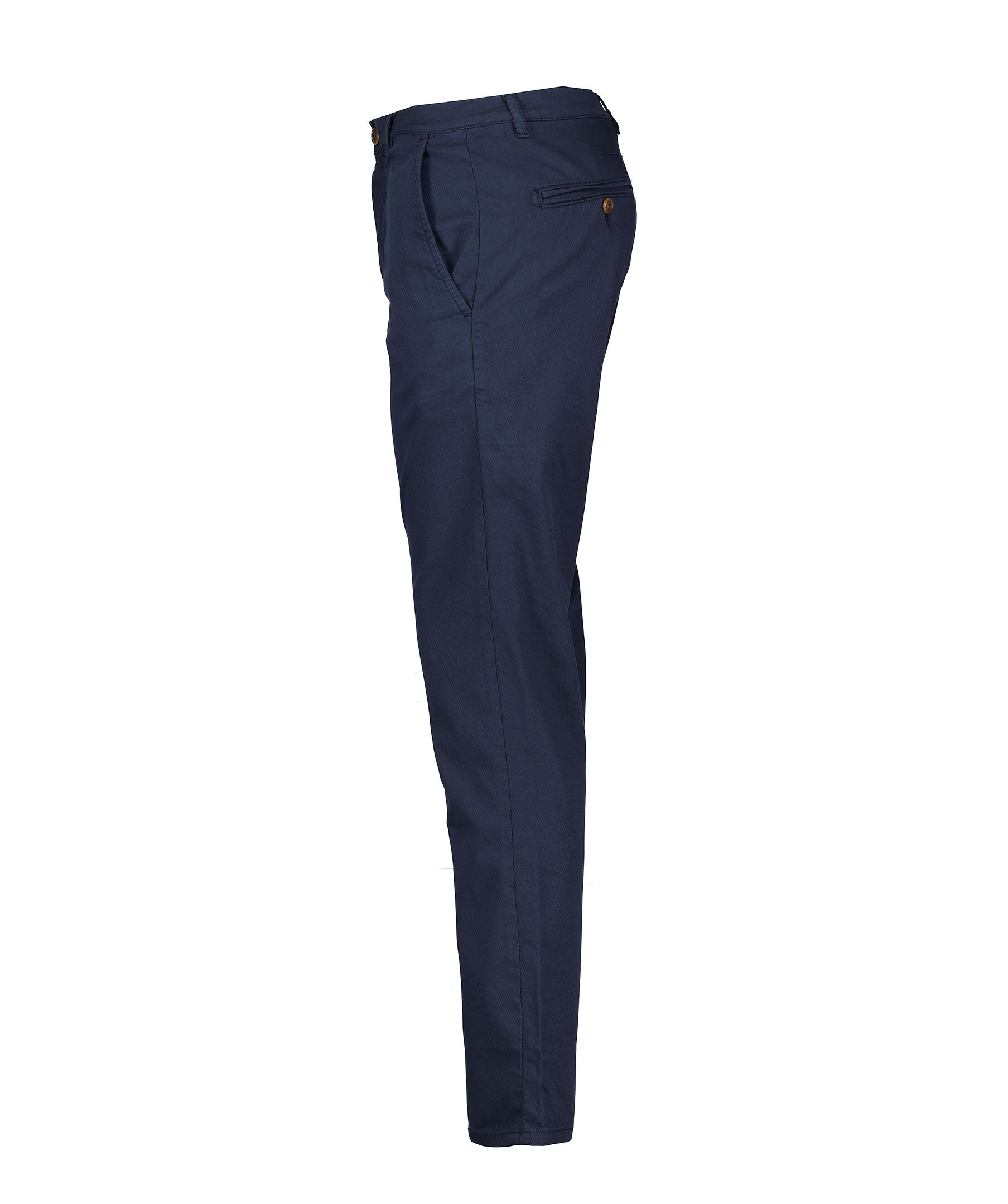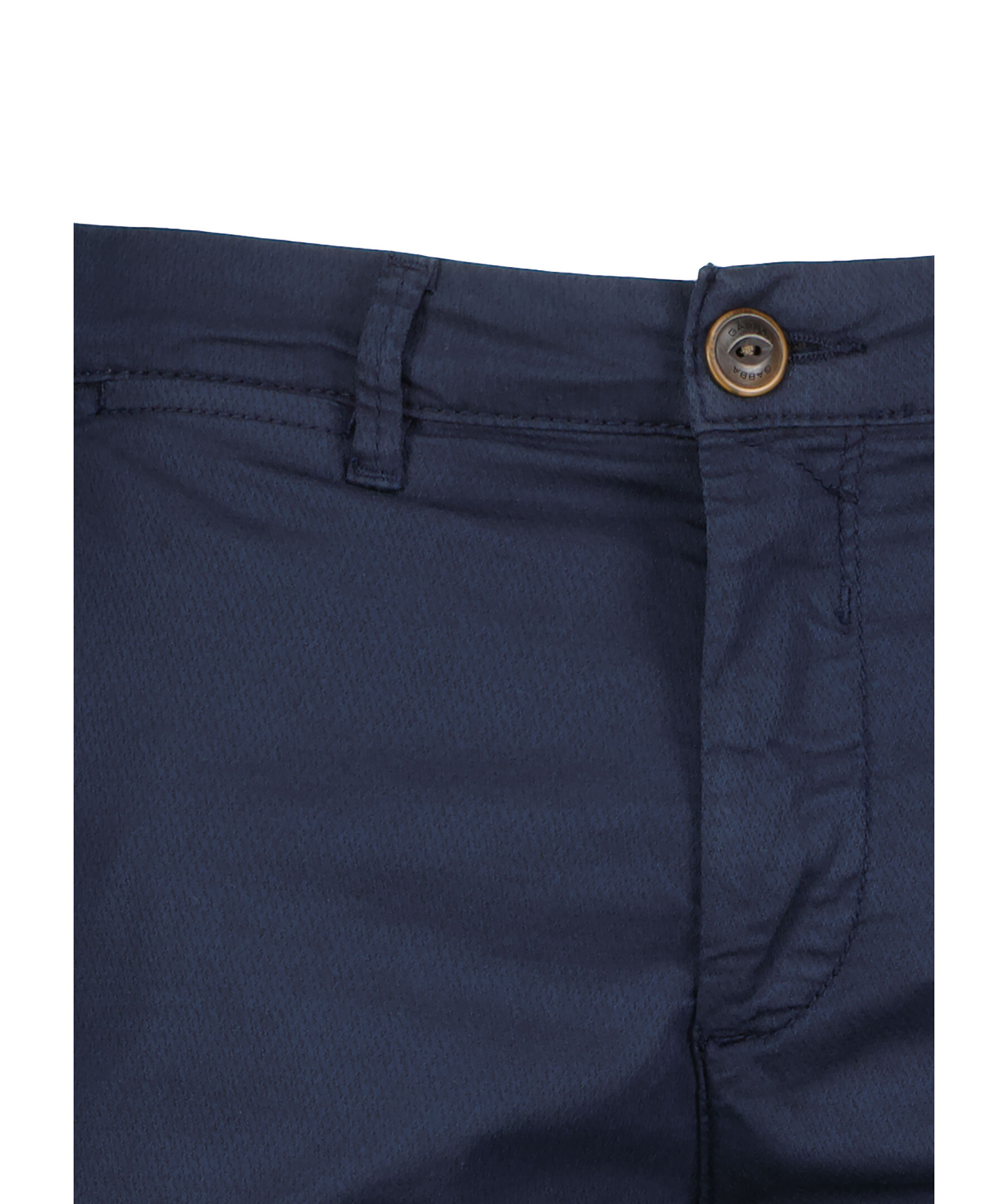 Mörkblåa byxor från Gabba. Byxorna har bälteshällor i midjan, två snedställda sidfickor, två bakfickor med knapp och en liten logotyp i metall vid ena sidfickan. Tillverkade i en bomullsblandning.