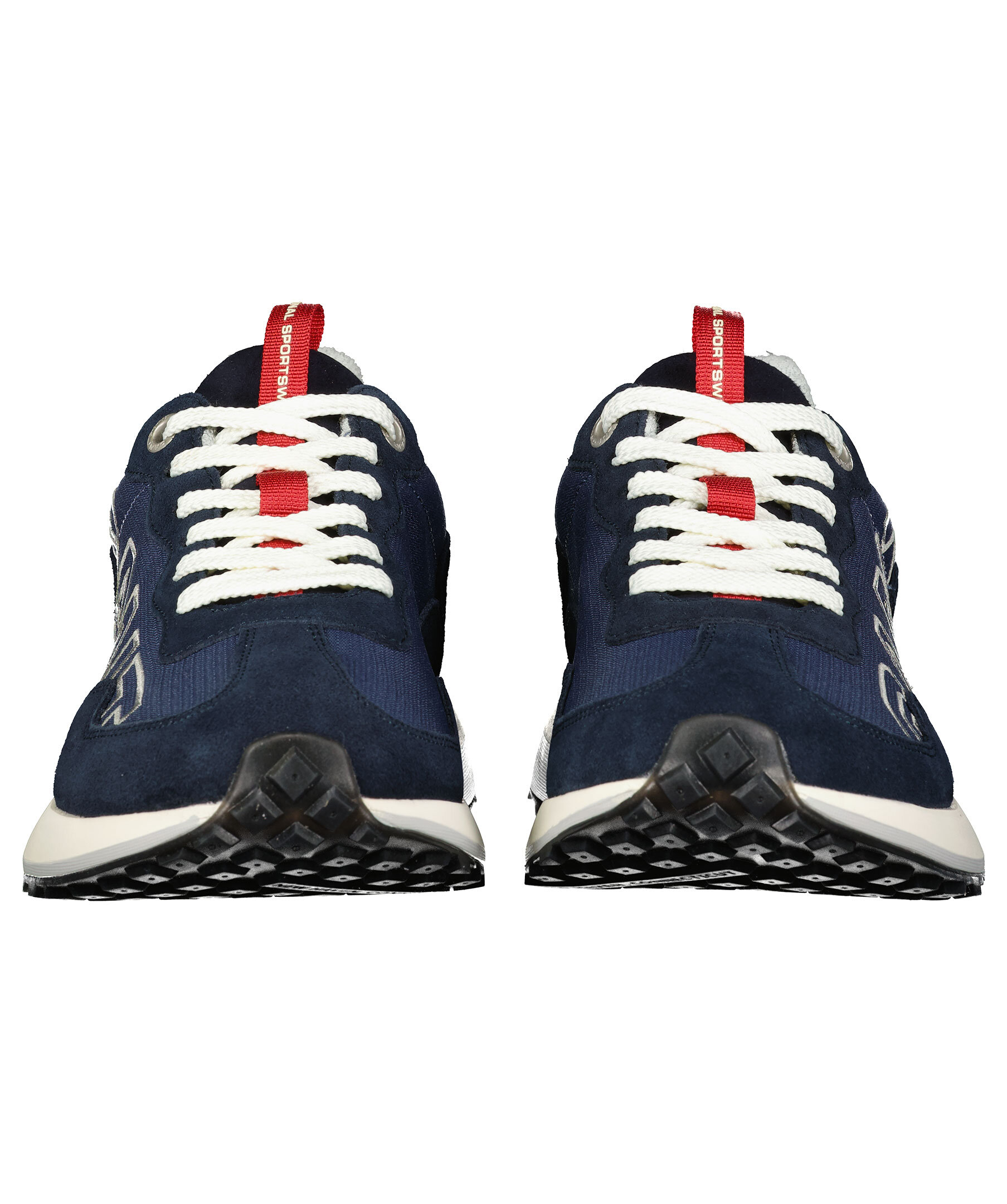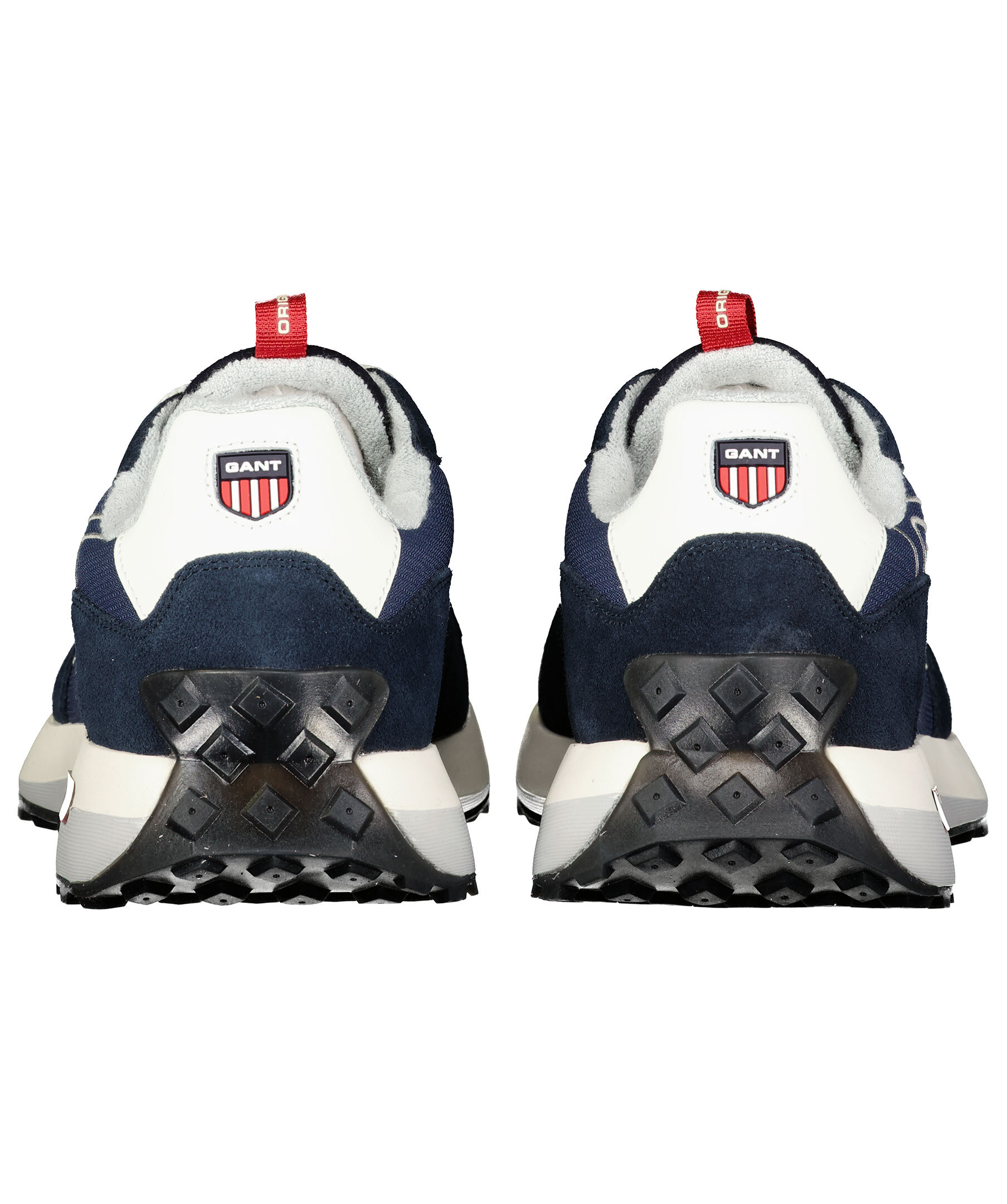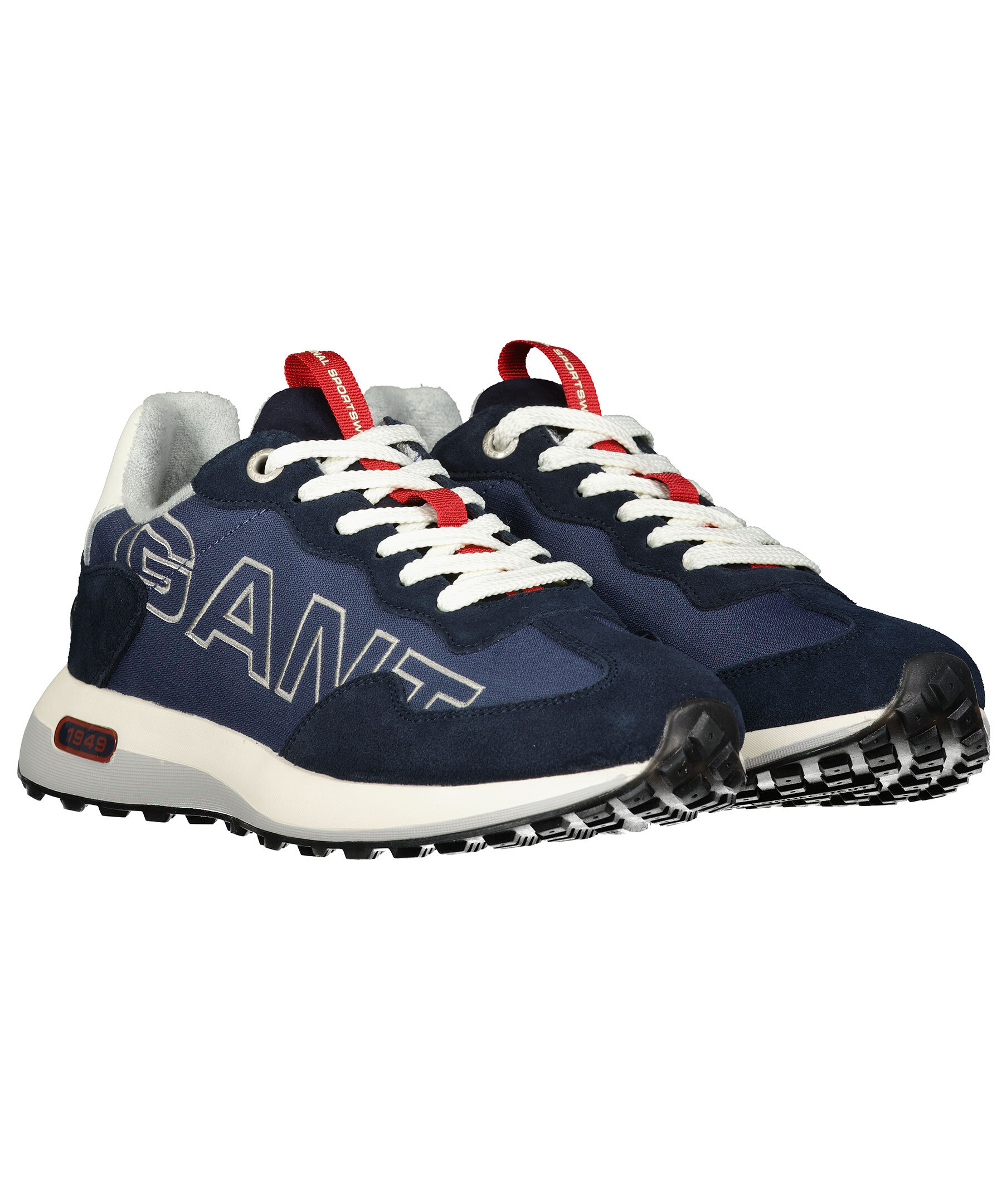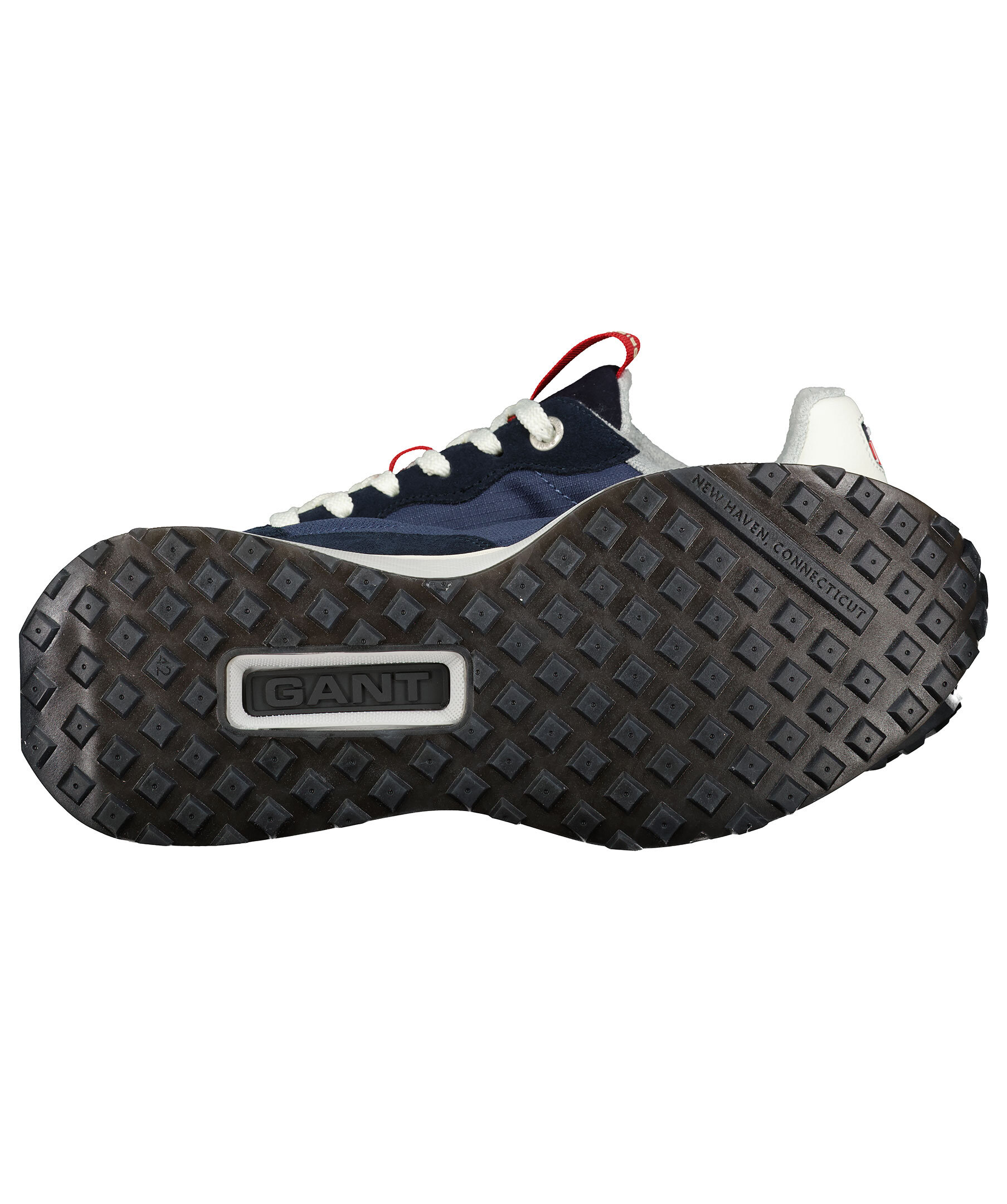 Mörkblå sneakers i textil från Gant med mockadetaljer. Silverfärgad broderad logotyp på sidan och tryckt logotyp på plös samt logotyp i gummi på hälen. Vit sula och grå sula.