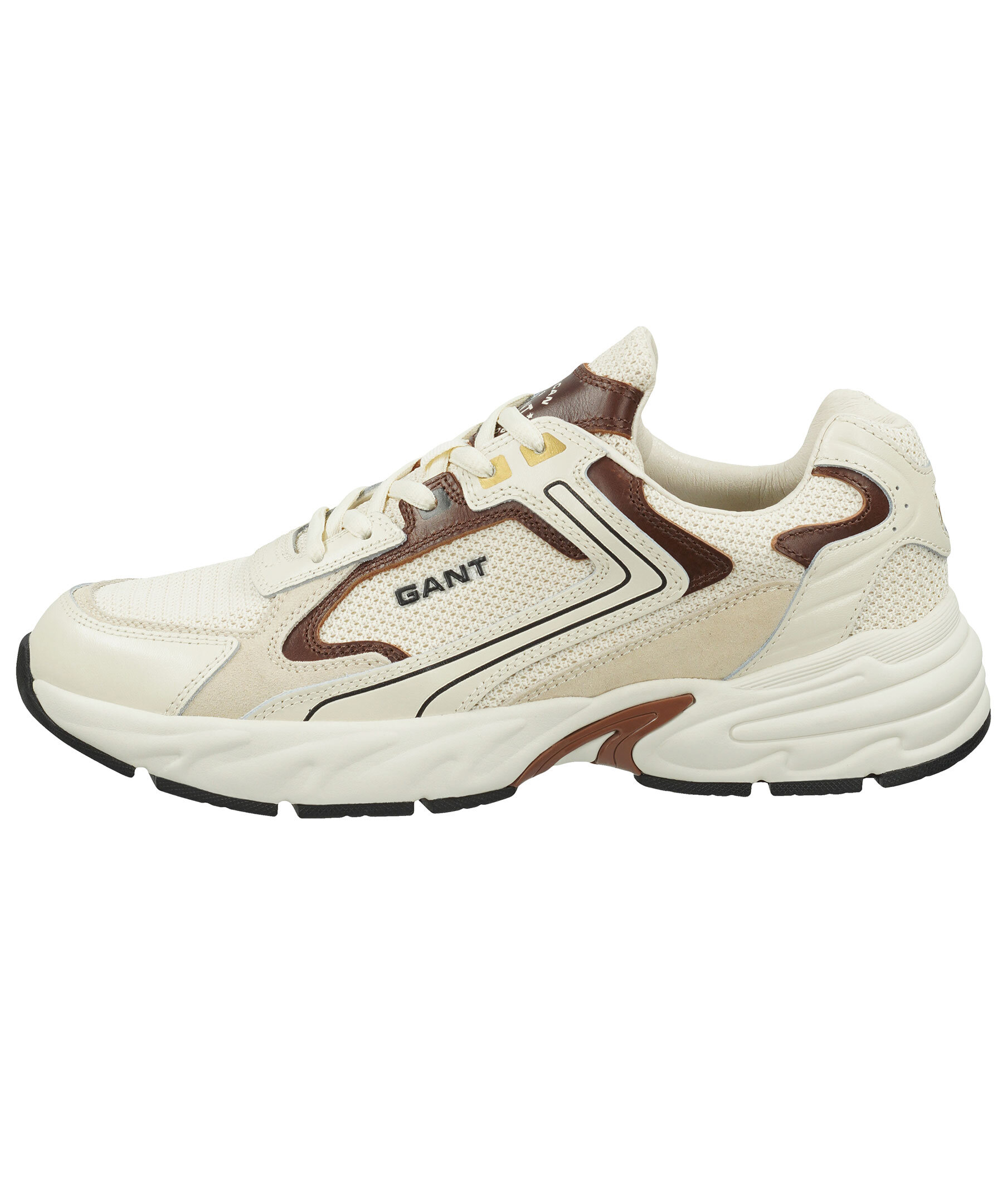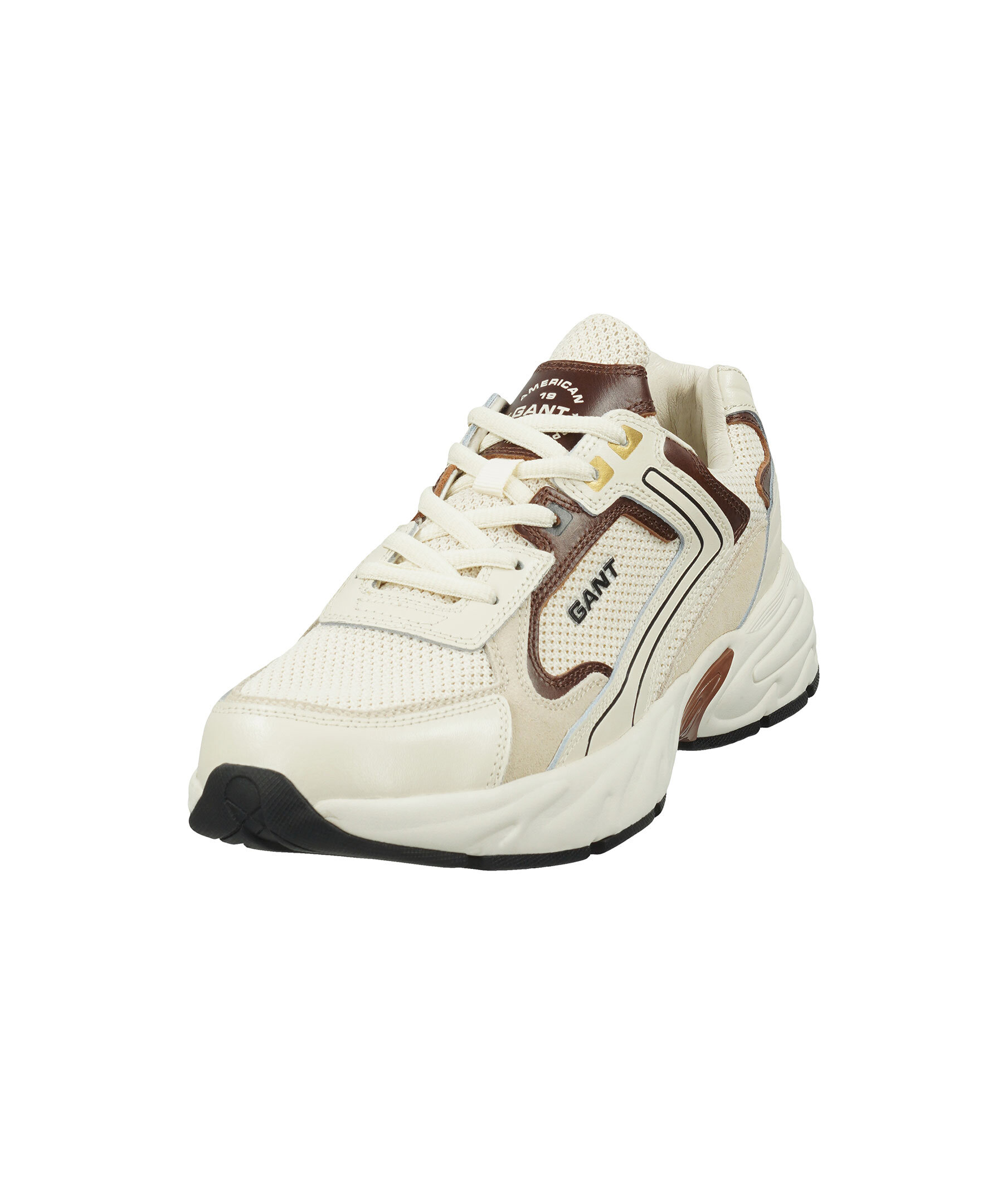 Krämvita sneakers med bruna detaljer från Gant. Tillverkade i mjuk mocka och ripstop-nylon. Grov sula i gummi. Ögla med logotyp på plösen, logotyp på hälen samt logotyp i silverfärg på yttersidan. Runda skosnören.