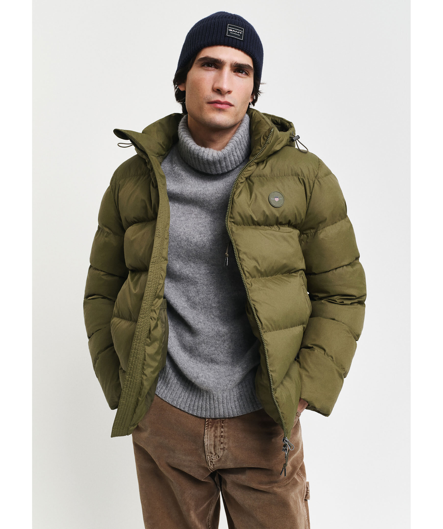 Olivgrön pufferjacka från Gant. Jackan har en vattenavisande finish, avtagbar huva, två framfickor med blixtlås. Jackan stängs med dragkedja och har en logga i silicon på vänster bröst. Tillverkad av 100% återvunnen polyamid.